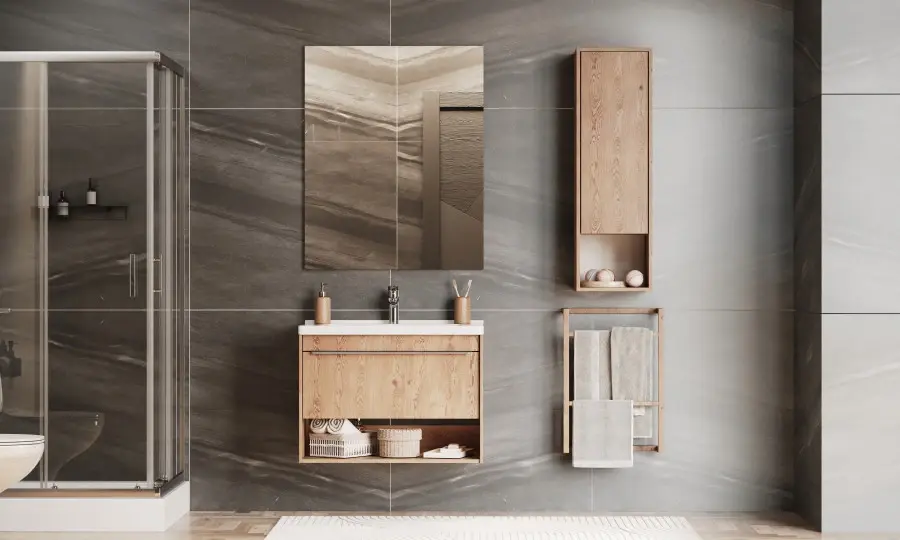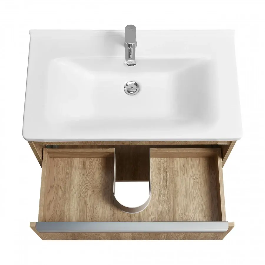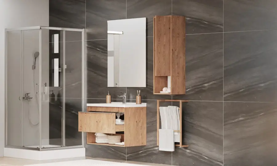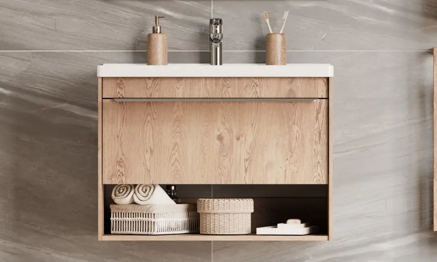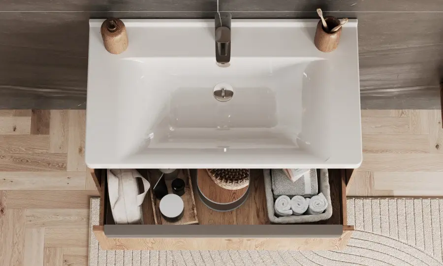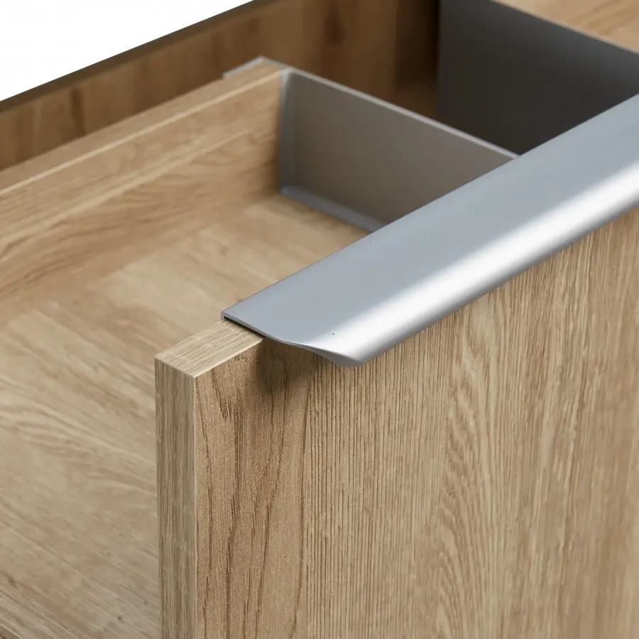 Тумбы для ванной комнаты коллекции Хоуп — это идеальное сочетание простоты линий и функциональности, которое преобразит ваше пространство. Каждая тумба в этой коллекции создана с вниманием к деталям и стремлением к гармонии, что делает их не только практичными, но и эстетически привлекательными. Элегантные линии и современный дизайн подчеркивают утонченность интерьера, а использование влагостойкой ЛДСП гарантирует долговечность и простоту в уходе. Удобная ручка добавляет нотку изысканности, а открытая ниша предоставляет возможность организовать пространство так, как вам удобно — будь то размещение любимых аксессуаров или необходимых принадлежностей. Корпус и фасад выполнены из влагостойкой ЛДСП в светло-коричневом цвете. Ручка в данной коллекции в трендовом цвете gun metal (вороненый металл). Изготовленная из алюминия, она не только привлекает внимание своим эстетичным дизайном, но и имеет надежный и удобный хват. Тумбы коллекции Хоуп за счет своих цветовых решений в белом, древесном и светло-зеленом исполнении идеально впишутся в любой стиль ванной комнаты, от минимализма до классики, создавая атмосферу уюта и комфорта. Они не только помогут поддерживать порядок, но и станут ярким акцентом вашего интерьера. Направляющие полного выдвижения скрытого монтажа с доводчиком позволят использовать весь функционал ящиков бесшумно и с комфортом, а открытая ниша дает возможность убирать туда необходимы принадлежности, чтобы они всегда были под рукой. Высота полезного пространства - 160 мм