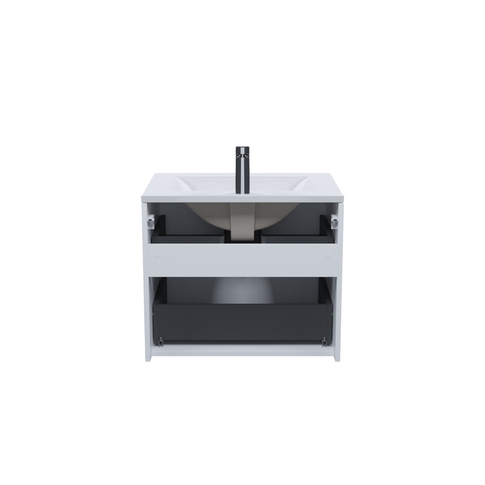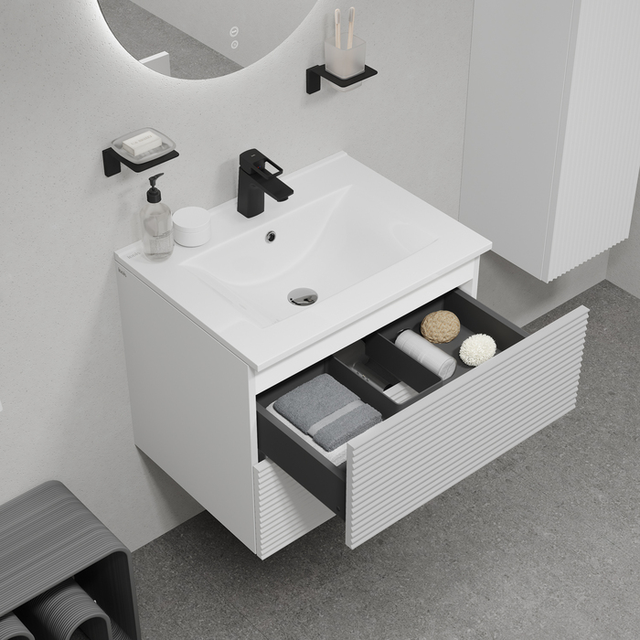 Компактная подвесная тумба для ванной комнаты Bild с умывальником и выдвижными ящиками – красивый дизайн с трендовой горизонтальной фрезеровкой в сочетании с универсальным белым цветом, удобством и практичностью. • Материал фасадов – МДФ с покрытием ПВХ-пленкой. Она разработана для использования в помещениях с высокой влажностью и сохранит первоначальный вид мебели надолго (при должном уходе). Материал боковин – МДФ. • Керамический умывальник с высоким бортом и большой вместительной чашей в комплекте. Удобен для гигиенических и хозяйственных нужд. • Два ящика с направляющими скрытого монтажа с доводчиком Hettich. Фурнитура рассчитана на более 10 лет исправной работы. • Современный механизм открытия Push-to-Open – открывается нажатием на фасад. • В комплекте крепеж для монтажа тумбы. • Сифон приобретается отдельно. Гарантия на мебель IDDIS® – 3 года, на умывальник – 5 лет