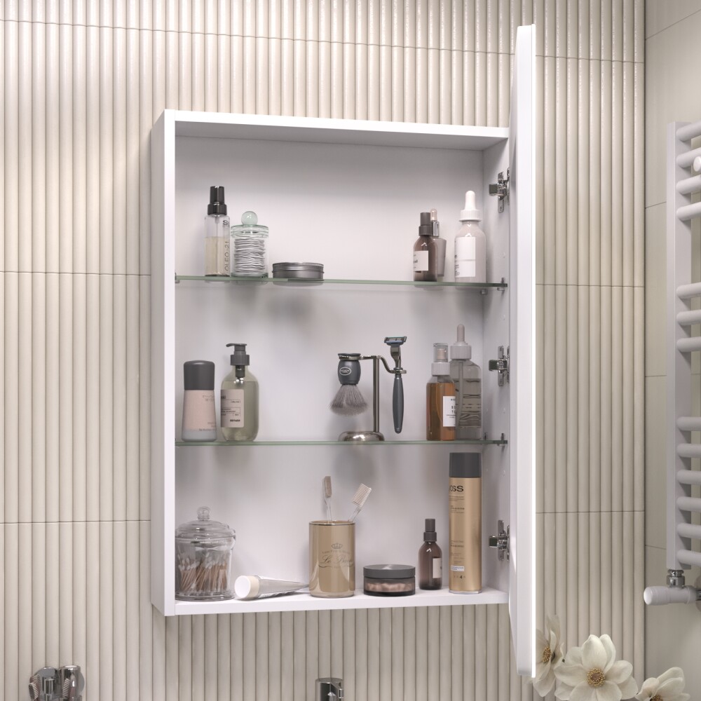 1 дверца, петли с механизмом доводчика, 2 стеклянных полки, светодиодная подсветка по периметру, бесконтактное включение (на взмах), функция антизапотевания