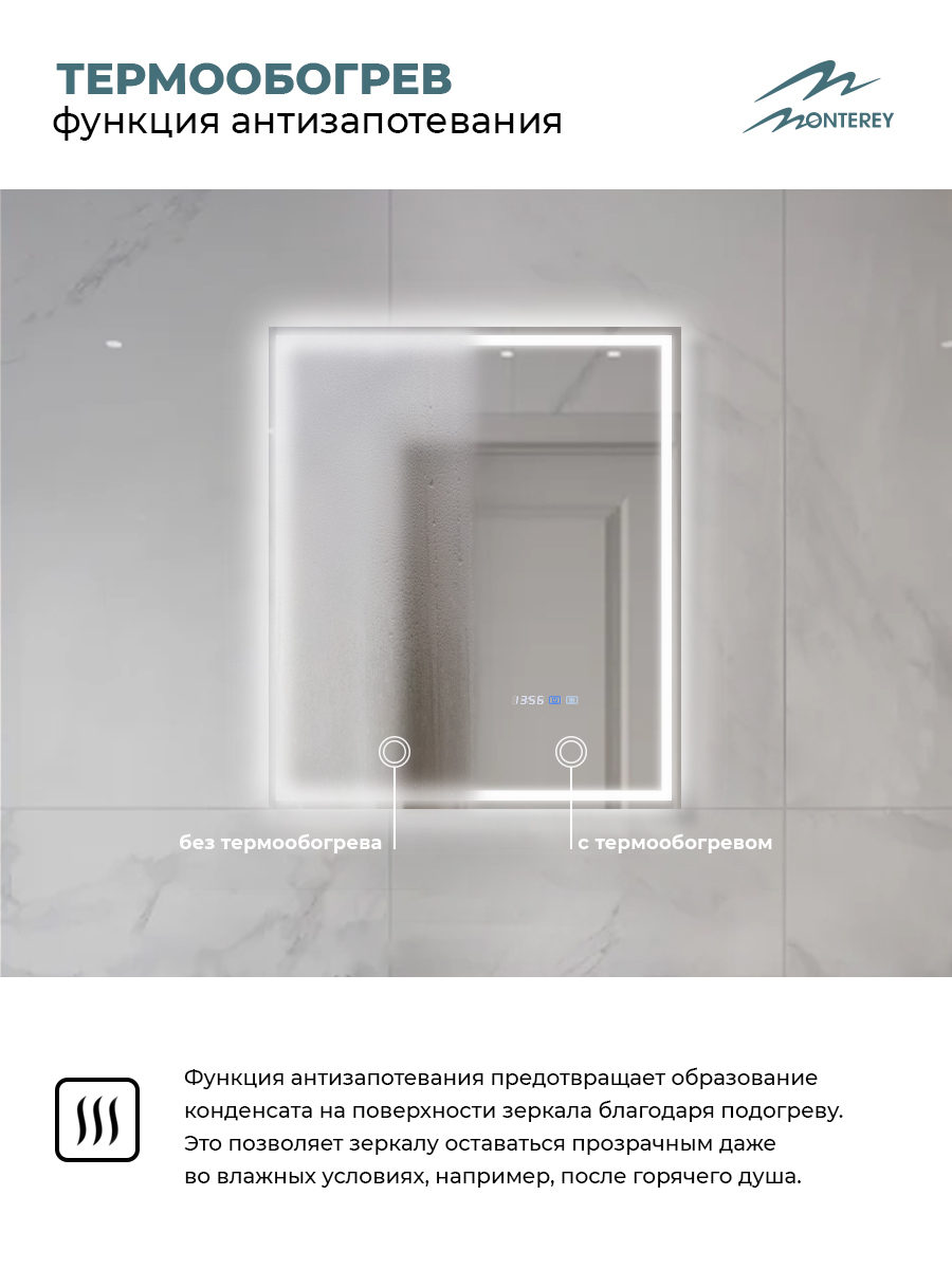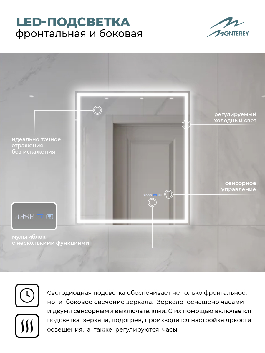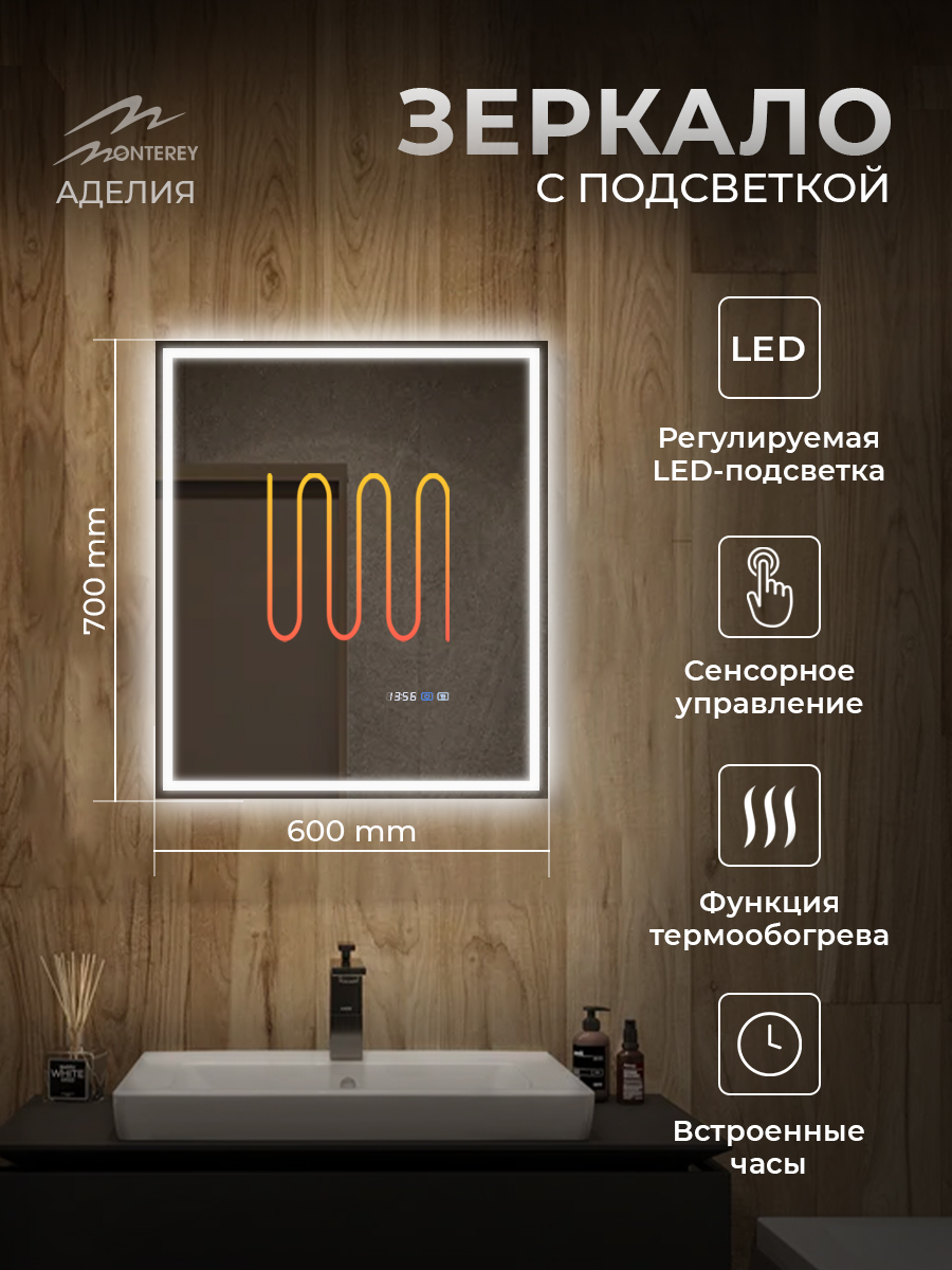 Стильное и функциональное зеркало в ванную Monterey Аделия 60x70 с LED-подсветкой холодного света и функцией подогрева. Это современное зеркало с антизапотеванием идеально подойдет для вашей ванной комнаты. Уникальная особенность модели — боковая и фронтальная LED подсветка благодаря светопропускному пластику корпуса, создающая равномерное освещение. Сенсорное управление на касание позволяет легко управлять подсветкой, регулировать яркость через диммер, включать функцию термообогрева и настраивать часы. Больше не нужно протирать зеркало после душа! Зеркальное полотно без рамы с подвесным монтажом выглядит минималистично и элегантно. Доступно в размерах 60, 70, 80 и 100 см.