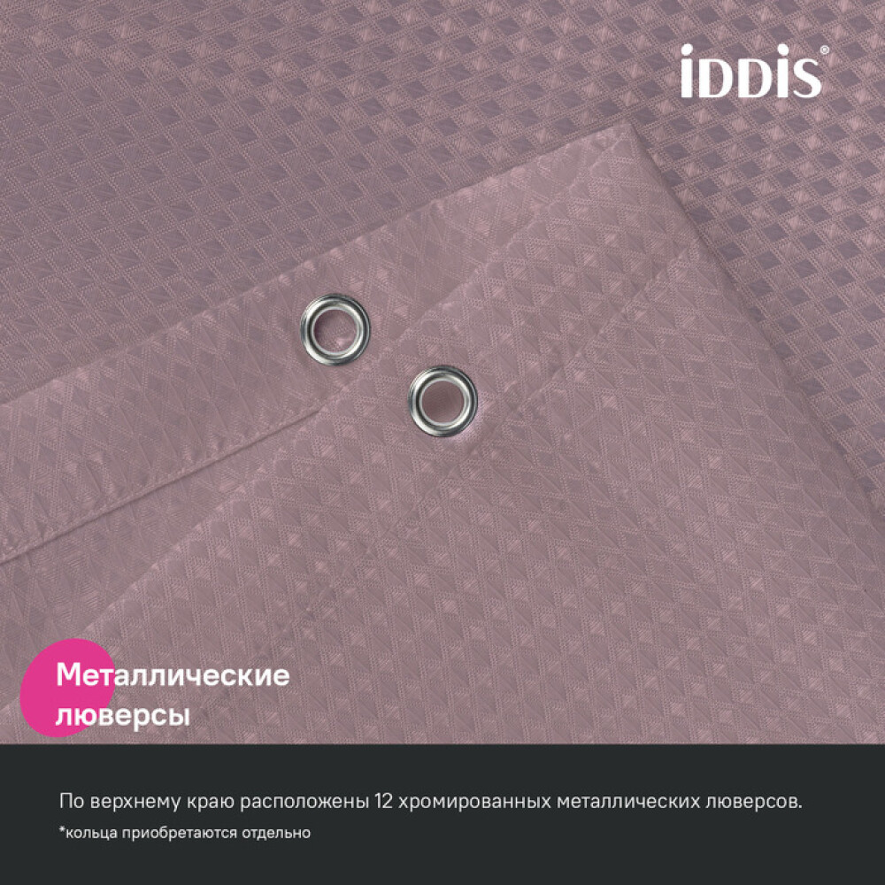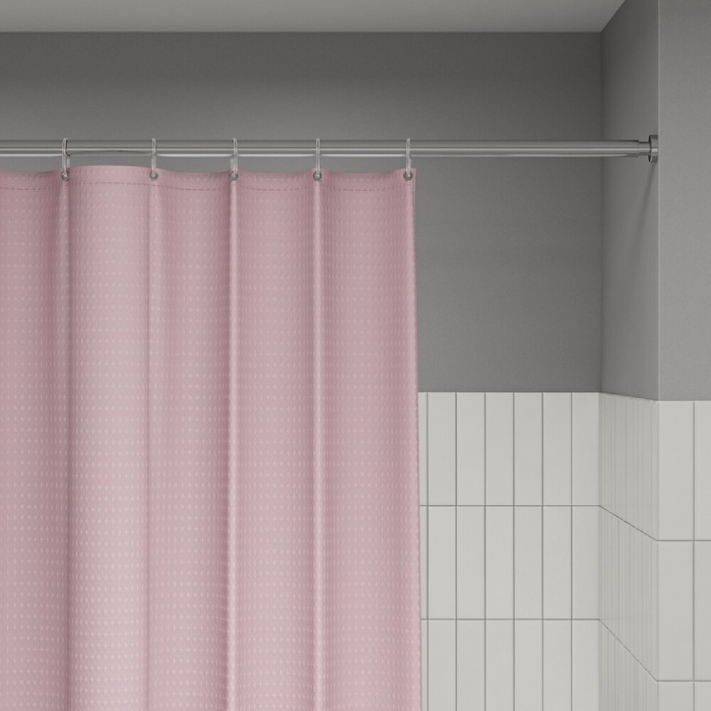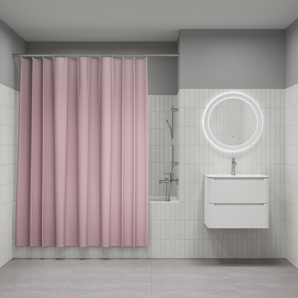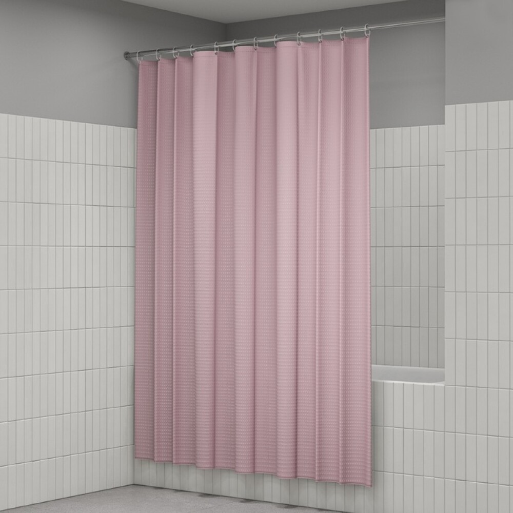 Однотонная текстильная штора для ванной розового цвета с фактурным рисунком «вафля». Напоминает классические текстильные шторы и соответствует актуальному тренду оформления ванной как уютной жилой комнаты.