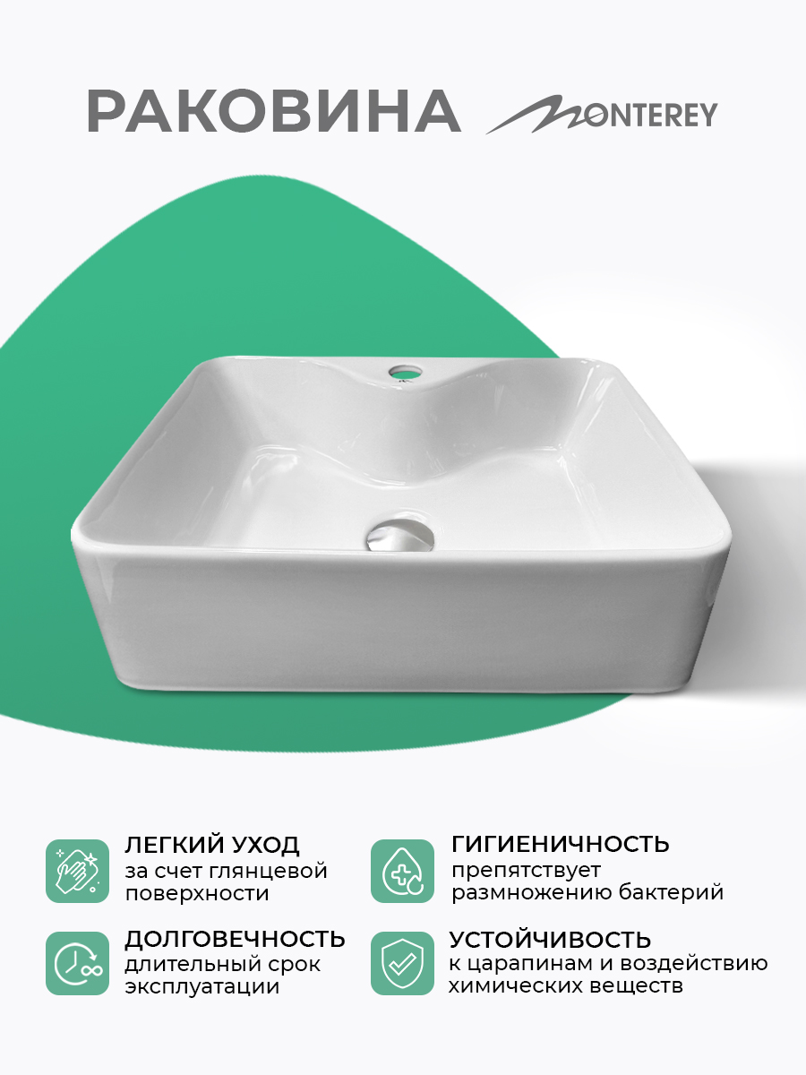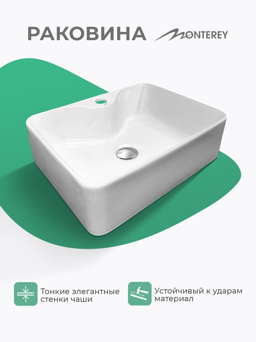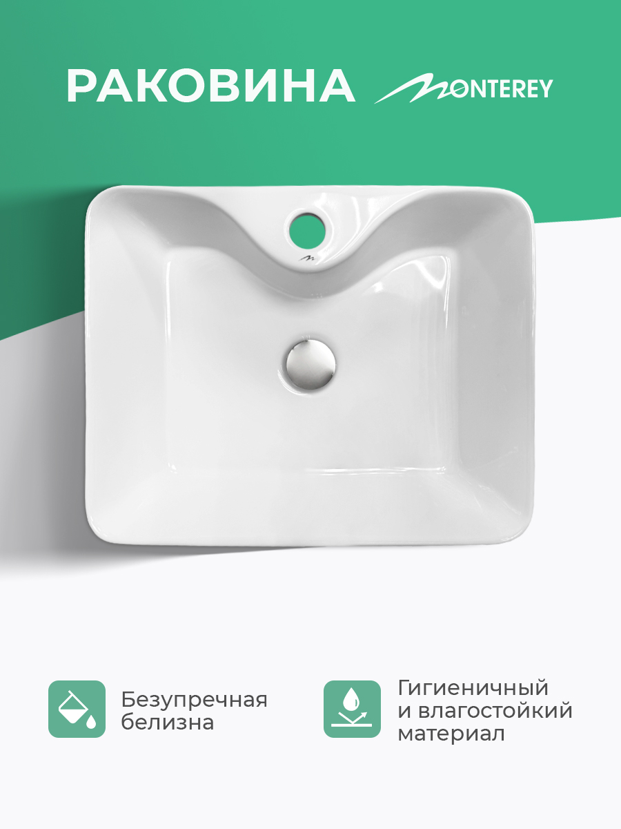 Накладная раковина 50 с отверстием для смесителя MONTEREY ZT-8099A (49х38х13 см) выполнена из высококачественного сантехнического фарфора, покрытого глазурью, что делает раковину более долговечной, раковина сохраняет белоснежный вид как можно дольше и менее подвержена загрязнениям. Раковина прямоугольной формы с отверстием слива, без перелива. Донный клапан приобретается отдельно. Оптимальная глубина чаши 130 мм, обеспечивает комфортное использование без брызг при умывании и мытье рук. Прямоугольная раковина-чаша – это не просто элемент сантехники, а важный дизайнерский акцент, который может преобразить любую ванную комнату
