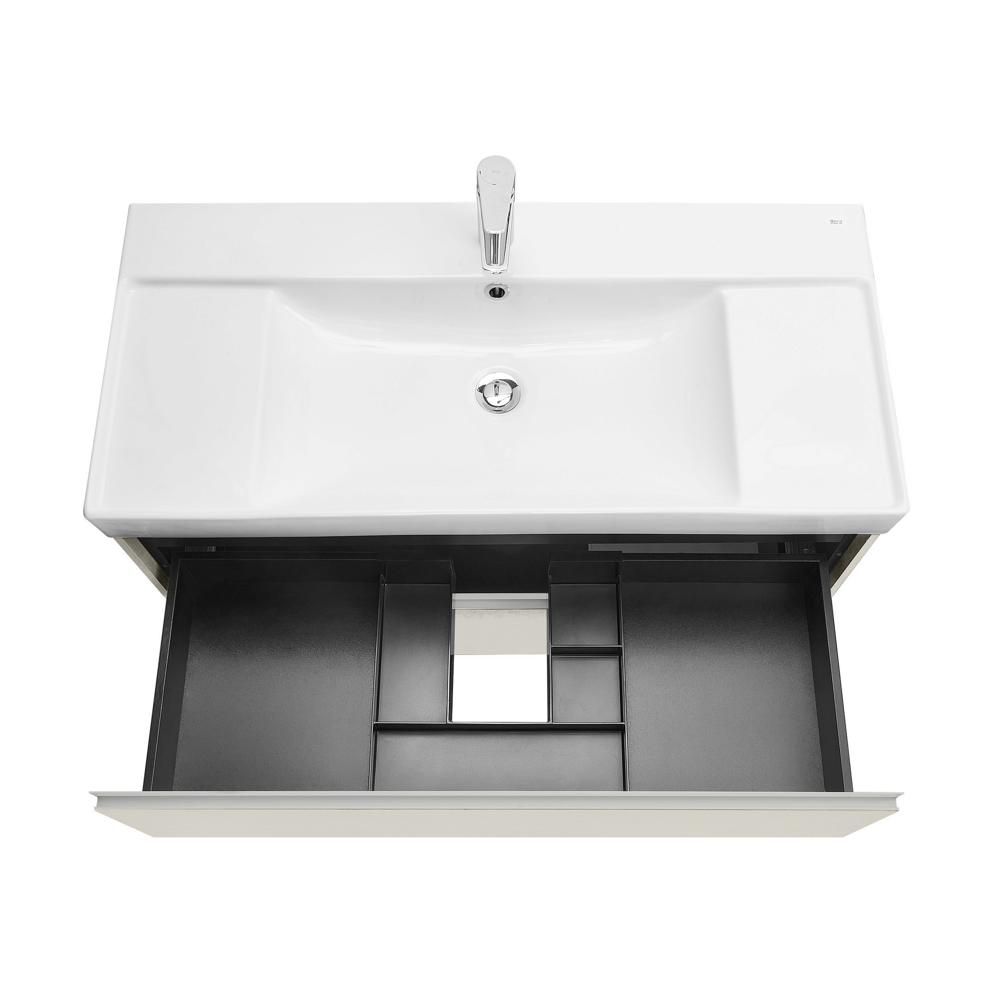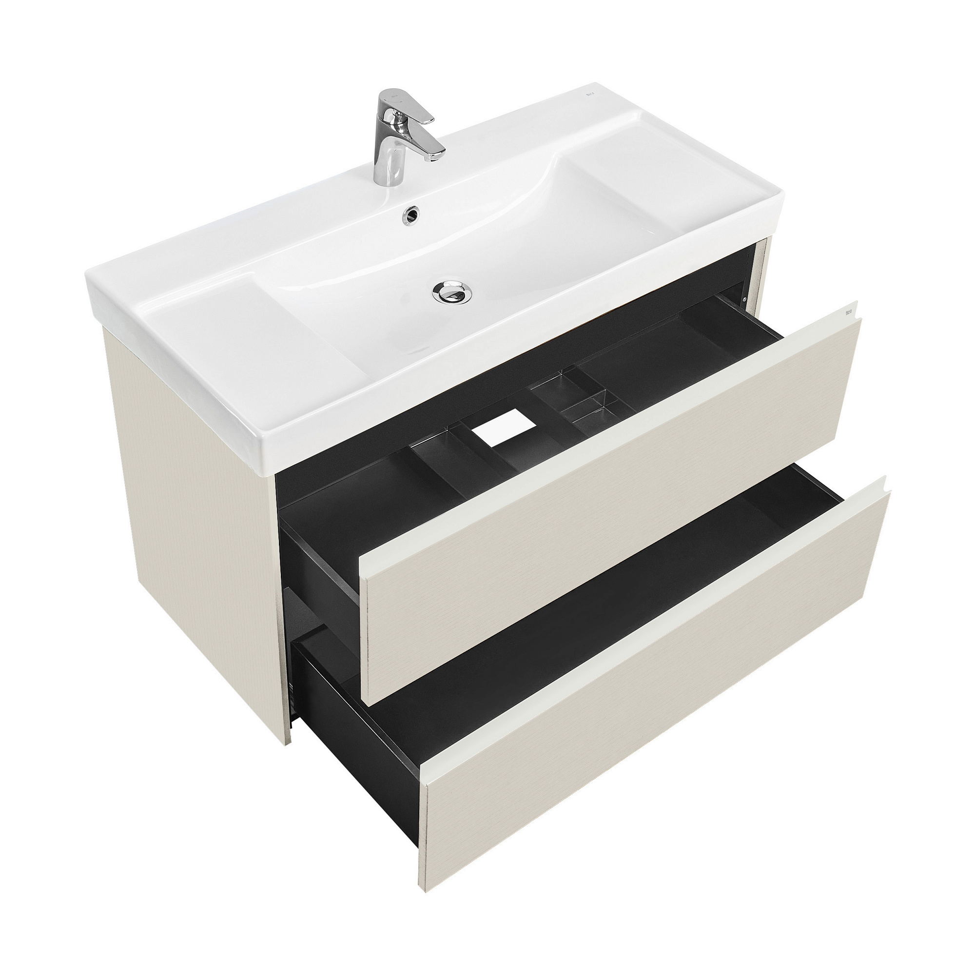 Тумба под раковину - 1 шт., Ящики - 2 шт, направляющие скрытого монтажа с доводом - 2 шт, регулируемые навесы - 2 шт, организация под сифон - шт.