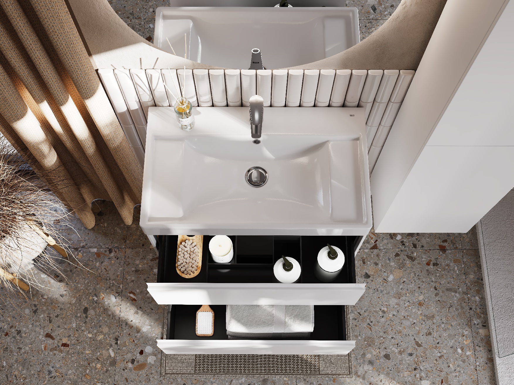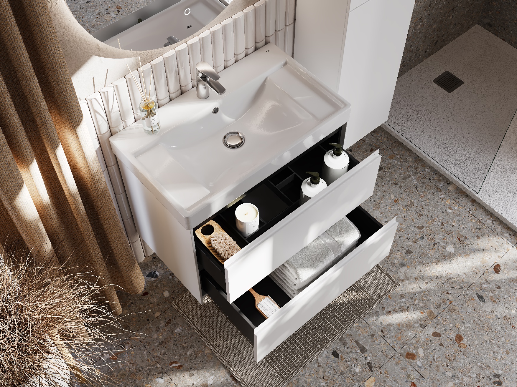 Описание коллекции Погрузитесь в атмосферу Средиземноморья в вашей ванной комнате вместе с коллекцией Ona. Влагостойкие материалы и пленки от европейских производителей – это красота, долговечность и безупречный вид мебели на долгие годы. Описание товара Модули Ona обладают следующими характеристиками и преимуществами. Удобная металлическая профильная ручка во всю ширину модуля обеспечивает легкость открывания ящиков и защиту фасадов от влаги, ударов и износа. В обоих ящиках находятся противоскользящие коврики, а верхний ящик снабжен также встроенной организацией пространства – эстетика и идеальный порядок в ванной комнате. Комфортное и долговременное использование мебели гарантировано благодаря направляющим Hettich полного выдвижения и плавного открывания и закрывания, протестированных на 60 000 циклов. Навесы входят в комплект и выдерживают нагрузку 100 кг, а также обладают функцией регулировки, которая позволяет скомпенсировать неровность стен и установить мебель ровно. Модули Ona комплектуются раковинами Ona из долговечного композитного материала