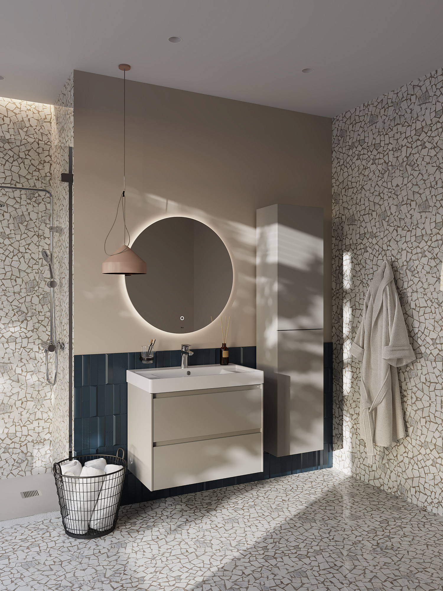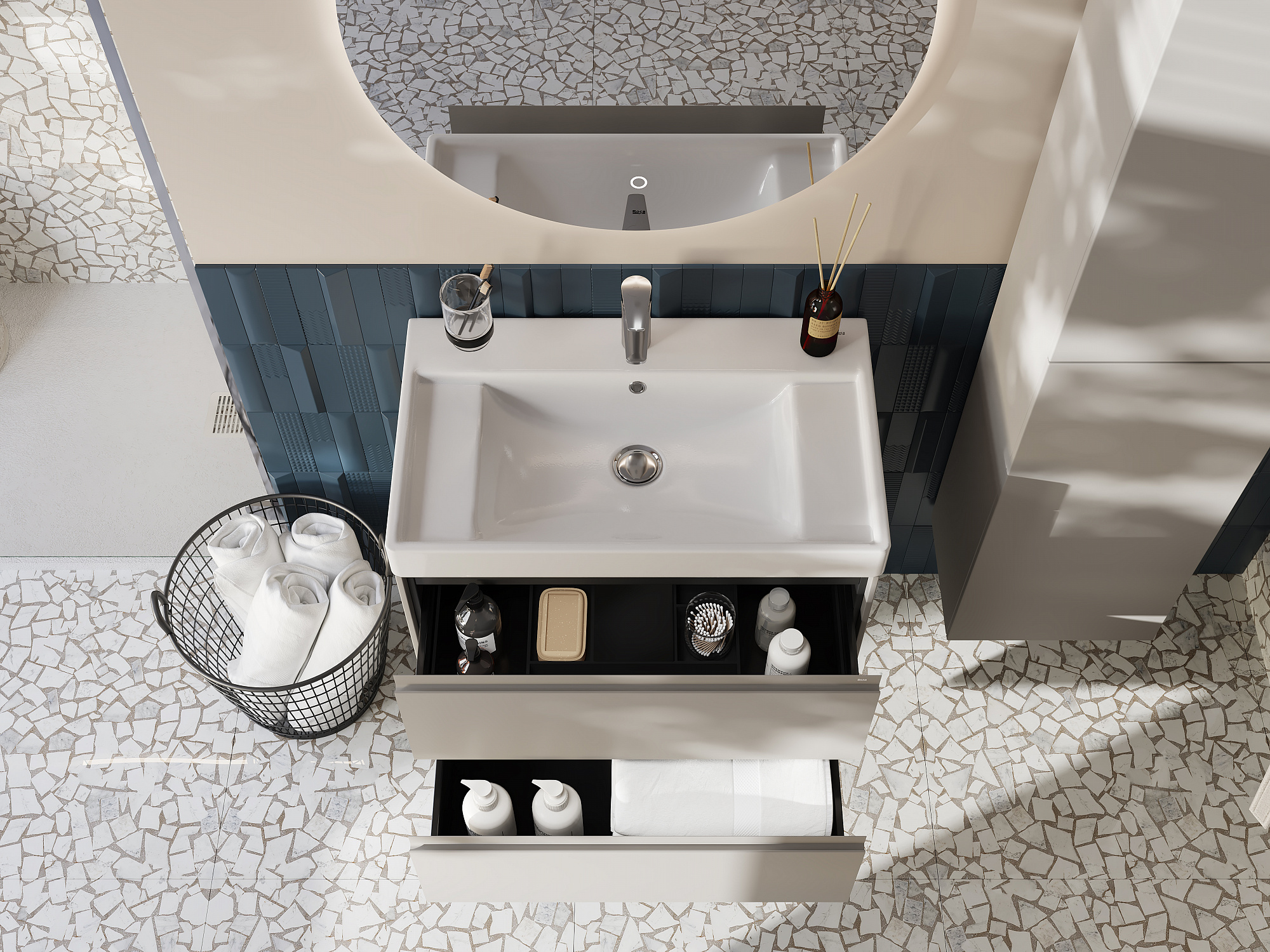 Описание коллекции Погрузитесь в атмосферу Средиземноморья в вашей ванной комнате вместе с коллекцией Ona. Влагостойкие материалы и пленки от европейских производителей – это красота, долговечность и безупречный вид мебели на долгие годы. Описание товара Модули Ona обладают следующими характеристиками и преимуществами. Удобная металлическая профильная ручка во всю ширину модуля обеспечивает легкость открывания ящиков и защиту фасадов от влаги, ударов и износа. В обоих ящиках находятся противоскользящие коврики, а верхний ящик снабжен также встроенной организацией пространства – эстетика и идеальный порядок в ванной комнате. Комфортное и долговременное использование мебели гарантировано благодаря направляющим Hettich полного выдвижения и плавного открывания и закрывания, протестированных на 60 000 циклов. Навесы входят в комплект и выдерживают нагрузку 100 кг, а также обладают функцией регулировки, которая позволяет скомпенсировать неровность стен и установить мебель ровно. Модули Ona комплектуются раковинами Ona из долговечного композитного материала
