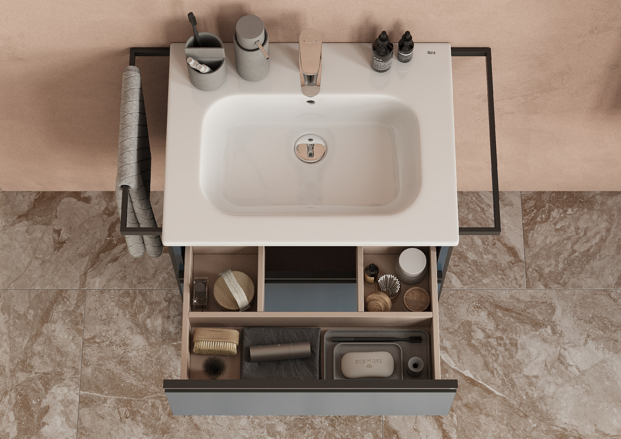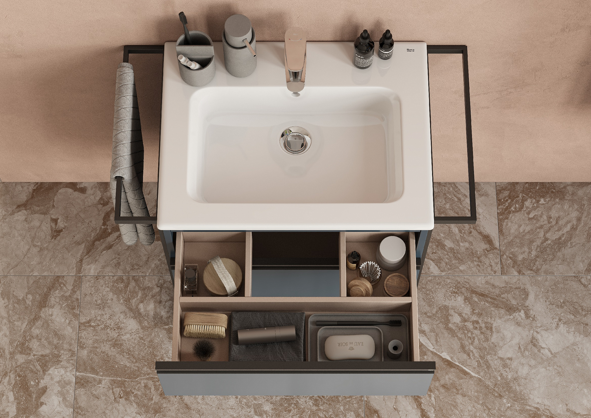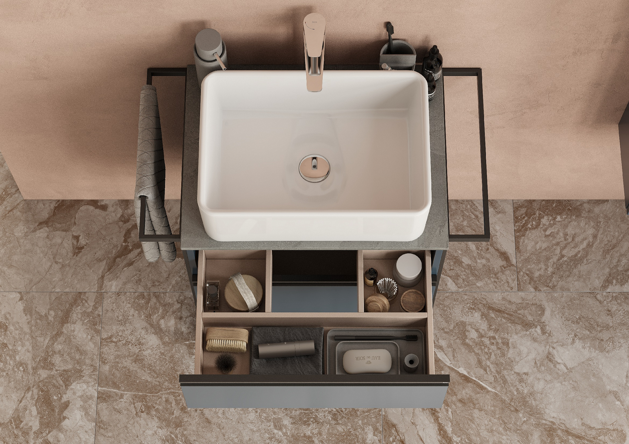 Модуль под раковину Domi с черной матовой металлической ручкой во всю ширину фасада и направляющими с функцией soft-close. Нижняя часть ручки обработана под углом, что предотвращает скопление воды и пыли. Ручка защищает фасады модуля от попадания капель воды с раковины, а также защищает углы модуля от ударов и износа. Модуль выполнен из влагостойкой ЛДСП в трендовом цвете. Внутренняя отделка ящиков выполнена в цвете бежевый текстиль, приятна на ощупь и предотвращает скольжение предметов. Пространство верхнего ящика разделено на три части, что позволяет хранить предметы для ванной комнаты в идеальном порядке. По желанию модуль Domi можно комплектовать черными матовыми опорами, которые представлены в двух вариантах: с полотенцедержателем и без