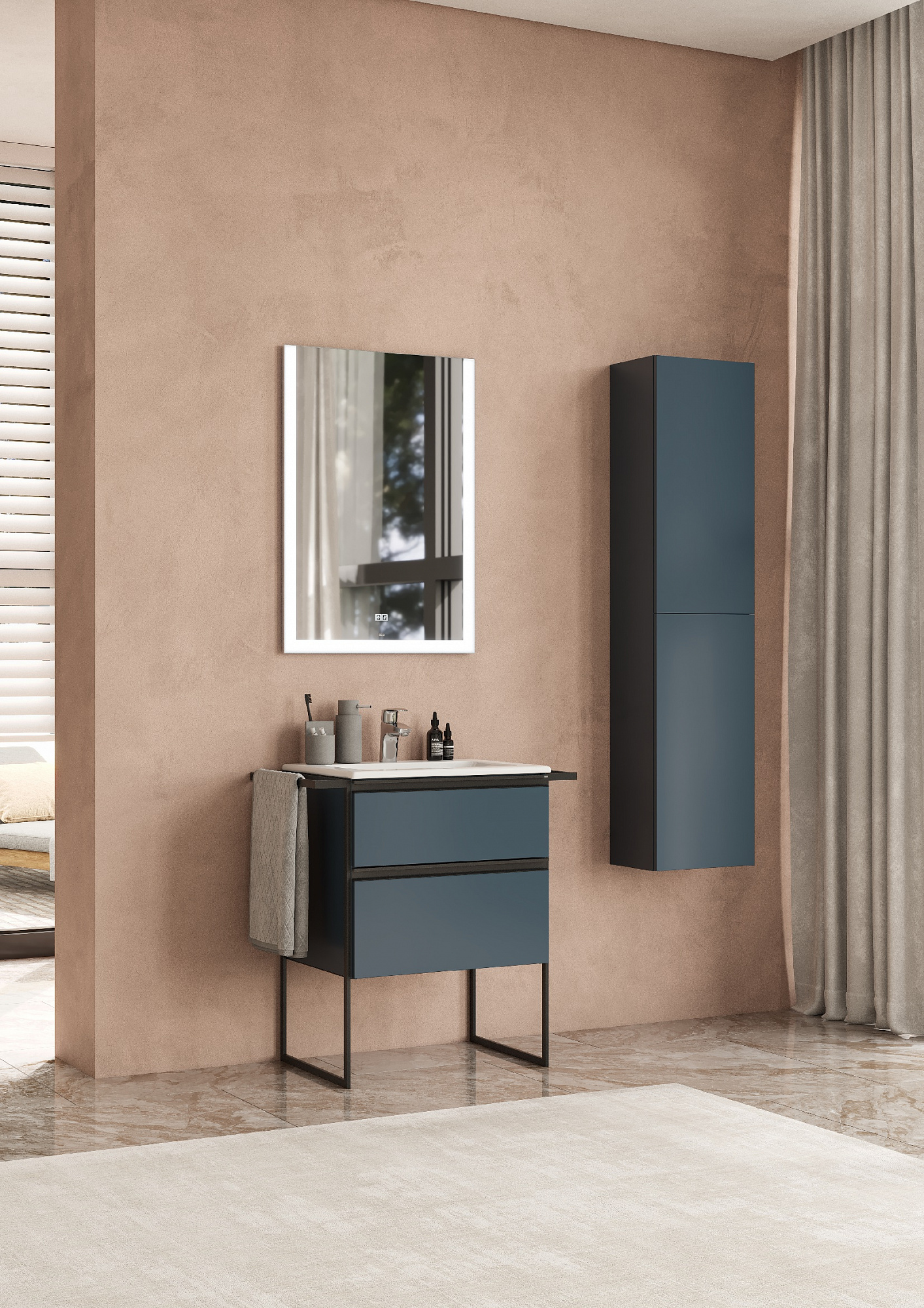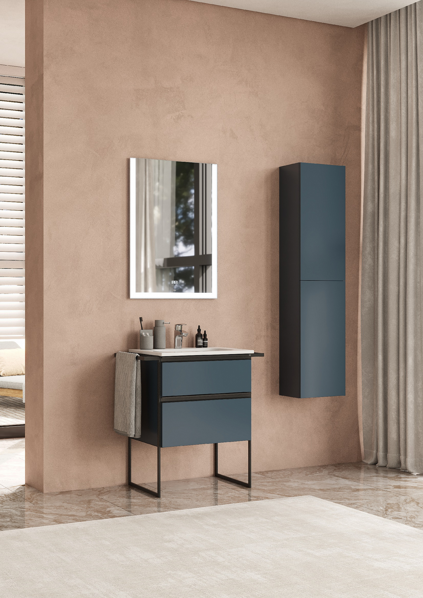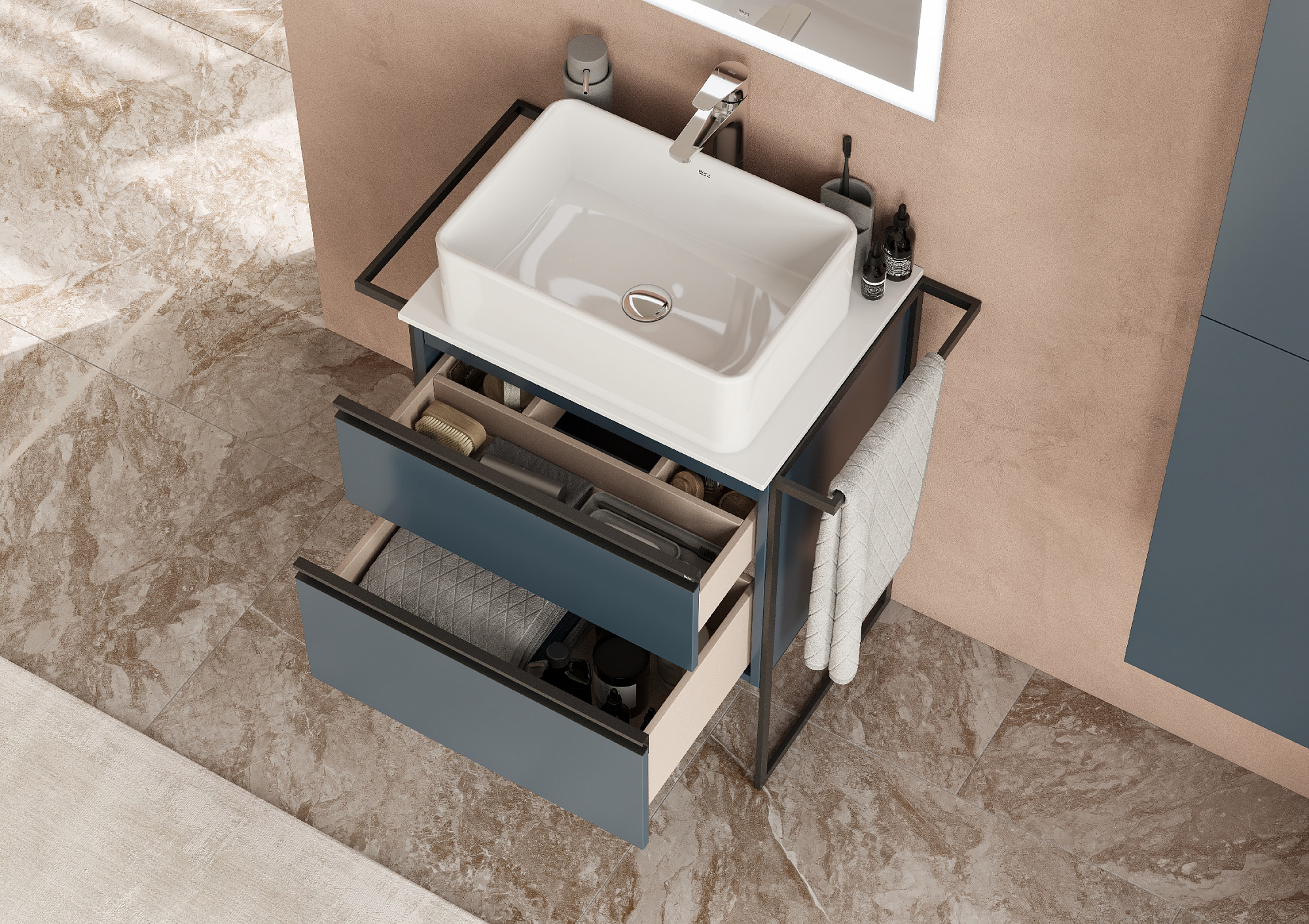 Модуль под раковину Domi с черной матовой металлической ручкой во всю ширину фасада и направляющими с функцией soft-close. Нижняя часть ручки обработана под углом, что предотвращает скопление воды и пыли. Ручка защищает фасады модуля от попадания капель воды с раковины, а также защищает углы модуля от ударов и износа. Модуль выполнен из влагостойкой ЛДСП в трендовом цвете. Внутренняя отделка ящиков выполнена в цвете бежевый текстиль, приятна на ощупь и предотвращает скольжение предметов. Пространство верхнего ящика разделено на три части, что позволяет хранить предметы для ванной комнаты в идеальном порядке. По желанию модуль Domi можно комплектовать черными матовыми опорами, которые представлены в двух вариантах: с полотенцедержателем и без