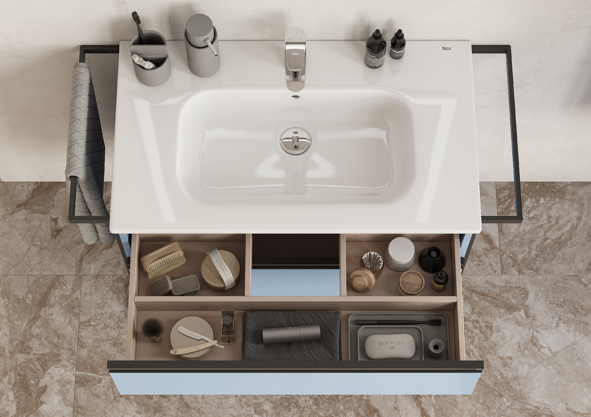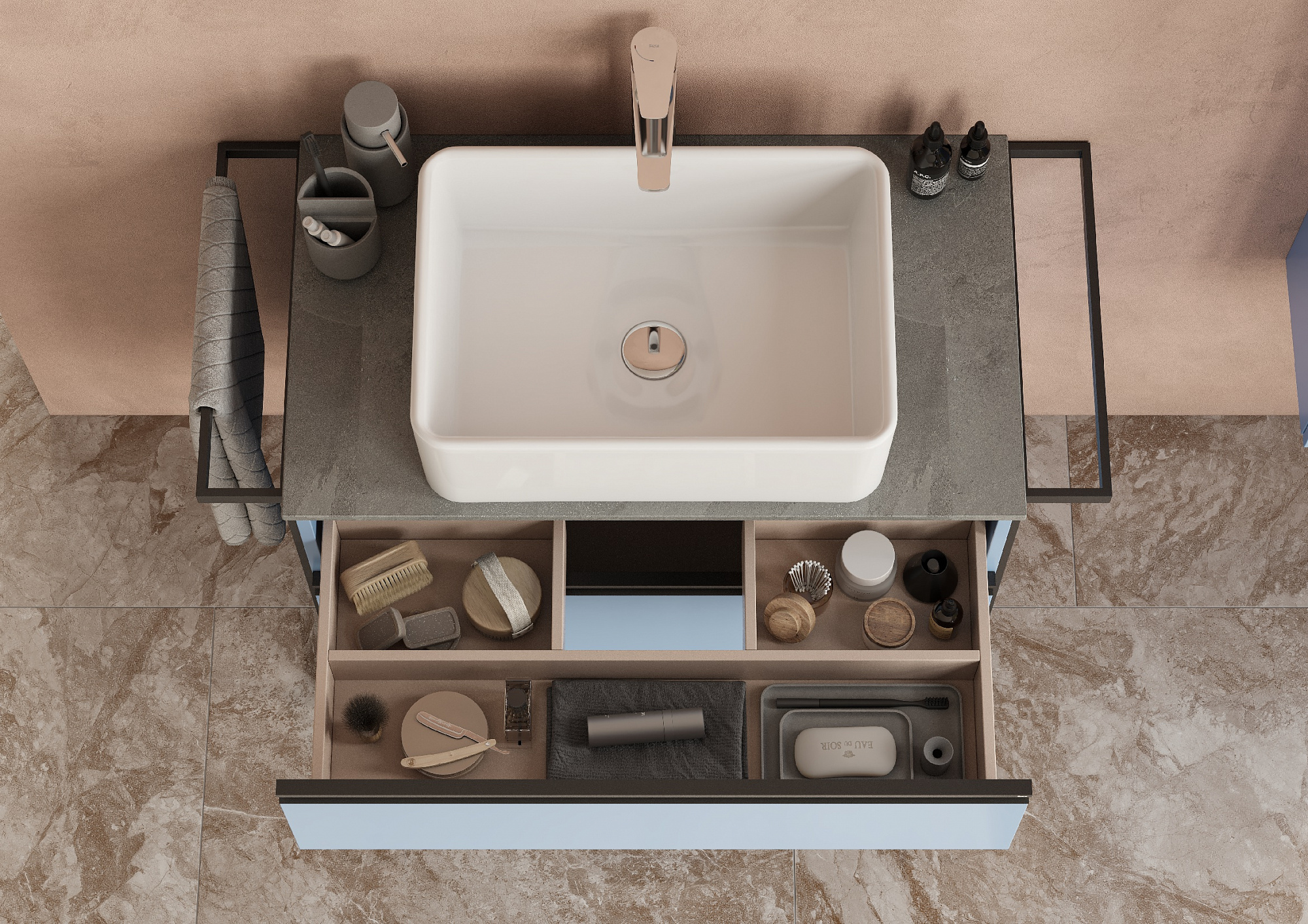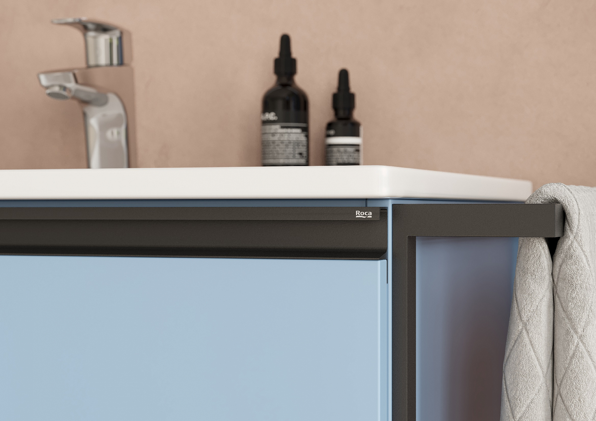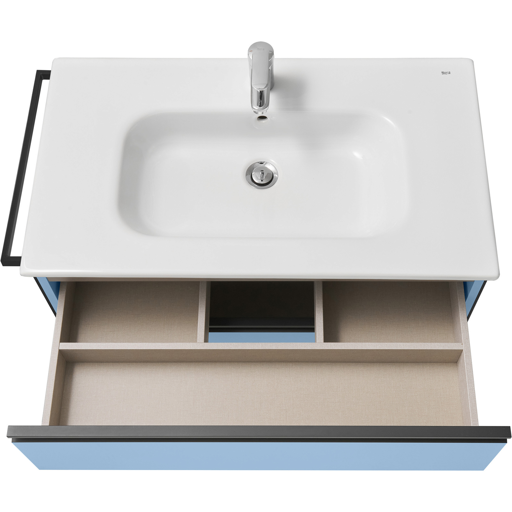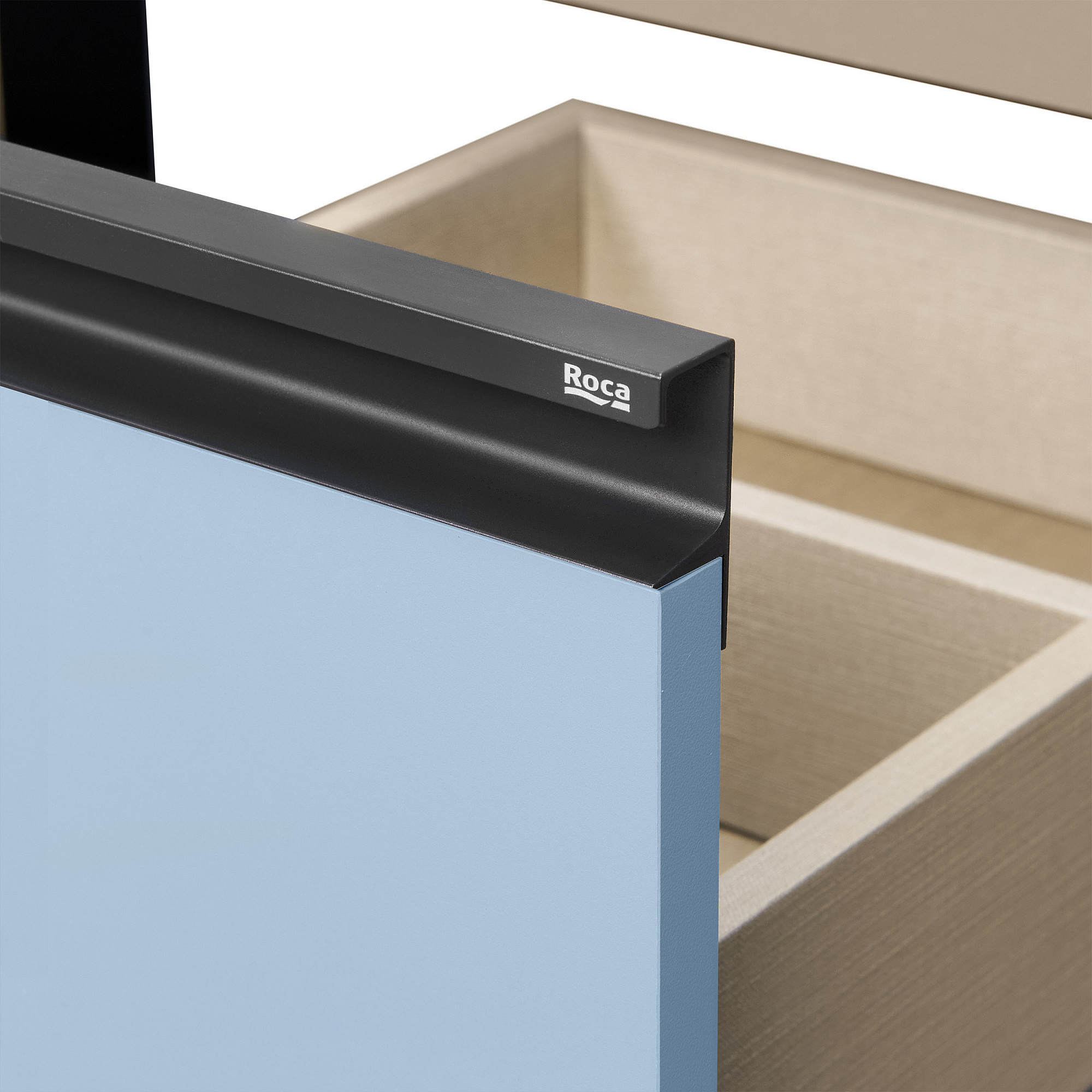 Модуль под раковину Domi с черной матовой металлической ручкой во всю ширину фасада и направляющими с функцией soft-close. Нижняя часть ручки обработана под углом, что предотвращает скопление воды и пыли. Ручка защищает фасады модуля от попадания капель воды с раковины, а также защищает углы модуля от ударов и износа. Модуль выполнен из влагостойкой ЛДСП в трендовом цвете. Внутренняя отделка ящиков выполнена в цвете бежевый текстиль, приятна на ощупь и предотвращает скольжение предметов. Пространство верхнего ящика разделено на три части, что позволяет хранить предметы для ванной комнаты в идеальном порядке. По желанию модуль Domi можно комплектовать черными матовыми опорами, которые представлены в двух вариантах: с полотенцедержателем и без