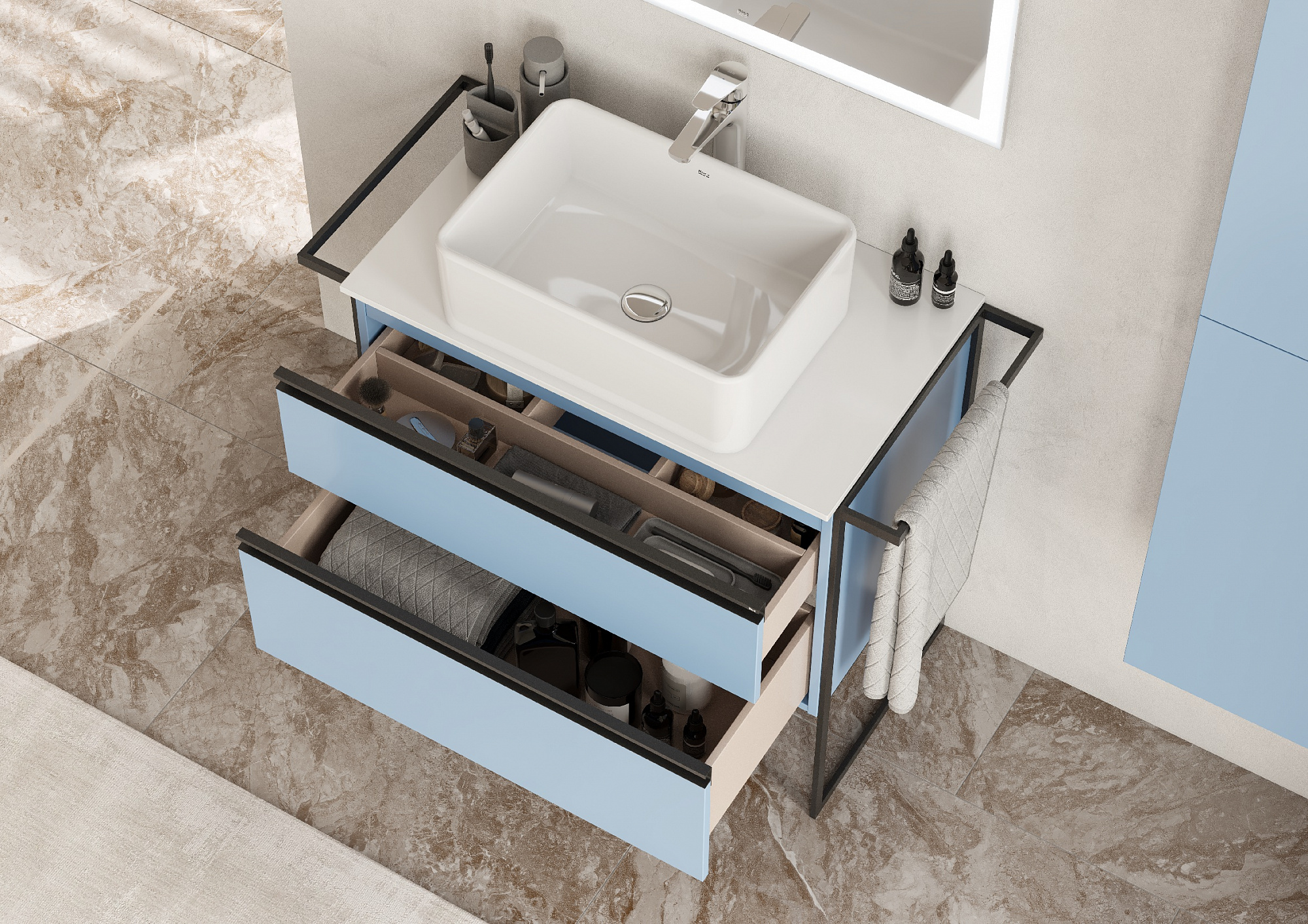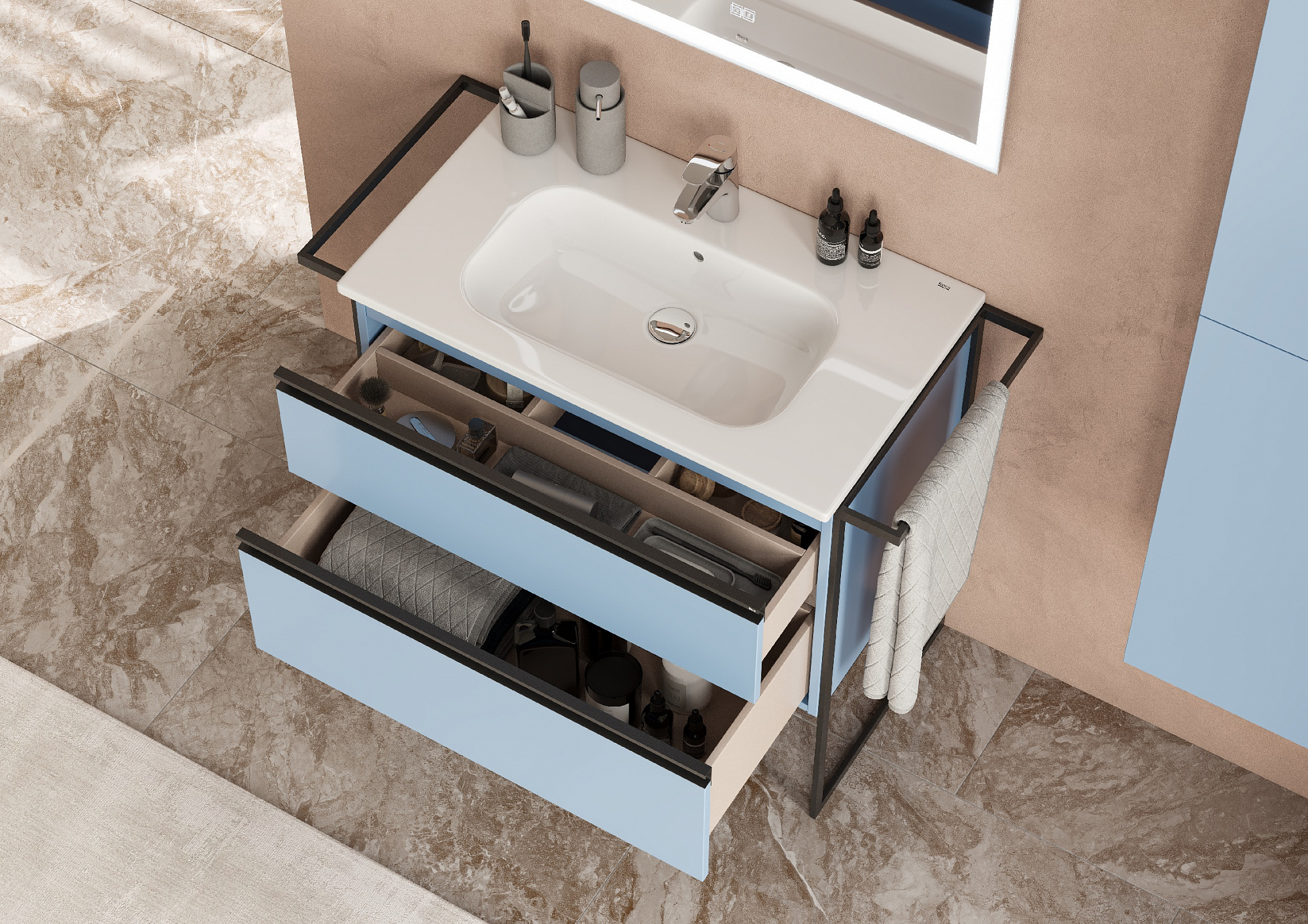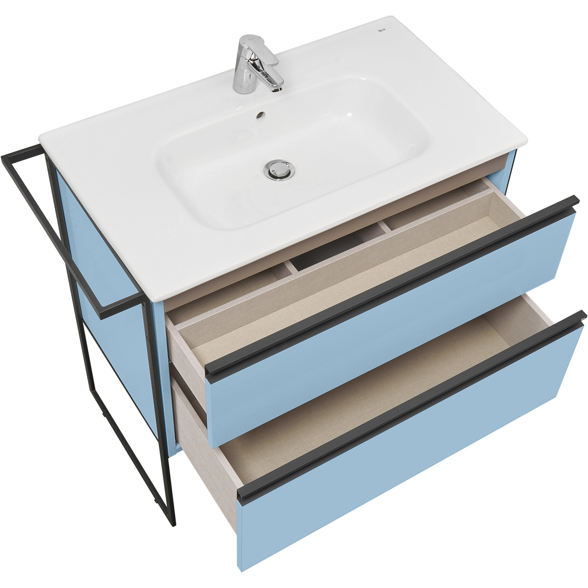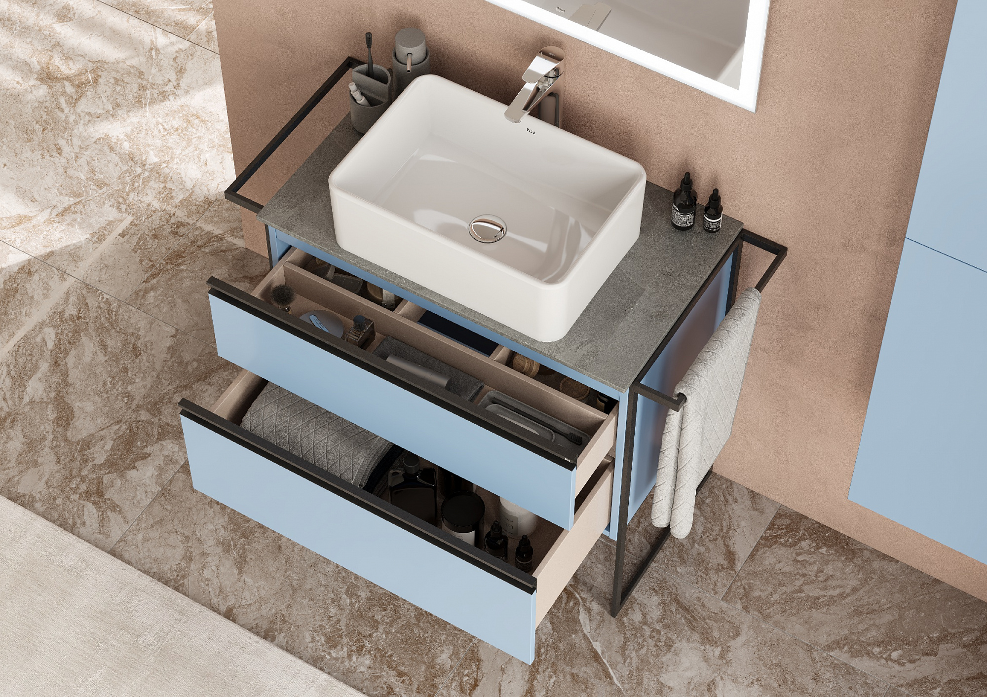 Модуль под раковину Domi с черной матовой металлической ручкой во всю ширину фасада и направляющими с функцией soft-close. Нижняя часть ручки обработана под углом, что предотвращает скопление воды и пыли. Ручка защищает фасады модуля от попадания капель воды с раковины, а также защищает углы модуля от ударов и износа. Модуль выполнен из влагостойкой ЛДСП в трендовом цвете. Внутренняя отделка ящиков выполнена в цвете бежевый текстиль, приятна на ощупь и предотвращает скольжение предметов. Пространство верхнего ящика разделено на три части, что позволяет хранить предметы для ванной комнаты в идеальном порядке. По желанию модуль Domi можно комплектовать черными матовыми опорами, которые представлены в двух вариантах: с полотенцедержателем и без