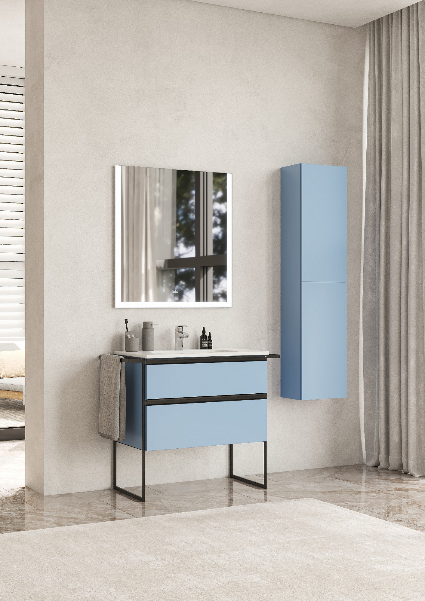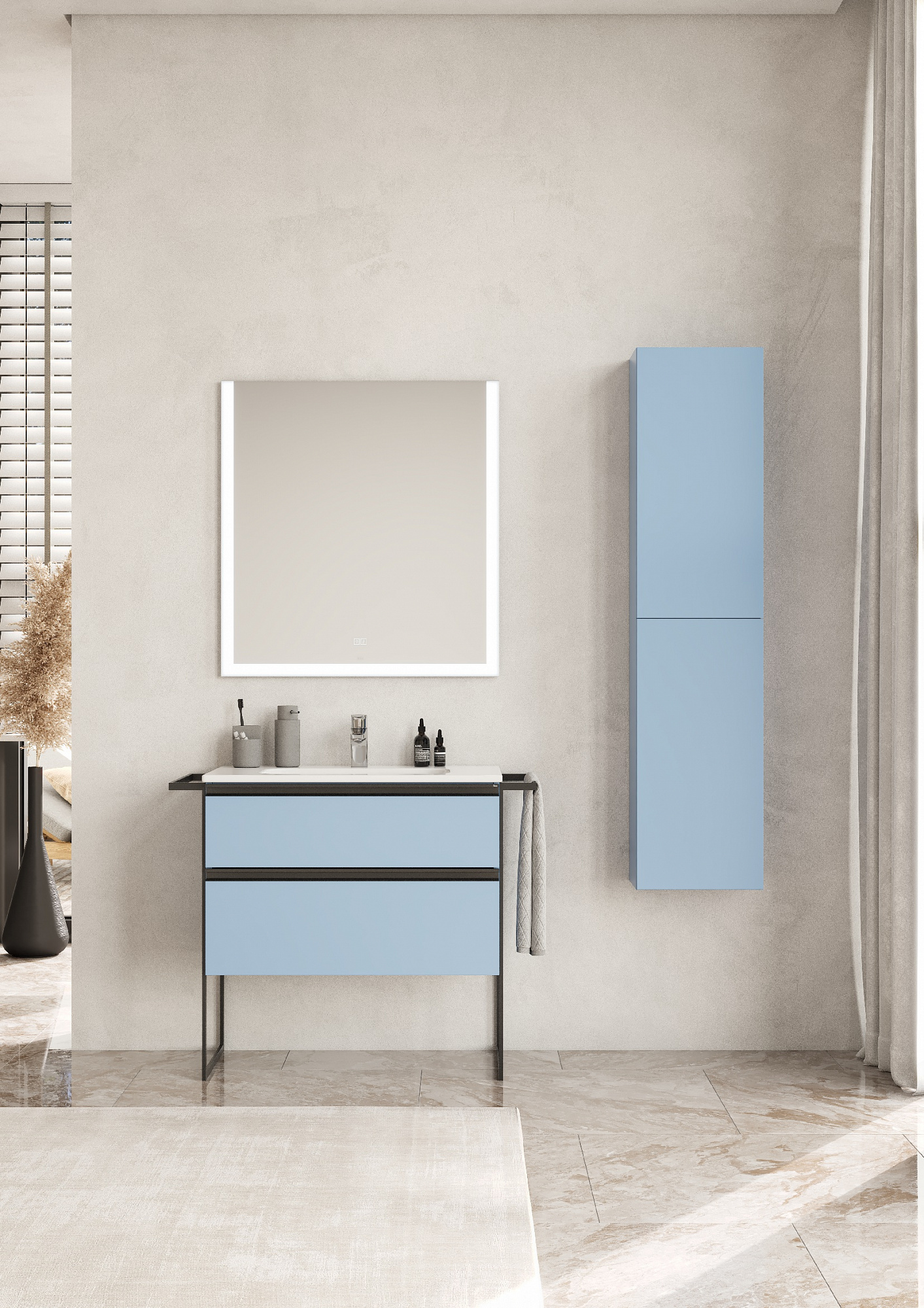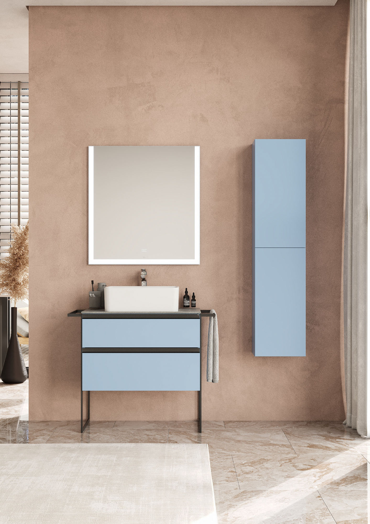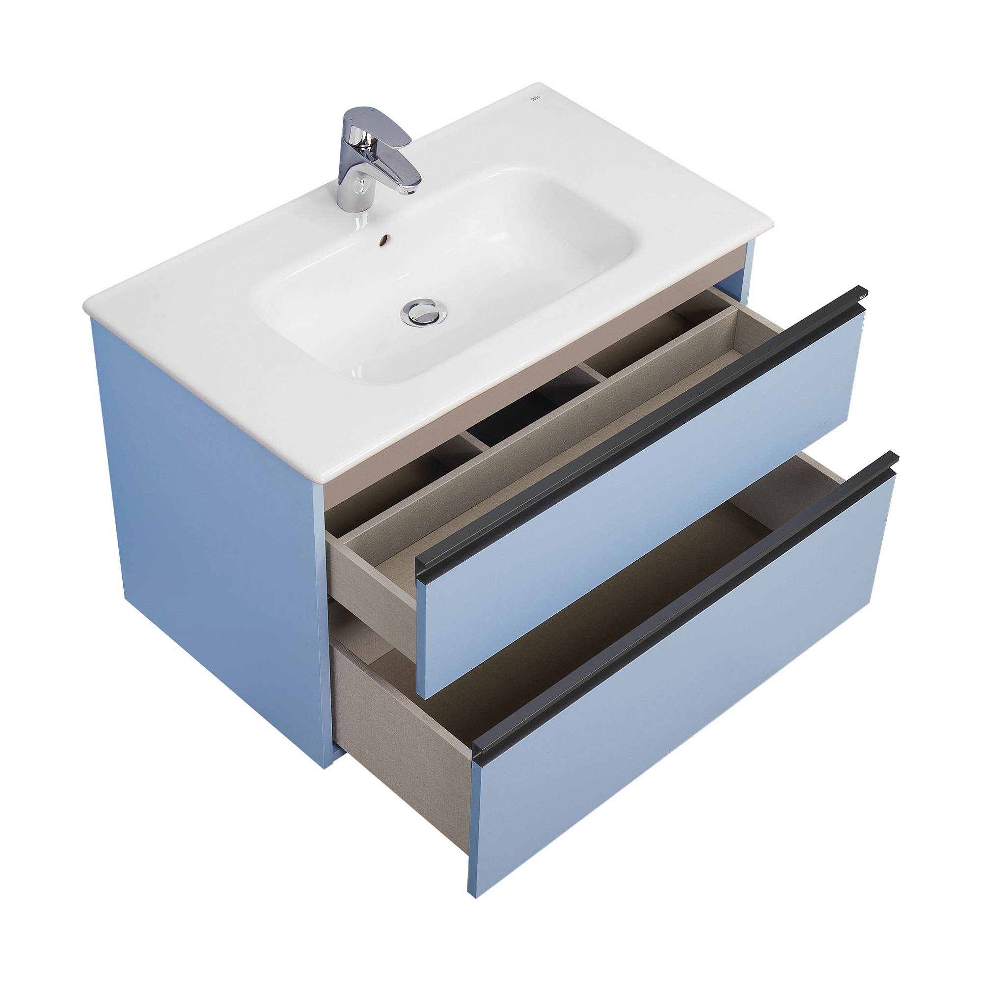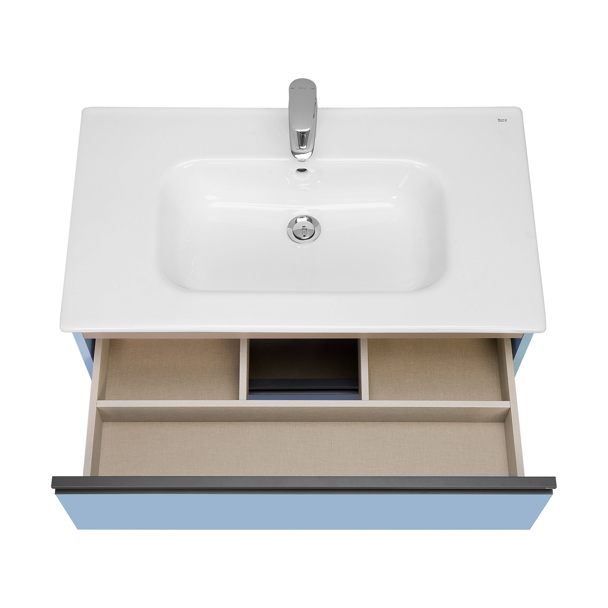 Модуль под раковину Domi с черной матовой металлической ручкой во всю ширину фасада и направляющими с функцией soft-close. Нижняя часть ручки обработана под углом, что предотвращает скопление воды и пыли. Ручка защищает фасады модуля от попадания капель воды с раковины, а также защищает углы модуля от ударов и износа. Модуль выполнен из влагостойкой ЛДСП в трендовом цвете. Внутренняя отделка ящиков выполнена в цвете бежевый текстиль, приятна на ощупь и предотвращает скольжение предметов. Пространство верхнего ящика разделено на три части, что позволяет хранить предметы для ванной комнаты в идеальном порядке. По желанию модуль Domi можно комплектовать черными матовыми опорами, которые представлены в двух вариантах: с полотенцедержателем и без