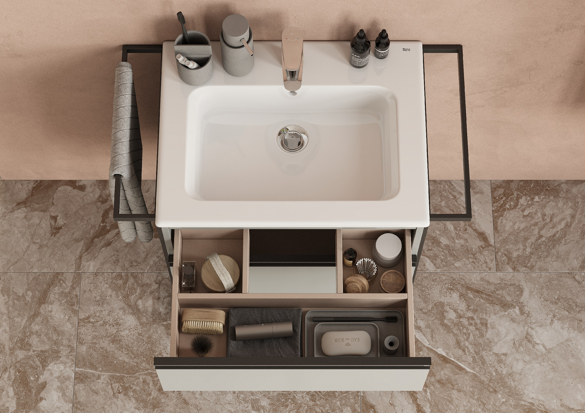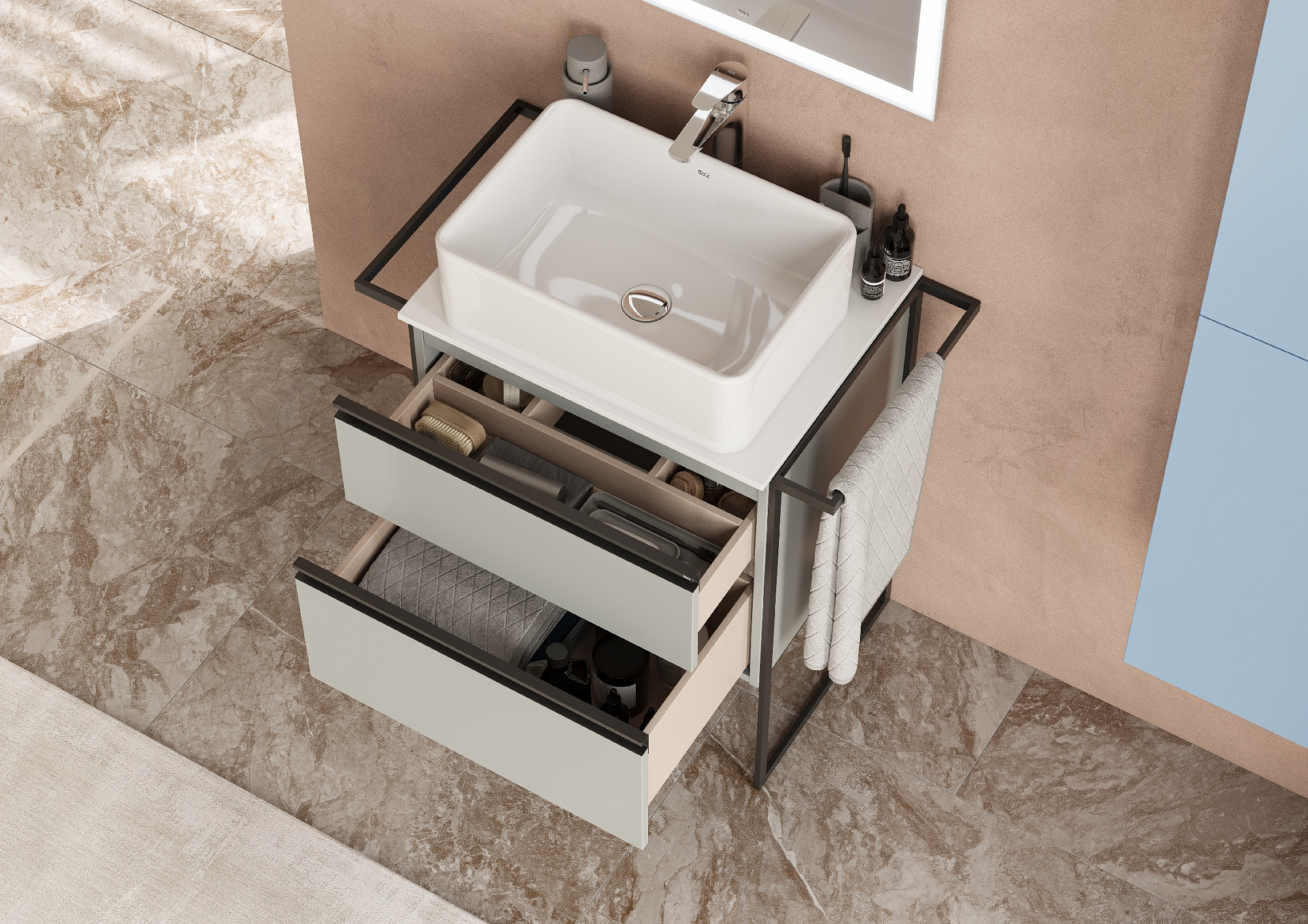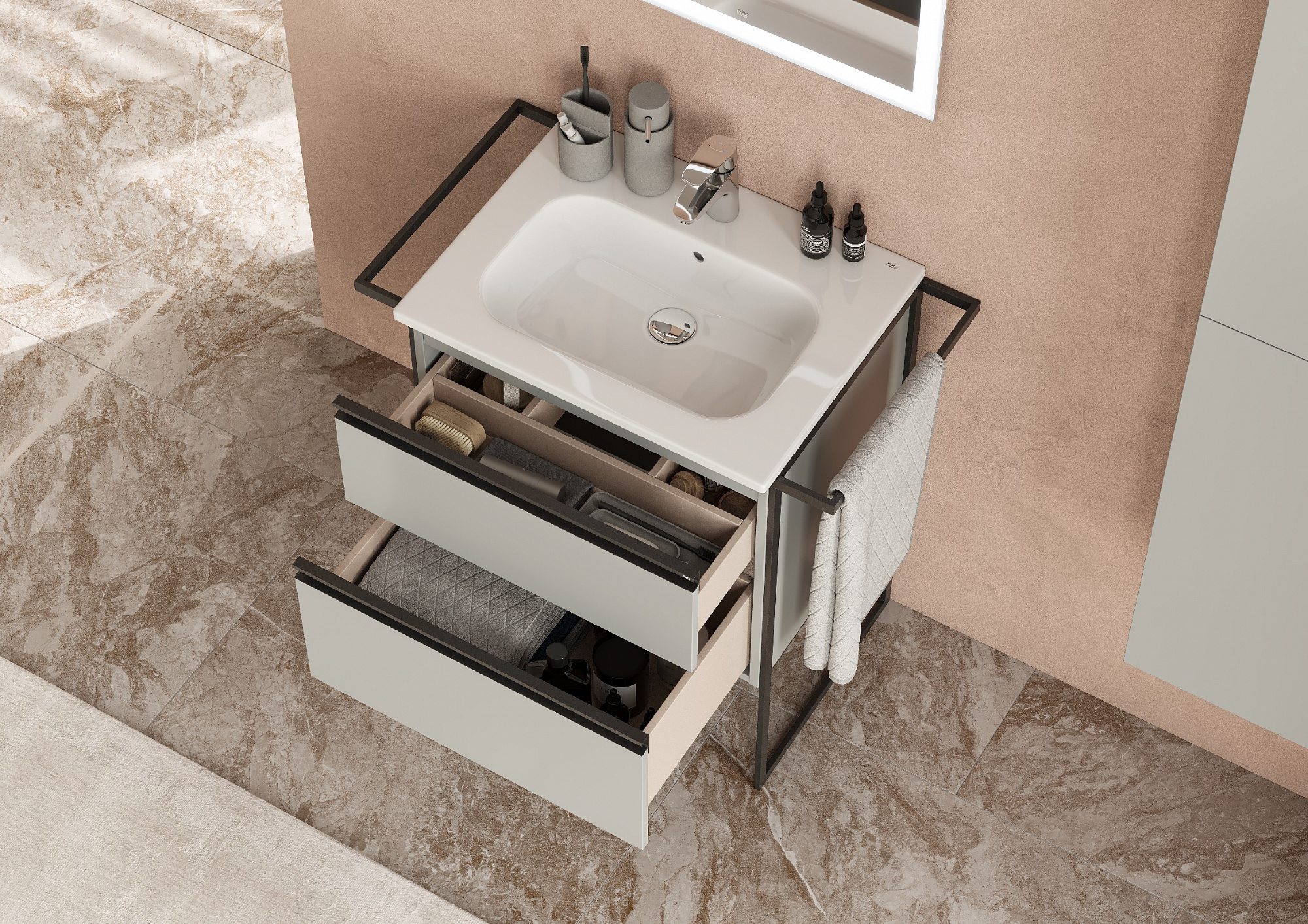 Модуль под раковину Domi с черной матовой металлической ручкой во всю ширину фасада и направляющими с функцией soft-close. Нижняя часть ручки обработана под углом, что предотвращает скопление воды и пыли. Ручка защищает фасады модуля от попадания капель воды с раковины, а также защищает углы модуля от ударов и износа. Модуль выполнен из влагостойкой ЛДСП в трендовом цвете. Внутренняя отделка ящиков выполнена в цвете бежевый текстиль, приятна на ощупь и предотвращает скольжение предметов. Пространство верхнего ящика разделено на три части, что позволяет хранить предметы для ванной комнаты в идеальном порядке. По желанию модуль Domi можно комплектовать черными матовыми опорами, которые представлены в двух вариантах: с полотенцедержателем и без