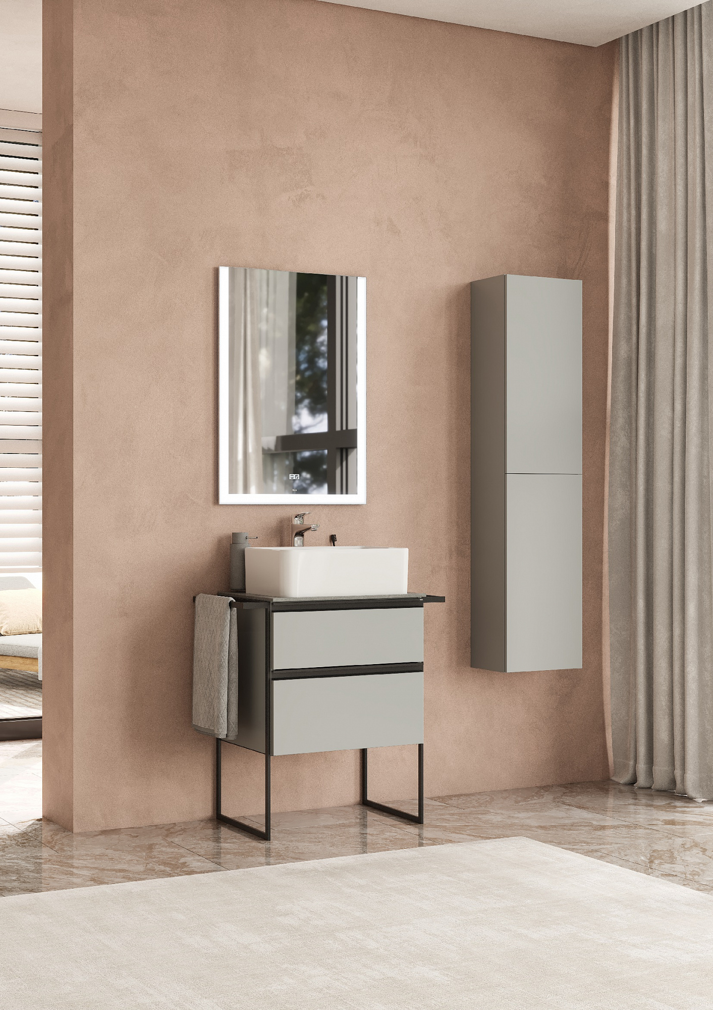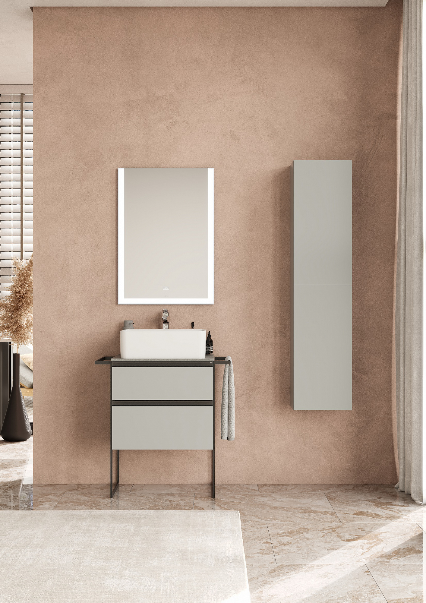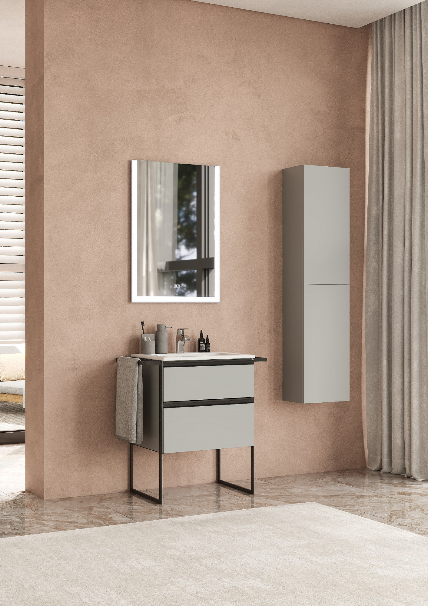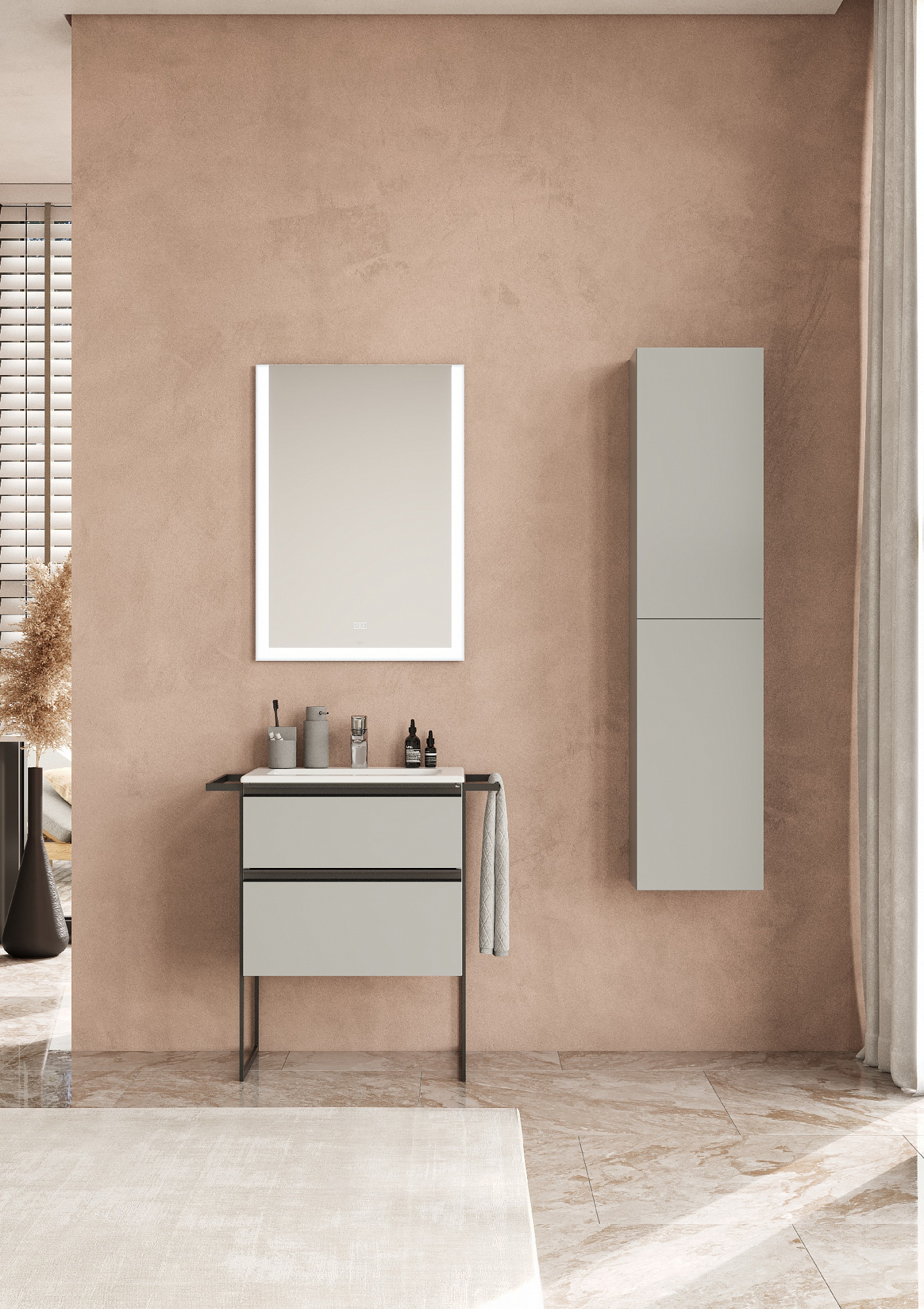 Модуль под раковину Domi с черной матовой металлической ручкой во всю ширину фасада и направляющими с функцией soft-close. Нижняя часть ручки обработана под углом, что предотвращает скопление воды и пыли. Ручка защищает фасады модуля от попадания капель воды с раковины, а также защищает углы модуля от ударов и износа. Модуль выполнен из влагостойкой ЛДСП в трендовом цвете. Внутренняя отделка ящиков выполнена в цвете бежевый текстиль, приятна на ощупь и предотвращает скольжение предметов. Пространство верхнего ящика разделено на три части, что позволяет хранить предметы для ванной комнаты в идеальном порядке. По желанию модуль Domi можно комплектовать черными матовыми опорами, которые представлены в двух вариантах: с полотенцедержателем и без