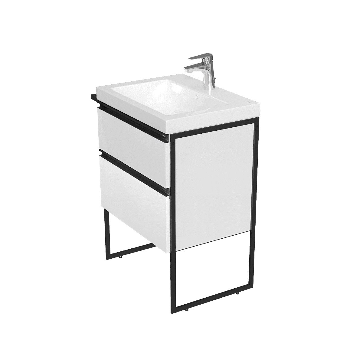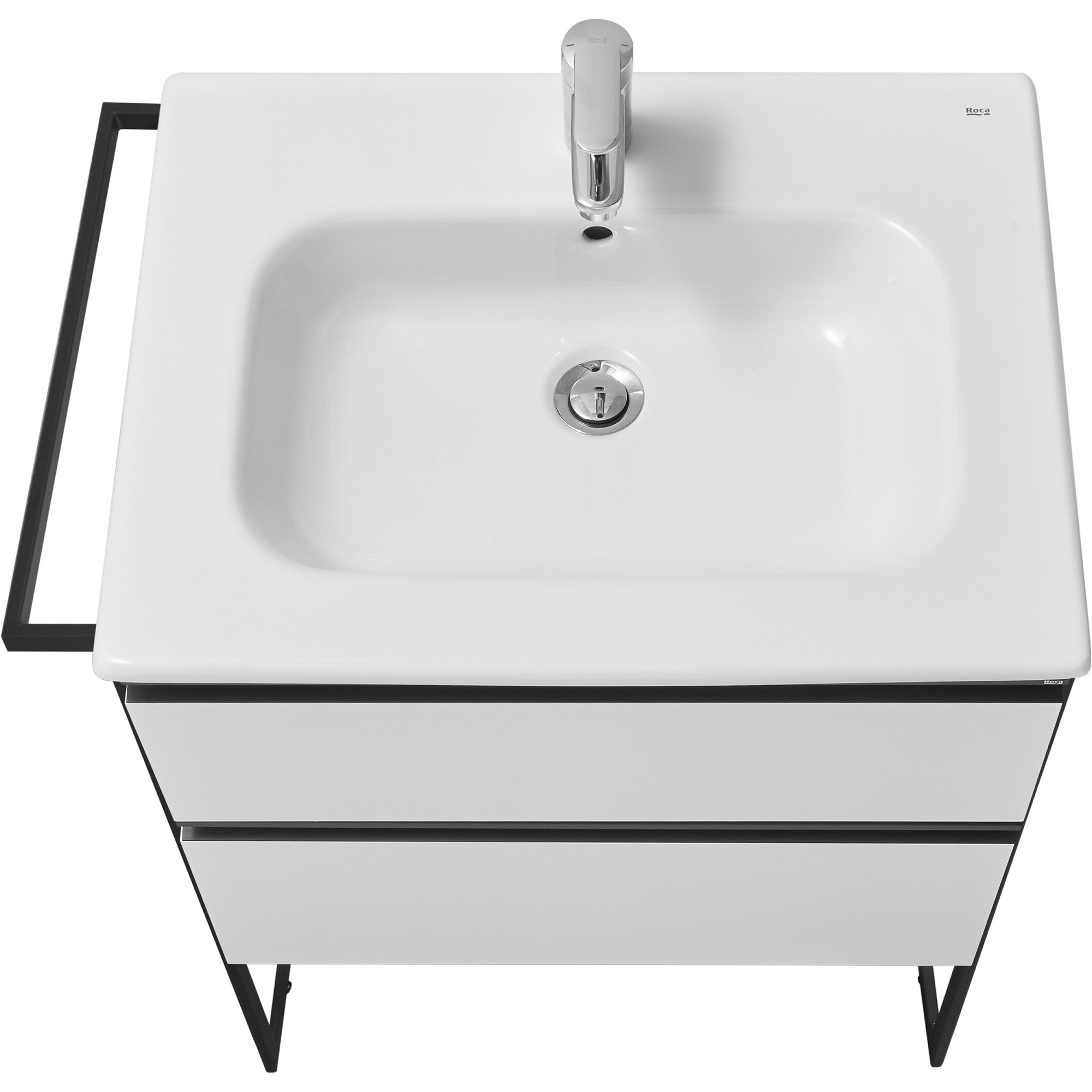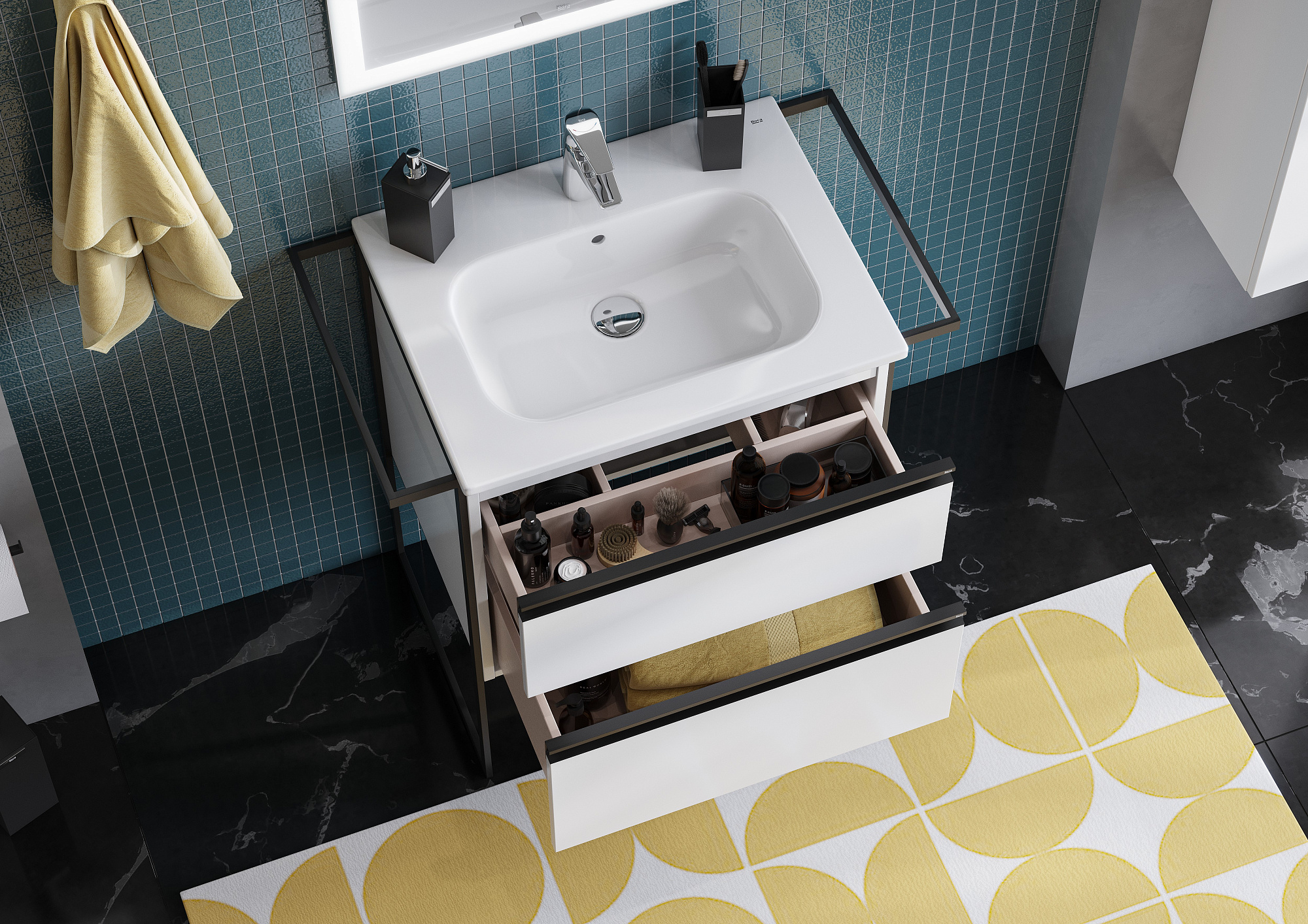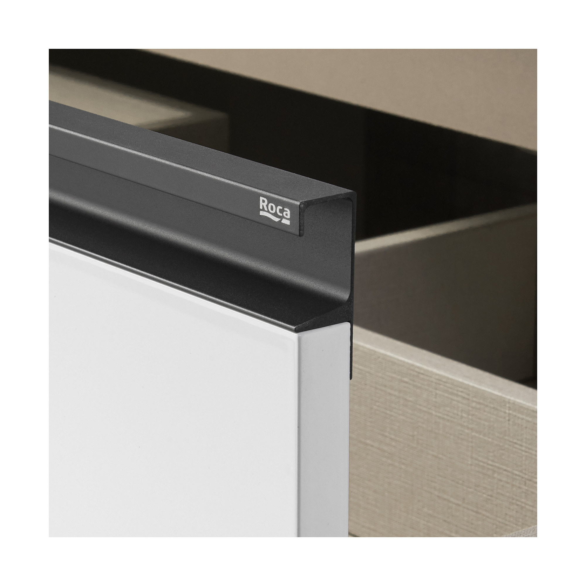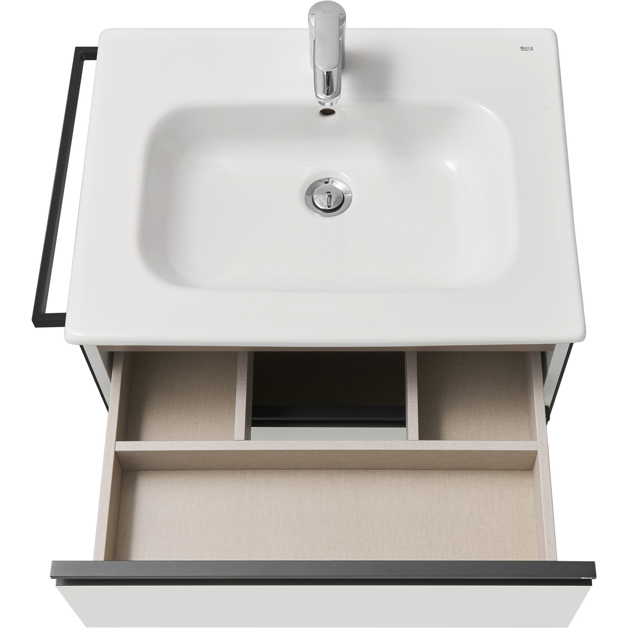 Модуль под раковину DOMI с черной матовой металлической удобной ручкой во всю ширину профиля и направляющими с функцией soft-close. Нижняя часть ручки обработана под углом, что предотвращает скопление воды и пыли. Ручка защищает фасады модуля от попадания капель воды с раковины, а также защищает углы модуля от ударов и износа. Внутренняя отделка ящиков выполнена в цвете бежевый текстиль, приятна на ощупь и предотвращает скольжение предметов. Пространство верхнего ящика разделено на три части, что позволяет хранить предметы для ванной комнаты в идеальном порядке. По желанию клиента модуль DOMI может комплектоваться черными матовыми опорами, которые представлены в двух вариантах: с полотенцедержателем и без. С помощью опор и аксессуаров в черном цвете (Rubik, Tempo, Ice) можно расставить четкие акценты в интерьере и создать ванную комнату в стиле лофт. Новый артикул, аналог 857532806