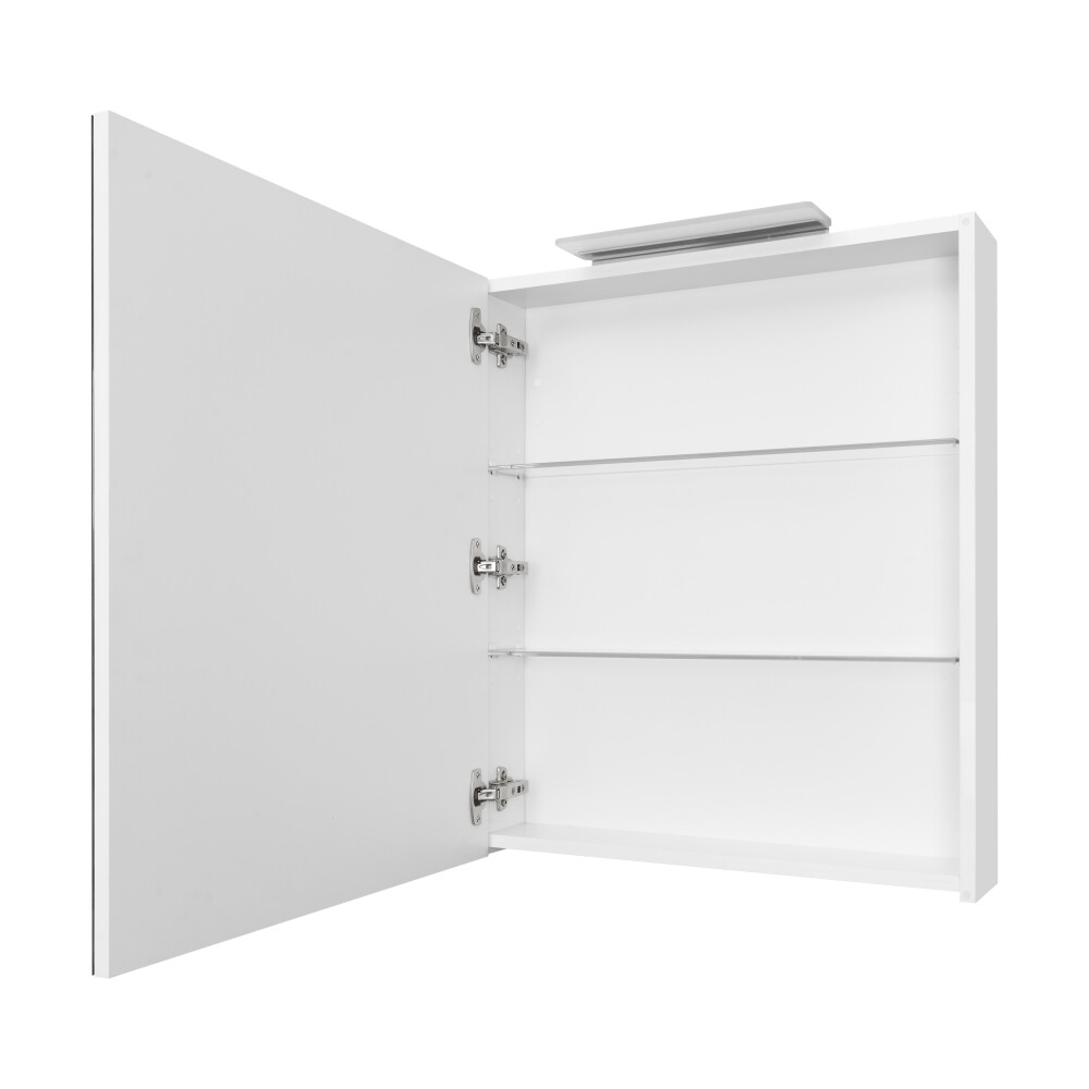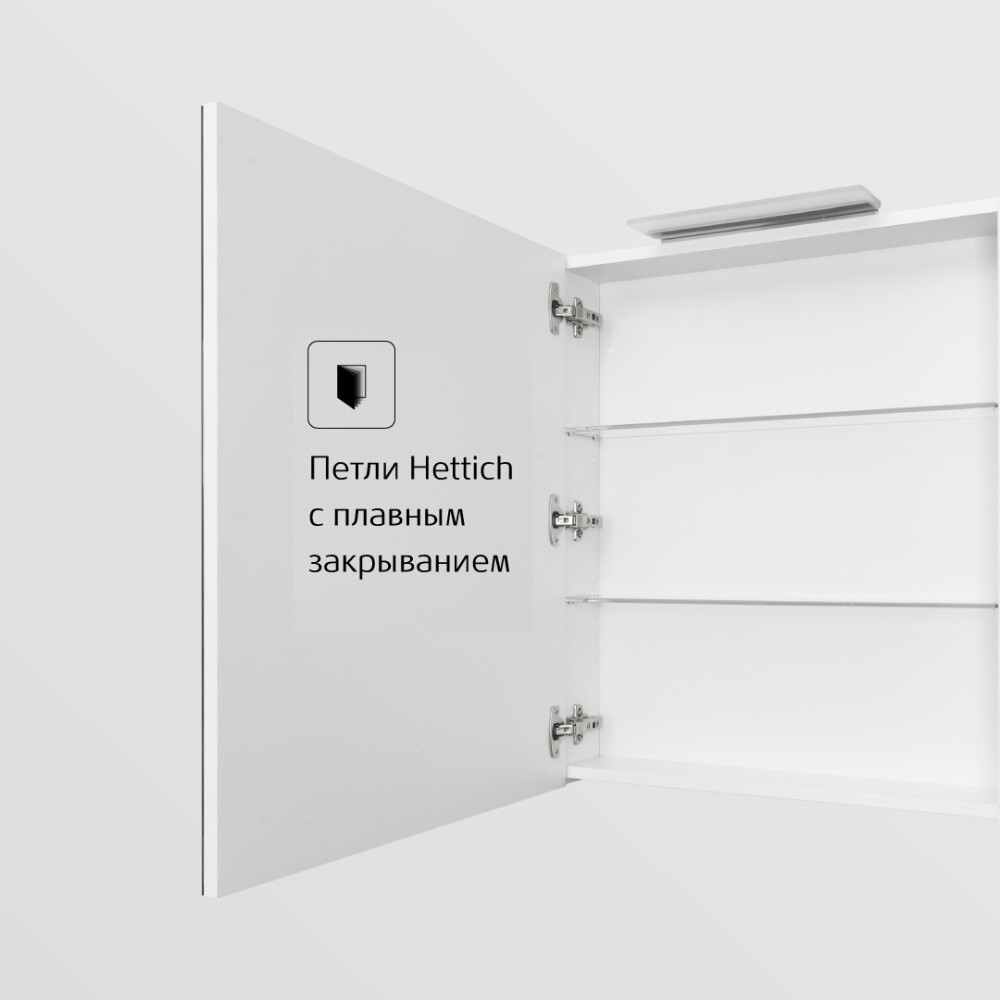 Зеркальный шкаф OLETA оснащен светильником от европейского бренда с возможностью регулировки положения, IP 44, 5 700 K. Теплота света у светильника 5 700 K - это яркий свет, идеальный для нанесения макияжа и бритья. Положение светильника можно регулировать: наклонить слегка вниз или направить свет повыше. За зеркальными фасадами расположены регулируемые по высоте полочки из просветленного стекла. Фасады оснащены петлями с плавным закрыванием