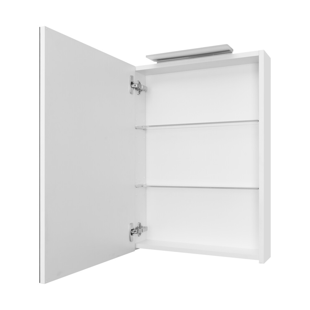Зеркальный шкаф OLETA оснащен светильником от европейского бренда с возможностью регулировки положения, IP 44, 5 700 K. Теплота света у светильника 5 700 K - это яркий свет, идеальный для нанесения макияжа и бритья. Положение светильника можно регулировать: наклонить слегка вниз или направить свет повыше. За зеркальными фасадами расположены регулируемые по высоте полочки из просветленного стекла. Фасады оснащены петлями с плавным закрыванием