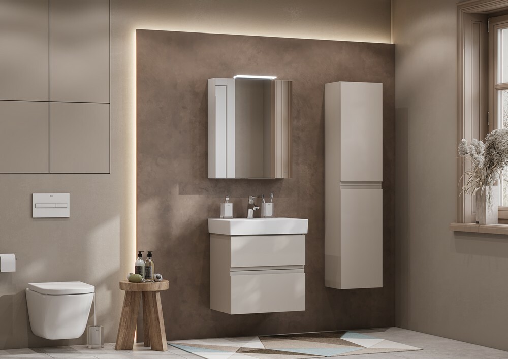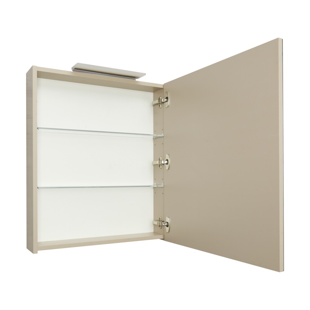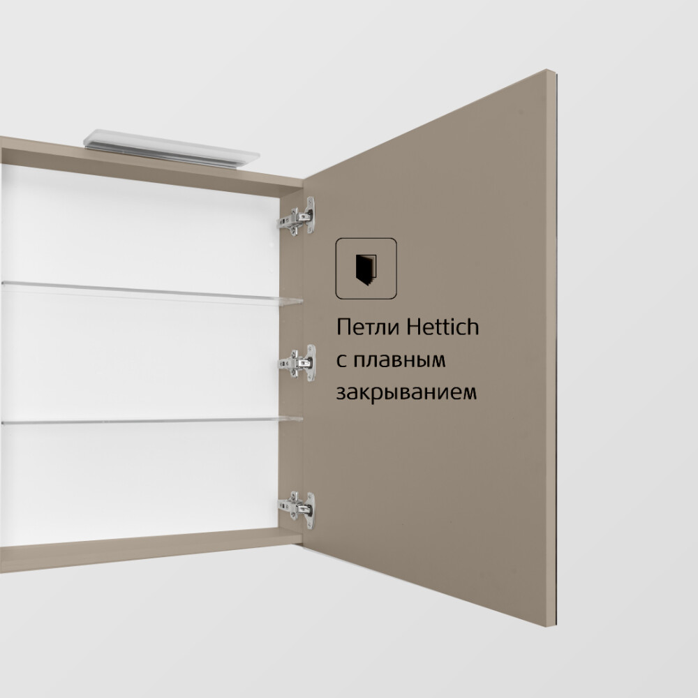 Зеркальный шкаф OLETA оснащен светильником от европейского бренда с возможностью регулировки положения, IP 44, 5 700 K. Теплота света у светильника 5 700 K - это яркий свет, идеальный для нанесения макияжа и бритья. Положение светильника можно регулировать: наклонить слегка вниз или направить свет повыше. За зеркальными фасадами расположены регулируемые по высоте полочки из просветленного стекла. Фасады оснащены петлями с плавным закрыванием