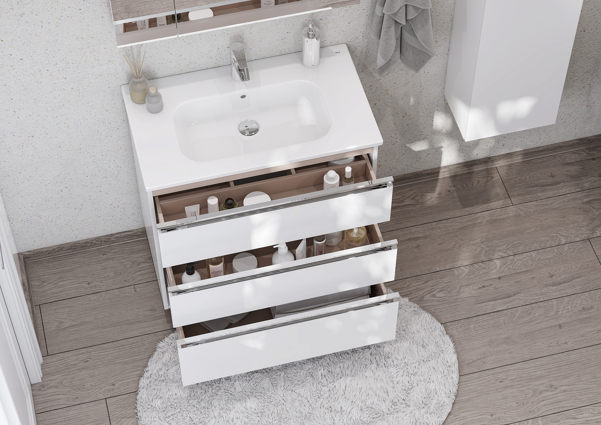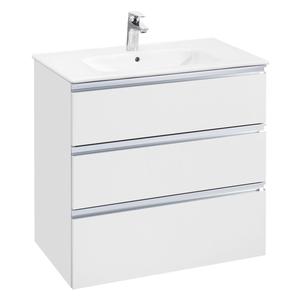 Модуль под раковину THE GAP в цвете белый глянец обладает универсальным современным дизайном и функциональностью. Металлическая ручка во всю ширину модуля удобна в использовании и вместе с направляющими с функцией soft-close делает процесс открывания ящиков легким и приятным. Нижняя часть ручки обработана под углом, что предотвращает скопление воды и пыли. Ручка защищает фасады модуля от попадания капель воды с раковины, а также защищает углы модуля от ударов и износа. Внутренняя отделка ящиков выполнена в цвете бежевый текстиль, приятна на ощупь и предотвращает скольжение предметов. Пространство верхнего ящика разделено на три части, что позволяет хранить предметы для ванной комнаты в идеальном порядке. Благодаря универсальному дизайну модули под раковину THE GAP могут сочетаться с различными вариантами зеркал и зеркальных шкафов из коллекций THE GAP ORIGINAL, ANETO, VICTORIA NORD. Сифон для раковины и набор ножек приобретаются отдельно. Новый Артикул A857406806, старый Артиул 857553806 выведен из ассортимента