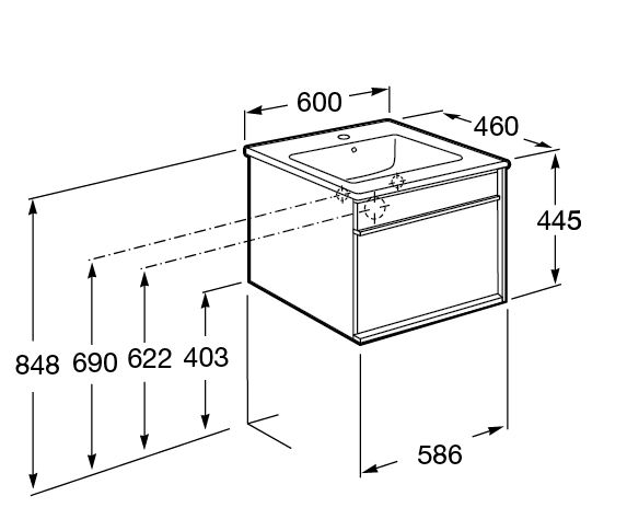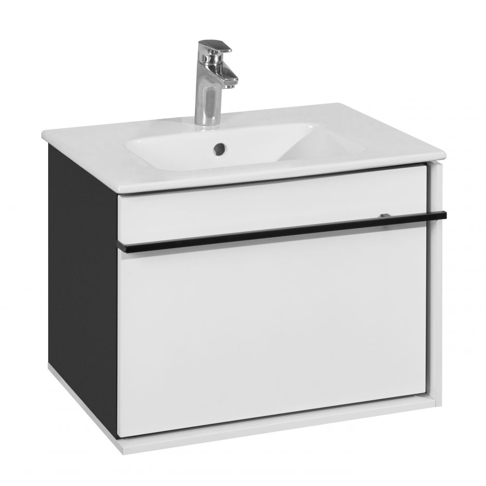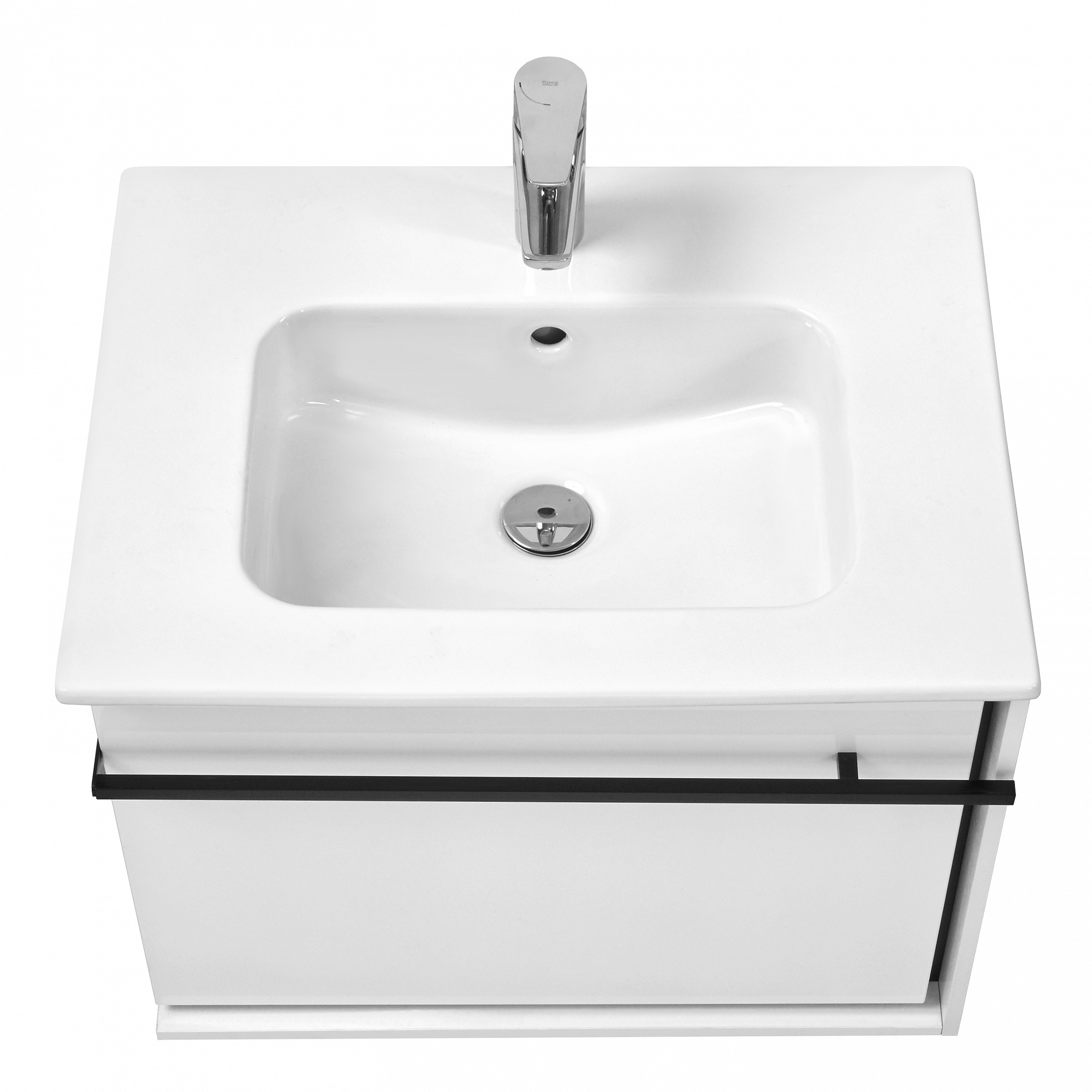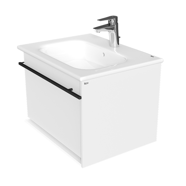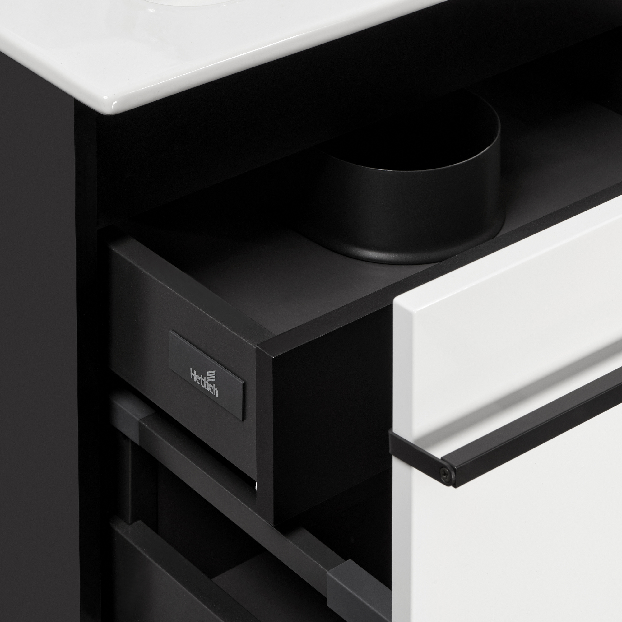 Четкая геометрия линий, сдержанность и широкий функционал – три определения, которые лучше всего описывают коллекцию Aneto. Фасад модуля Aneto размера 600 мм выполнен из MDF, окрашенной в белоснежный глянец, а корпус и левая боковая стенка – из влагостойкой ламинированной плиты в черном цвете. За фасадом находится небольшой внутренний ящик, открывающийся с помощью системы push-to-open и идеально подходящий для хранения небольших мелочей. Вместительный внешний ящик позволит разместить более крупные предметы. Тонкая и изящная ручка в черном матовом цвете подчеркивает графичность дизайна коллекции и может использоваться как полотенцедержатель. Модуль комплектуется керамической раковиной Roca Victoria-N