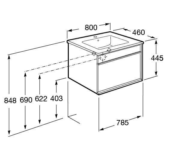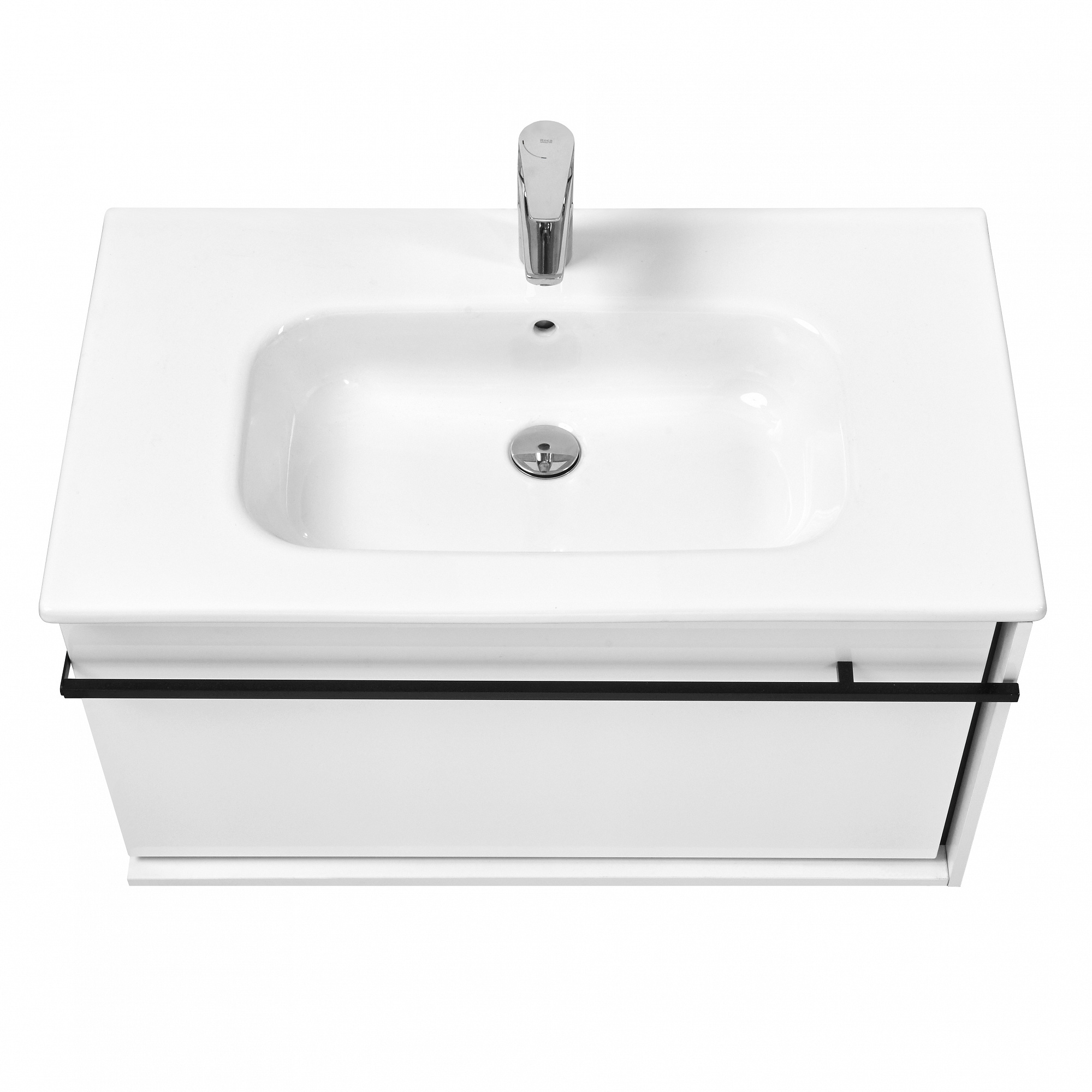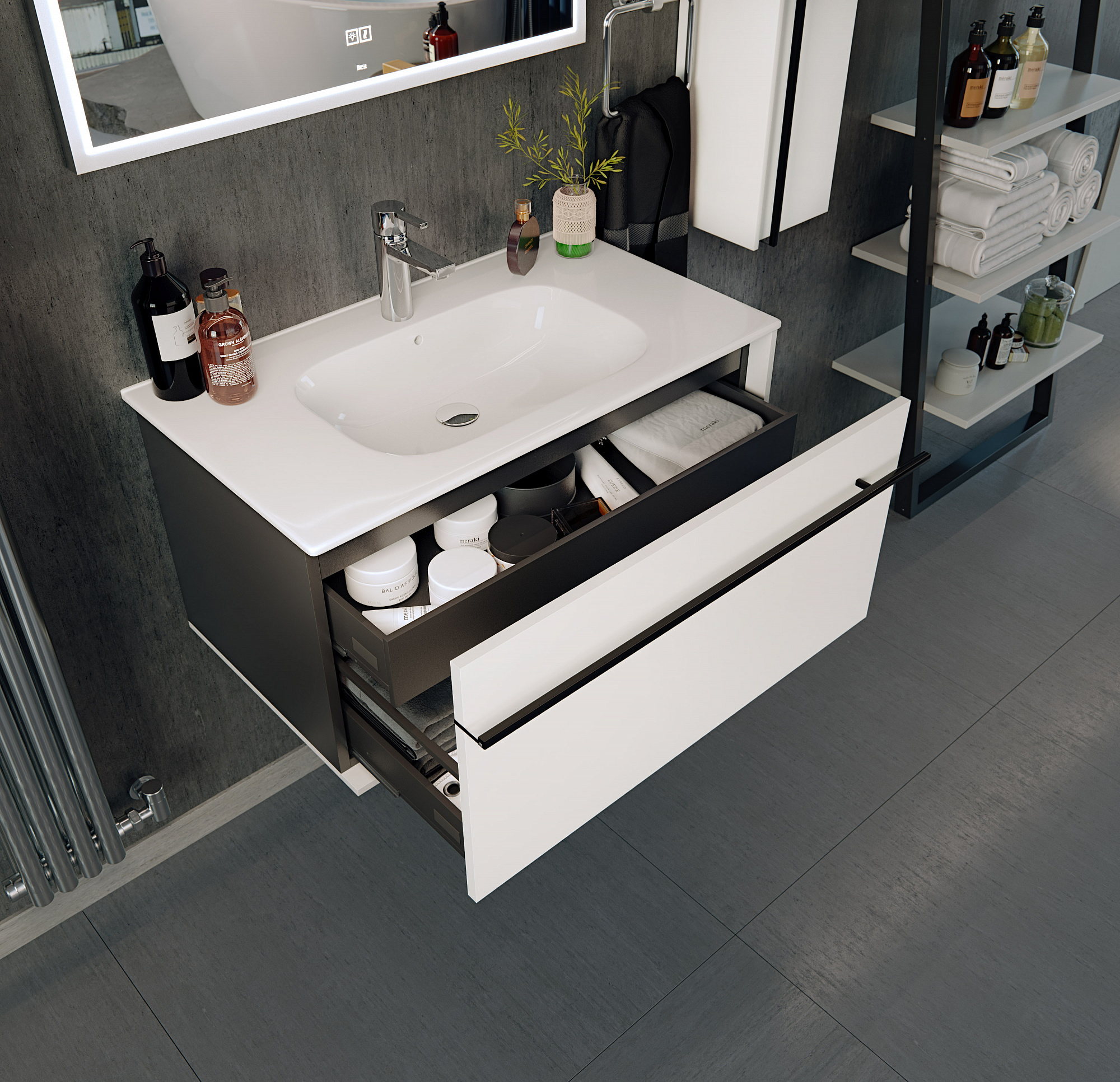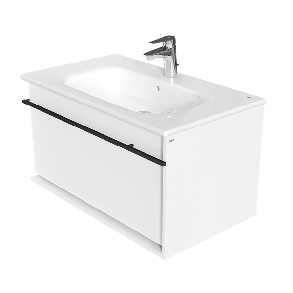 Четкая геометрия линий, сдержанность и широкий функционал – три определения, которые лучше всего описывают коллекцию Aneto. Фасад модуля Aneto размера 800 мм выполнен из MDF, окрашенной в белоснежный глянец, а корпус и левая боковая стенка – из влагостойкой ламинированной плиты в черном цвете. За фасадом находится небольшой внутренний ящик, открывающийся с помощью системы push-to-open и идеально подходящий для хранения небольших мелочей. Вместительный внешний ящик позволит разместить более крупные предметы. Тонкая и изящная ручка в черном матовом цвете подчеркивает графичность дизайна коллекции и может использоваться как полотенцедержатель. Модуль комплектуется керамической раковиной Roca Victoria-N