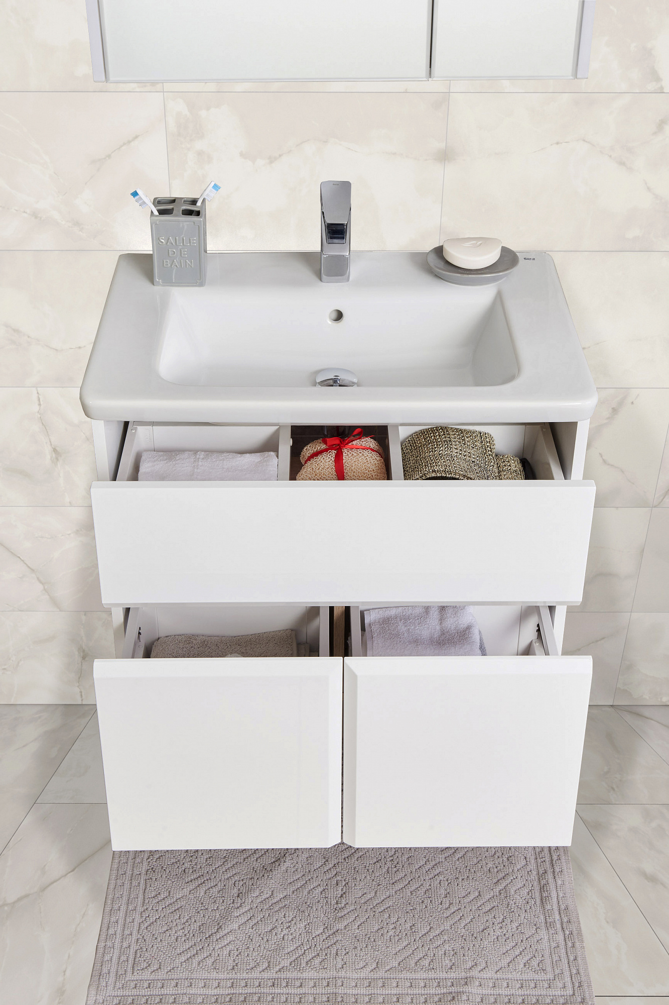 Тумба для раковины Up в современном стиле от испанского бренда Roca, выполненная из влагостойкой высококачественной ЛДСП и МДФ, с ящиками полного выдвижения с системой push-to-open