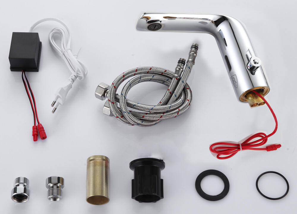 В комплекте смеситель. гибкая подводка 55см 2шт. универсальная присоединительная группа для установки на горизонтальную поверхность. блок питания. провод с разъемом. индивидуальный пакет. паспорт. (батарейки в комплект НЕ входят)