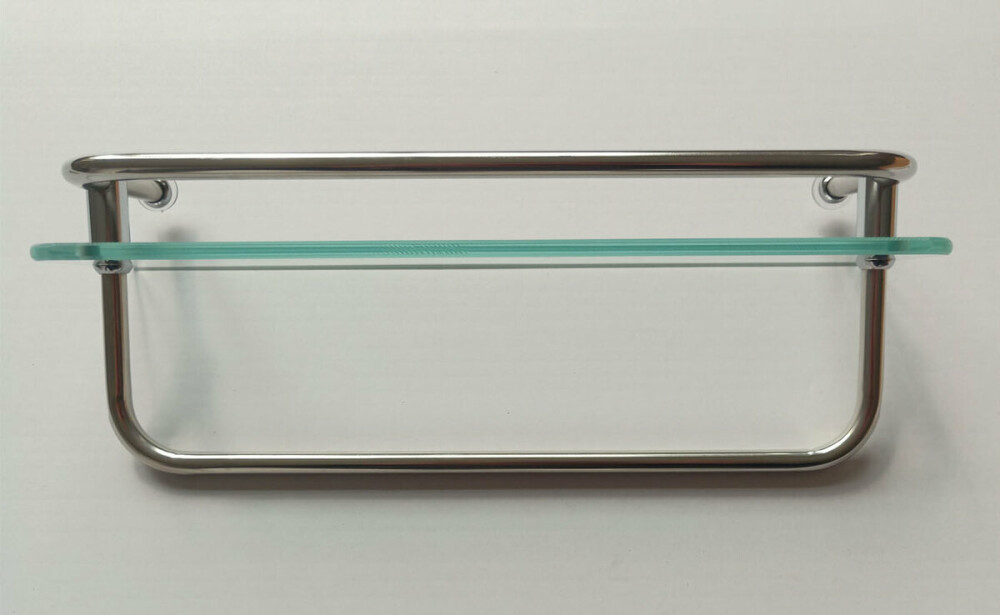 Стеклянная полочка с ограничителем и вешалкой для банных аксессуаров
