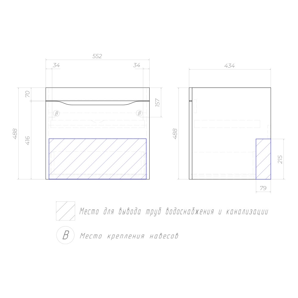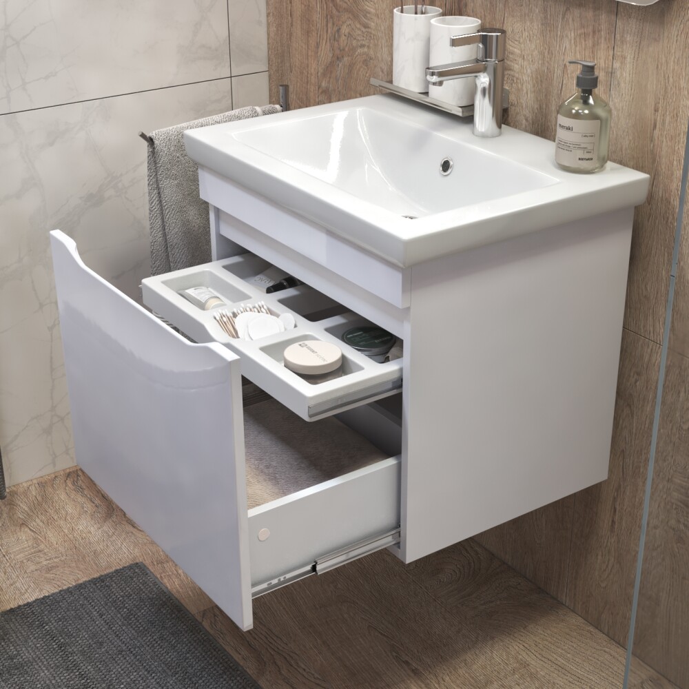 Тумба под раковину Vigo GRANI 600-0-1 подвесная без раковины. Оснащение: 1 ящик, выдвижной органайзер для мелочей, шариковые направляющие полного выдвижения, 2 навеса, 1 сифон