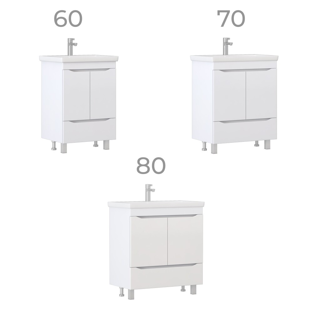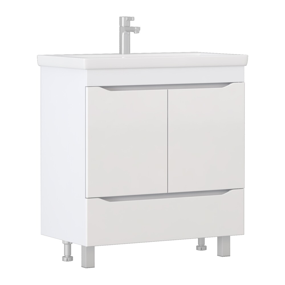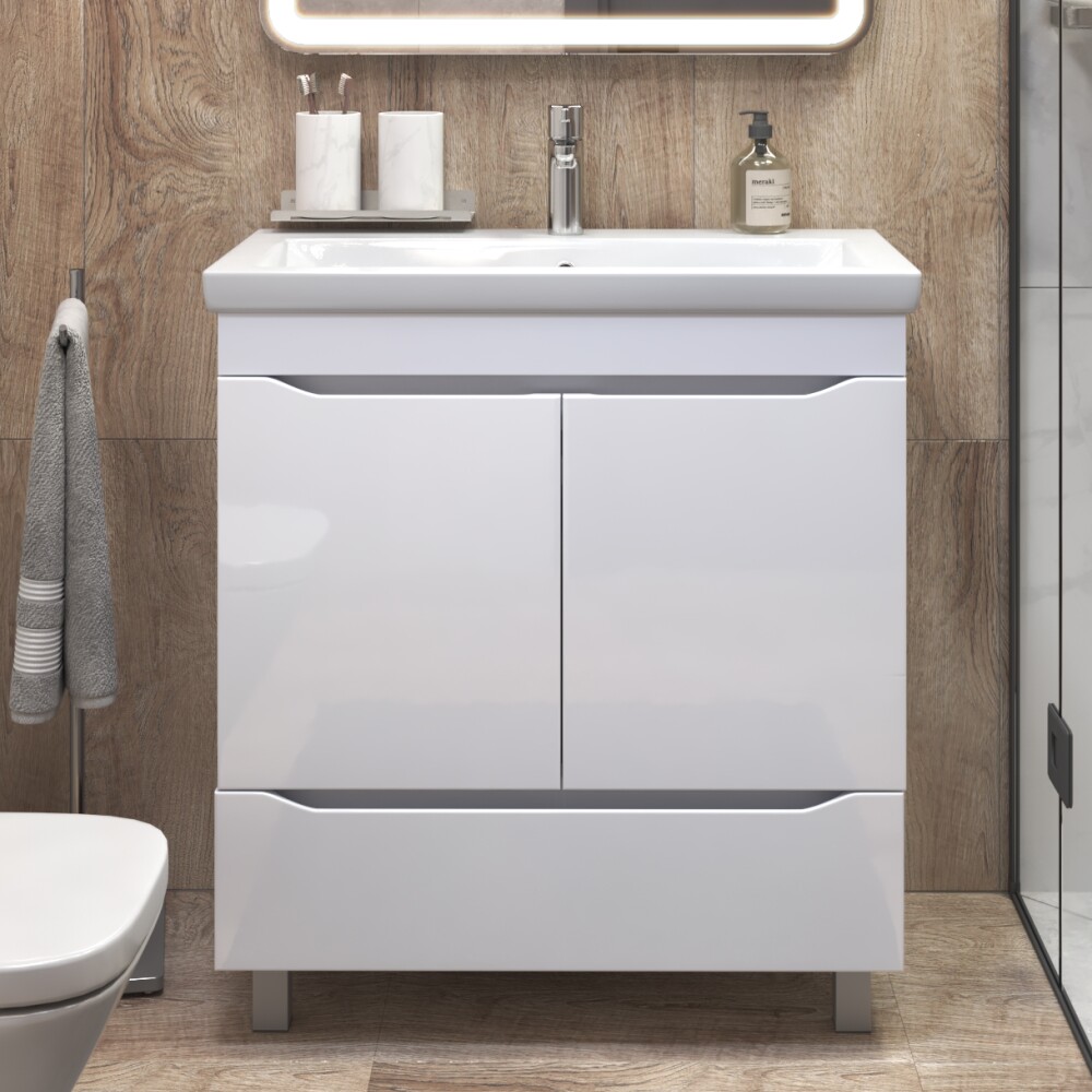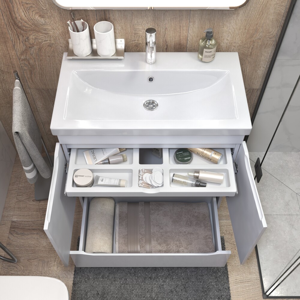 Ширина тумбы 800 мм обеспечивает удобную зону у умывальника и достаточный объём хранения для повседневных косметических средств, бытовой химии и текстиля, помогая поддерживать порядок без лишних открытых полок. Два выдвижных ящика (компоновка «2-1») позволяют разделить хранение по категориям и быстро находить нужные вещи, не загромождая столешницу.