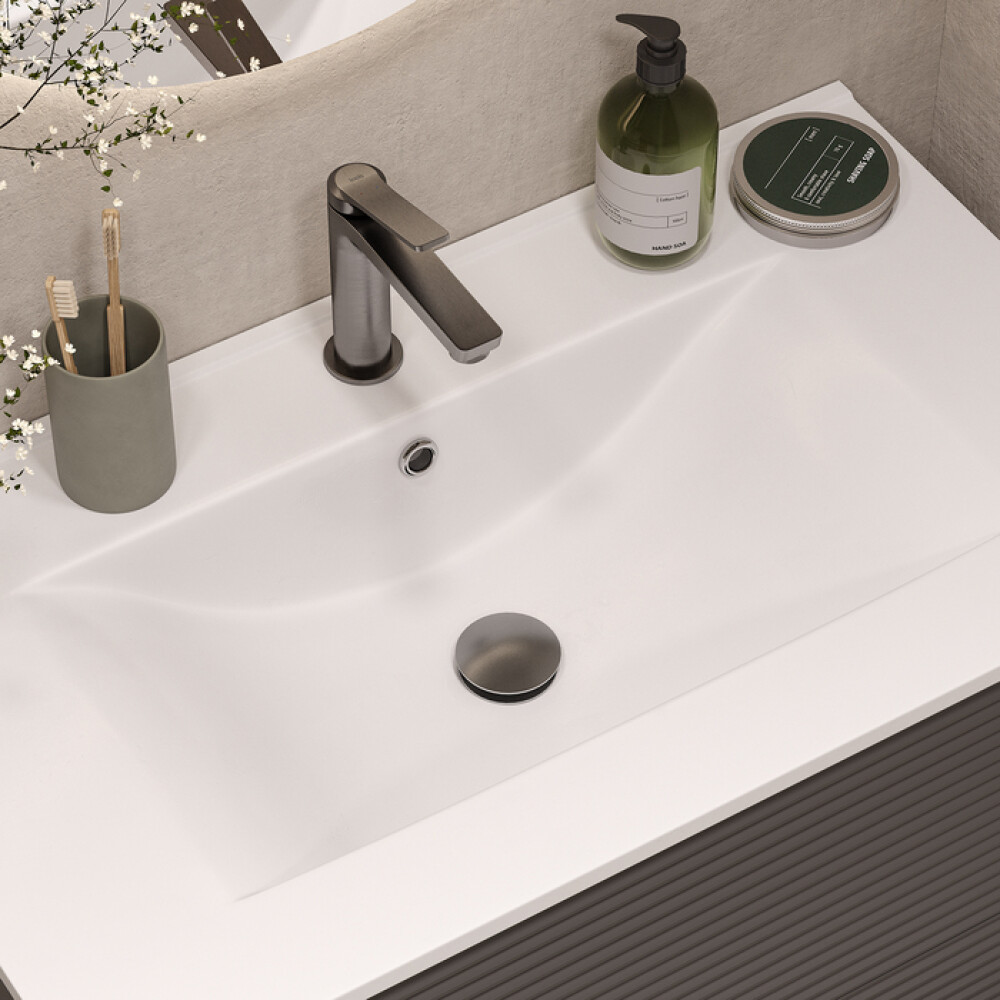 Выпуск Slide в стильном оттенке матового графита предназначен для умывальника с переливом и сделает его вид более эстетичным.