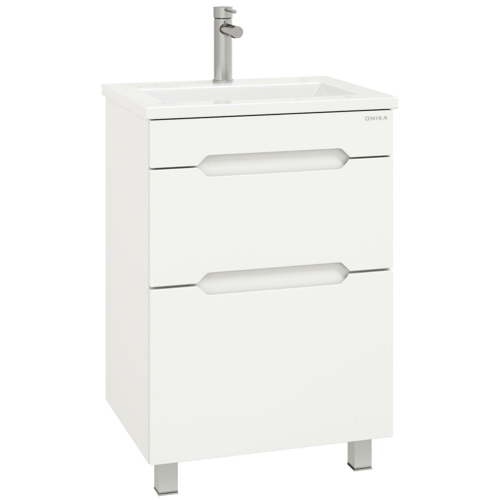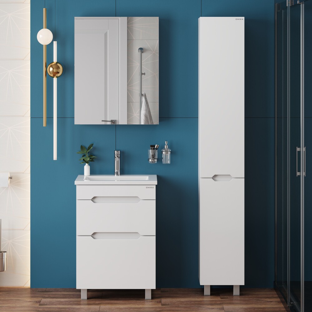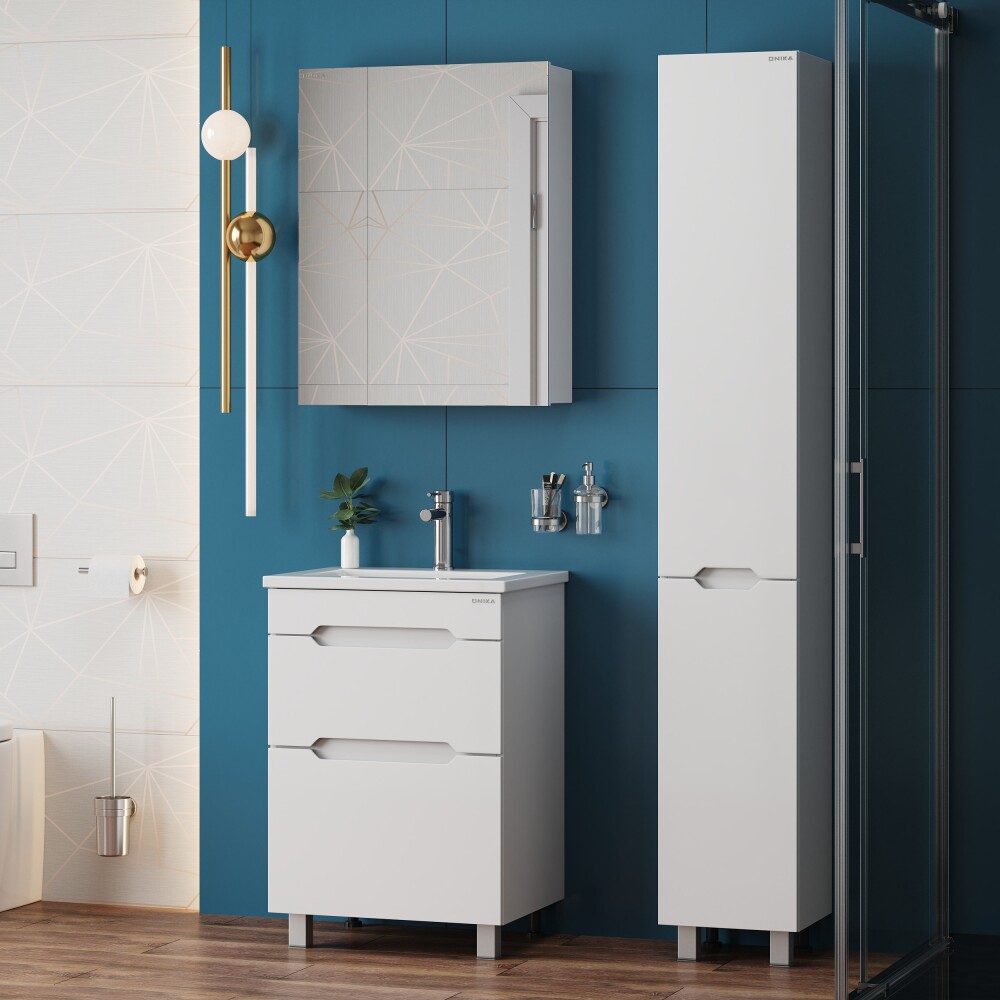 Напольная тумба для ванной комнаты Onika Айленд 60 сочетает в себе стильный минималистичный дизайн, белую глянцевую поверхность и высочайшее качество исполнения. Тумба имеет два ящика с направляющими полного выдвижения: нижний предназначен для больших предметов, а верхний, имеющий удобную систему организации пространства, - для мелких аксессуаров. Ручки, изящно интегрированные в фасады, позволяют сделать эксплуатацию мебели более удобной и практичной. Корпус тумбы выполнен из ЛДСП, фасады ящиков - из ЛМДФ в пленке, устойчивых к механическим воздействиям, перепадам температур и высокой влажности. Ножки (2 декоративных и 2 пластиковых) идут в комплекте с тумбой
