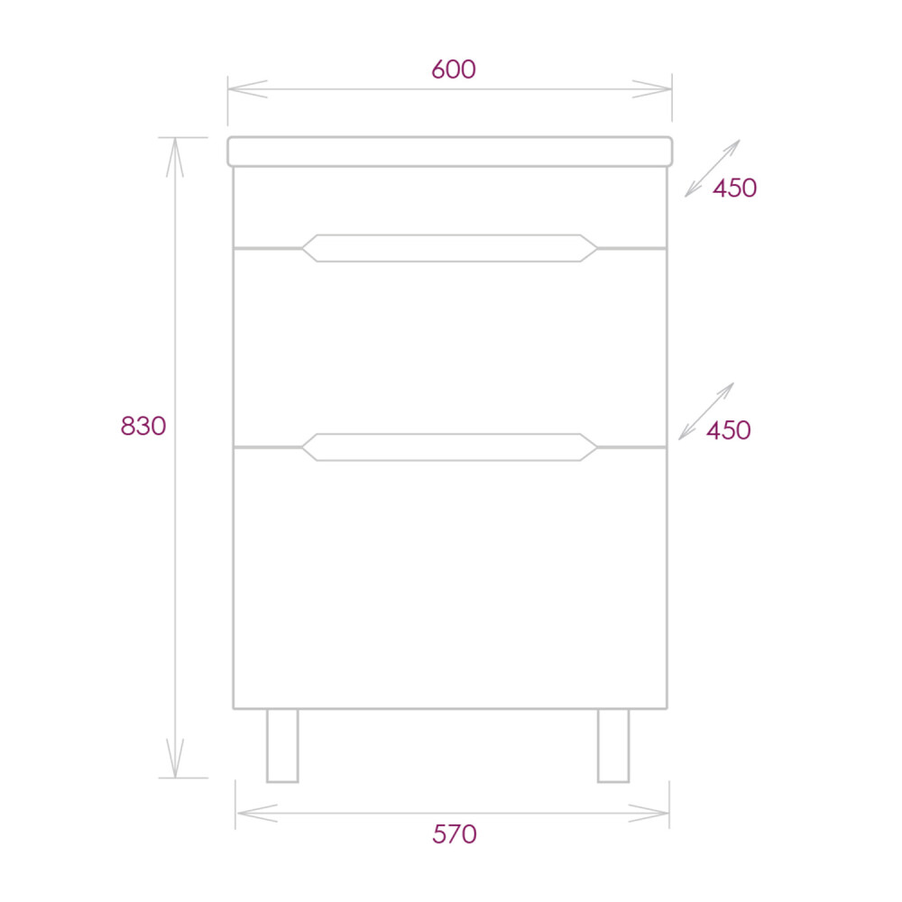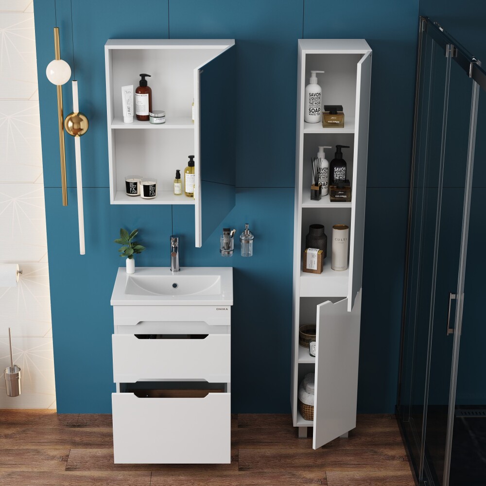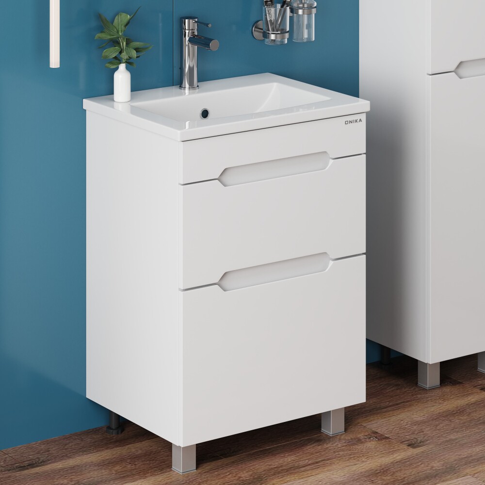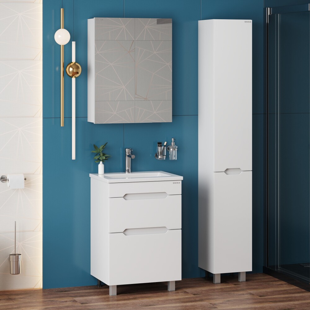 Напольная тумба для ванной комнаты Onika Айленд 60 сочетает в себе стильный минималистичный дизайн, белую глянцевую поверхность и высочайшее качество исполнения. Тумба имеет два ящика с направляющими полного выдвижения: нижний предназначен для больших предметов, а верхний, имеющий удобную систему организации пространства, - для мелких аксессуаров. Ручки, изящно интегрированные в фасады, позволяют сделать эксплуатацию мебели более удобной и практичной. Корпус тумбы выполнен из ЛДСП, фасады ящиков - из ЛМДФ в пленке, устойчивых к механическим воздействиям, перепадам температур и высокой влажности. Ножки (2 декоративных и 2 пластиковых) идут в комплекте с тумбой