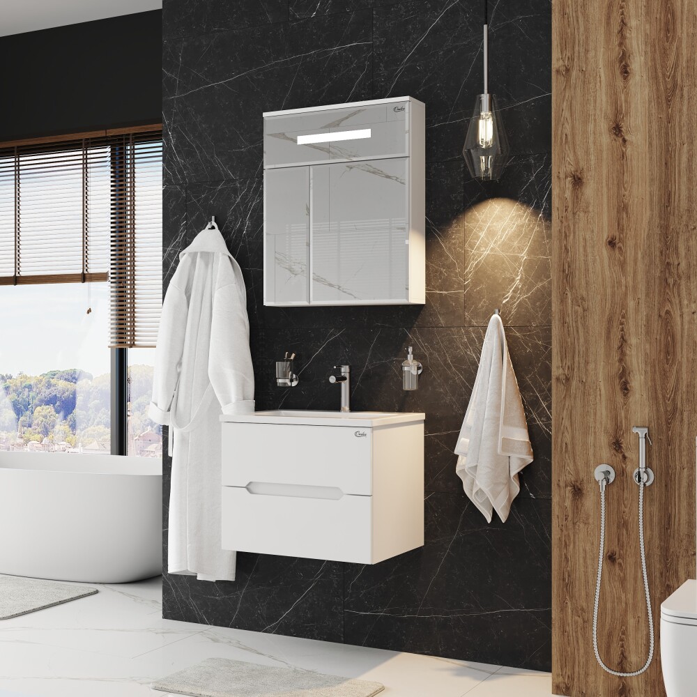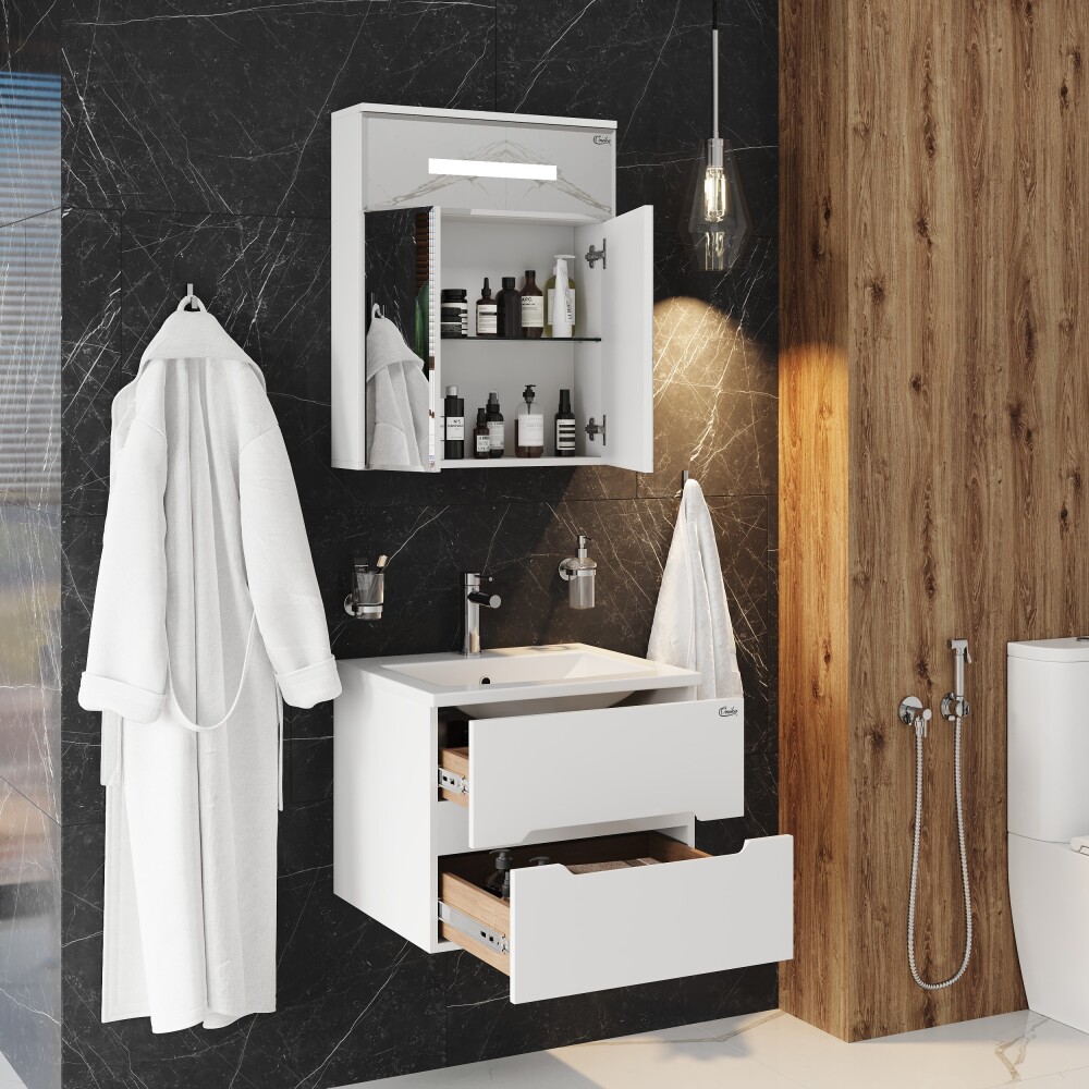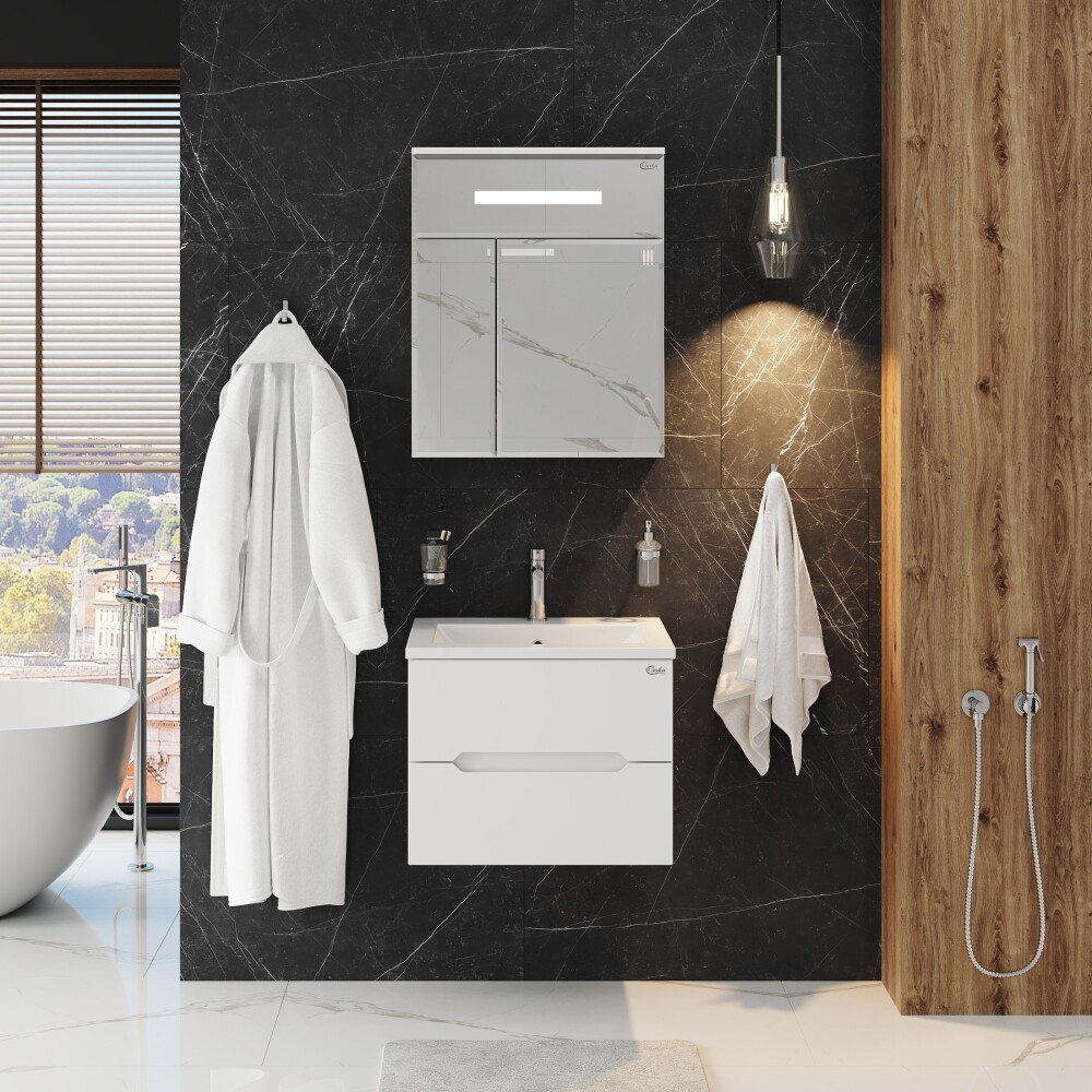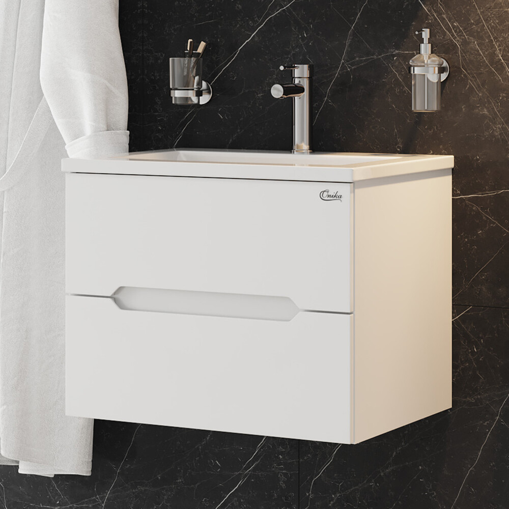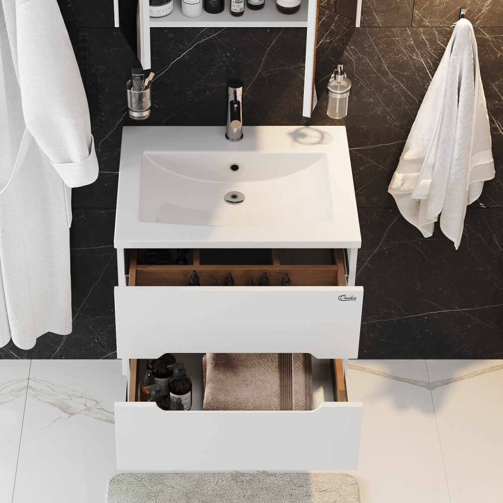 Подвесная тумба под раковину Onika Айленд 60 сочетает в себе стильный минималистичный дизайн, белую глянцевую поверхность и высочайшее качество исполнения. Тумба имеет два ящика с направляющими полного выдвижения: нижний предназначен для больших предметов, а верхний, имеющий удобную систему организации пространства, - для мелких аксессуаров. Ручки, изящно интегрированные в фасады, позволяют сделать эксплуатацию мебели более удобной и практичной. Корпус тумбы выполнен из ЛДСП, фасады ящиков - из ЛМДФ в пленке, устойчивых к механическим воздействиям, перепадам температур и высокой влажности. Тумба надежно крепится к стене и не занимает место на полу, не создавая при этом сложностей в уборке ванной комнаты. Подвесы для крепления тумбы - в комплекте