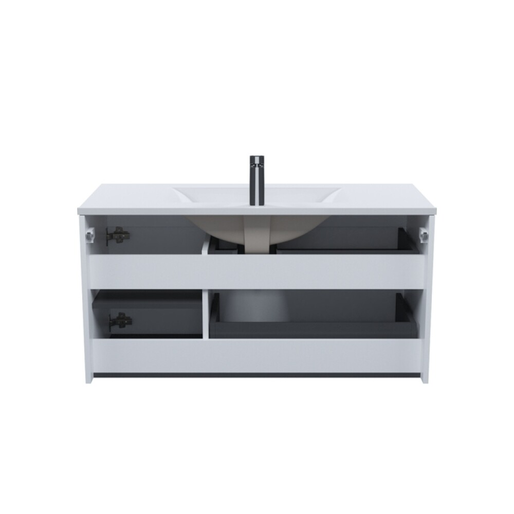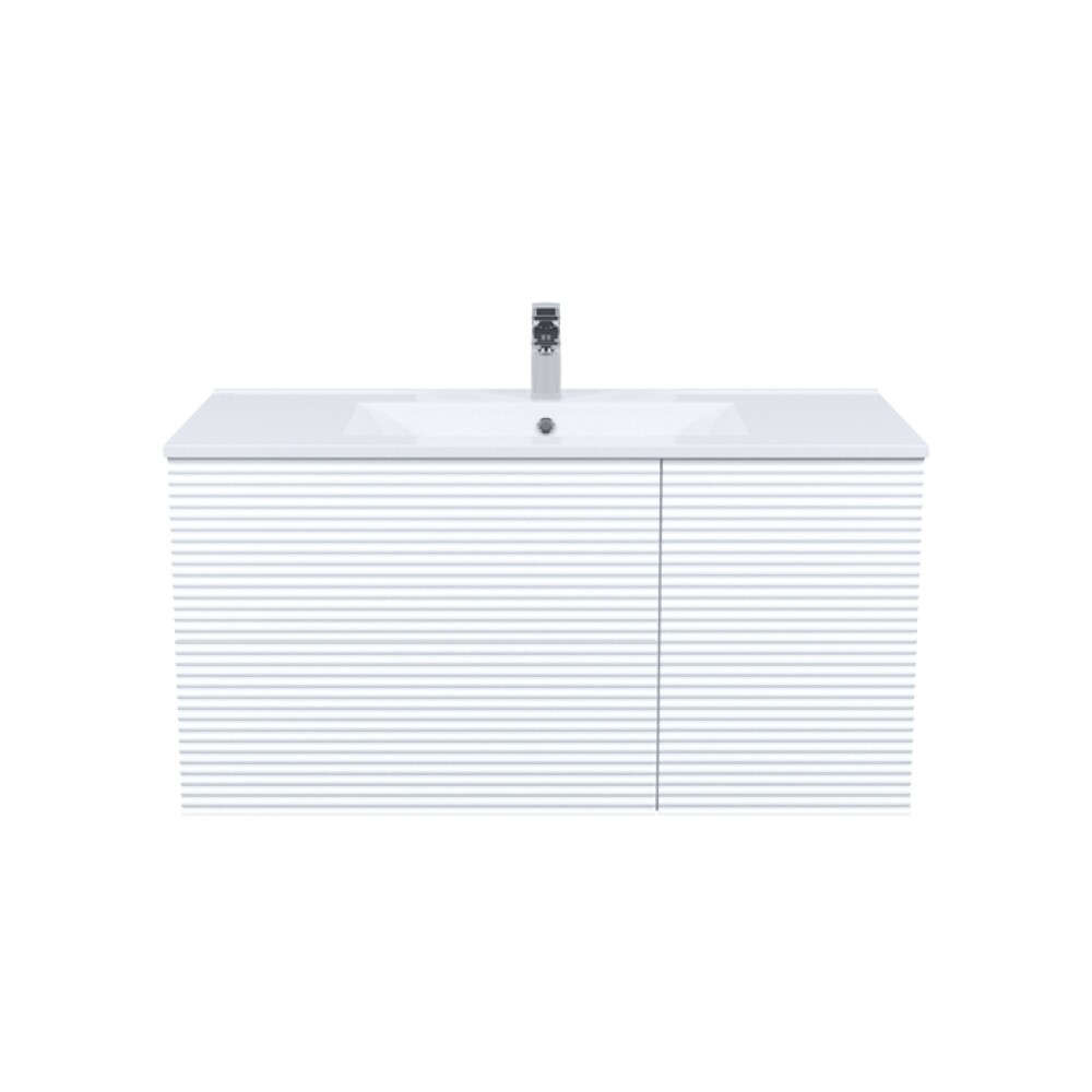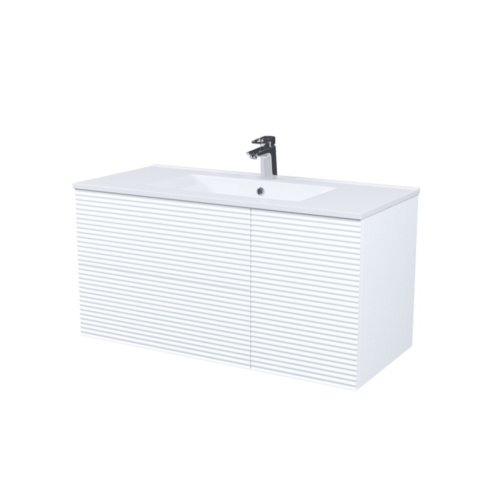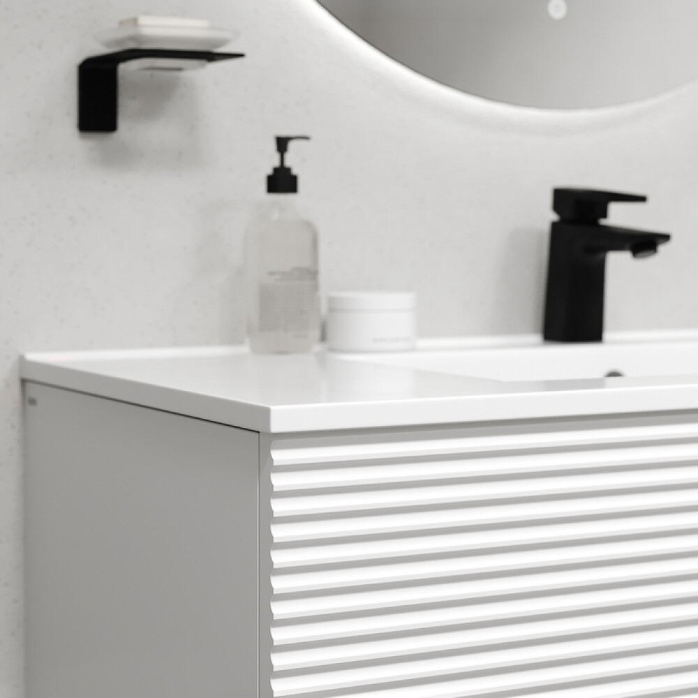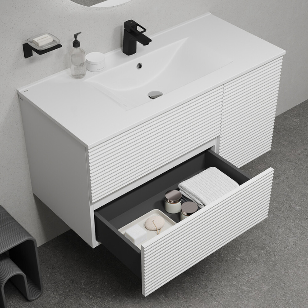 Вместительная подвесная тумба для ванной комнаты Bild с умывальником и выдвижными ящиками и полками – красивый дизайн с трендовой горизонтальной фрезеровкой в сочетании с универсальным белым цветом, удобством и практичностью.