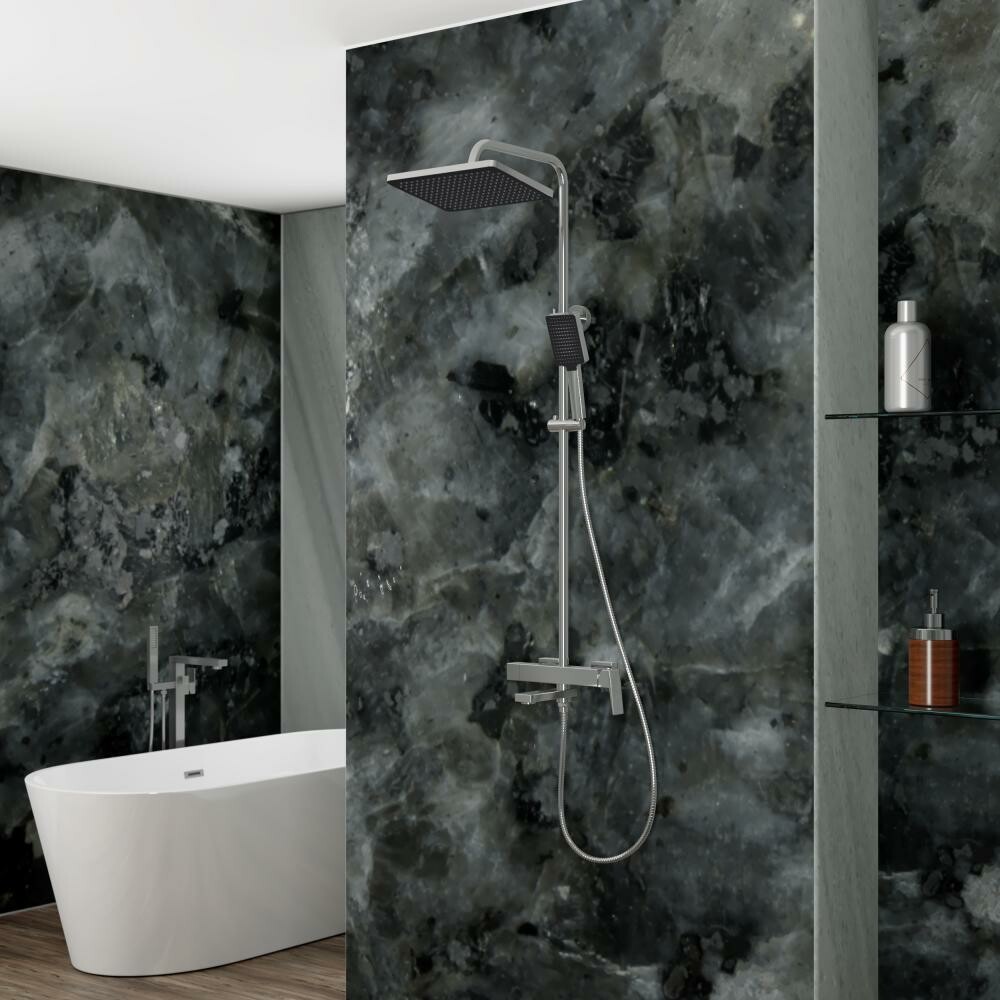 В комплекте 3-x режимная душевая лейка, 1-режимный тропический душ, изготовленный из современной прочной пластмассы, душевая штанга, держатель душевой лейки, душевой шланг с латунными гайками 150см, смеситель, паспорт изделия