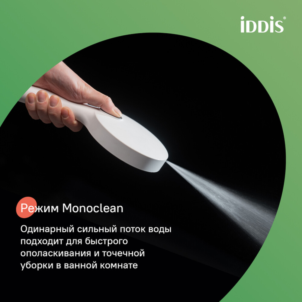 Кнопка на внешней стороне лейки включает отдельный режим MonoClean – мощную струю из торцевой части лейки, удобную для бытовых задач типа ополаскивания ванны или душевой кабины.