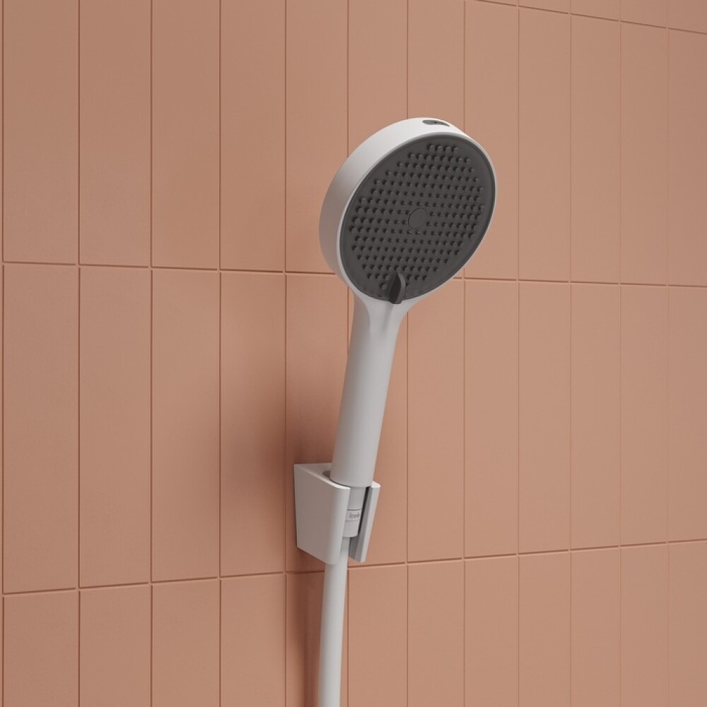 Ручная лейка для душа Aiger (диаметр 120 мм) в белом матовом цвете выглядит красиво, стильно и современно благодаря однотонной темно-серой лицевой части и силиконовым форсункам в тон. Лейка будет гармонично сочетаться с любым одноцветным смесителем и душевым шлангом благодаря универсальному соединению G ½.