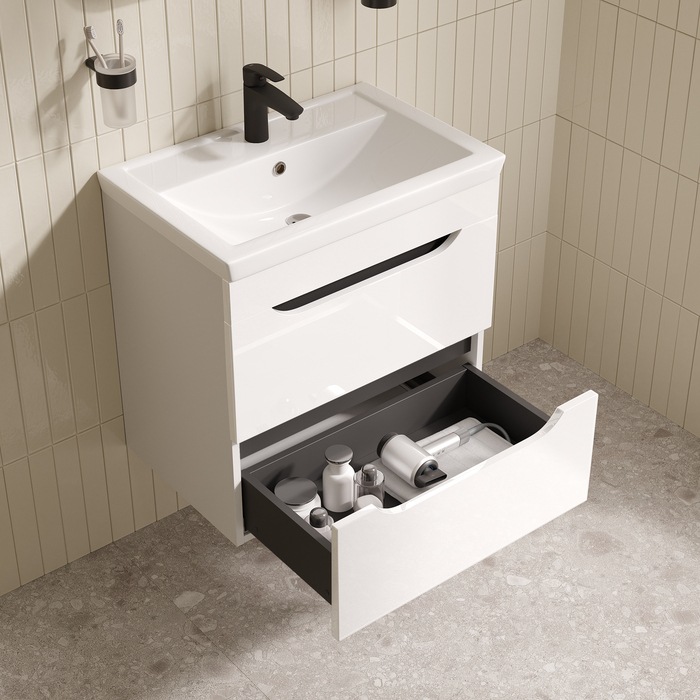 Компактная подвесная тумба для ванной Ray с умывальником и выдвижными ящиками – универсальная и практичная мебель, которая будет отлично смотреться в любом современном интерьере. Сочетание белого цвета, светло-серых элементов фасада и тёмно-серых ящиков создаёт стильный дизайн вне времени. У тумбы увеличенная высота, что делает её более вместительной и удобной.