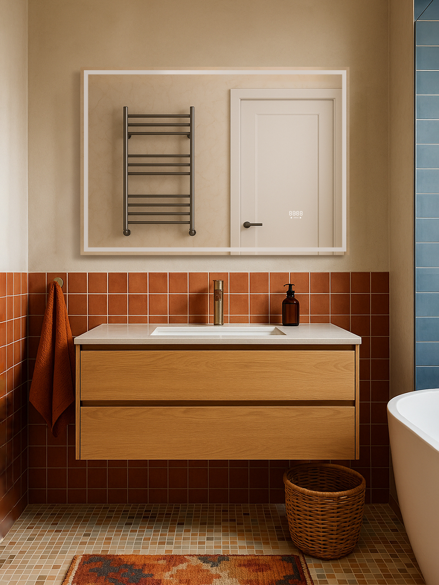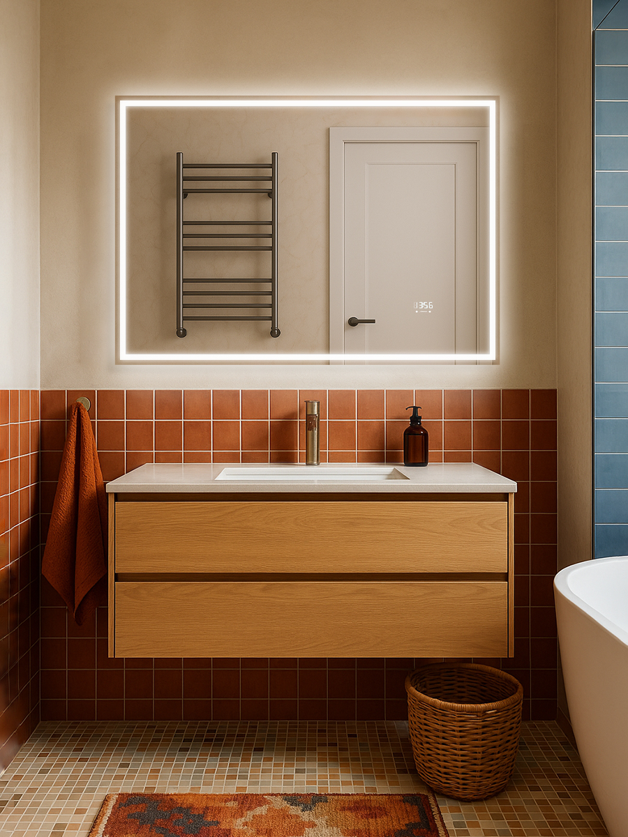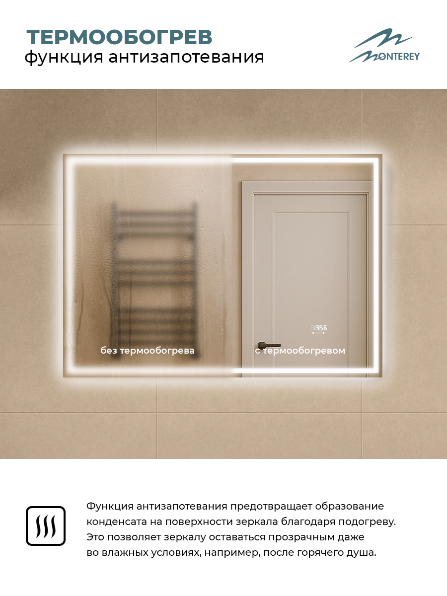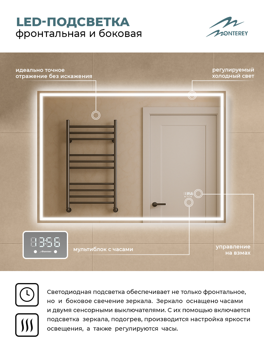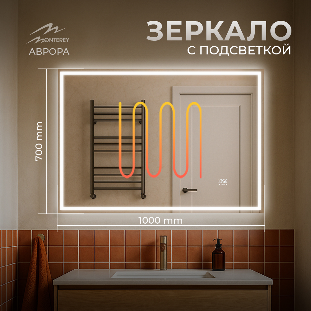 Зеркало с подсветкой, термообогревом, часами с термометром и сенсором на взмах, 100см, Аврора, Monterey
