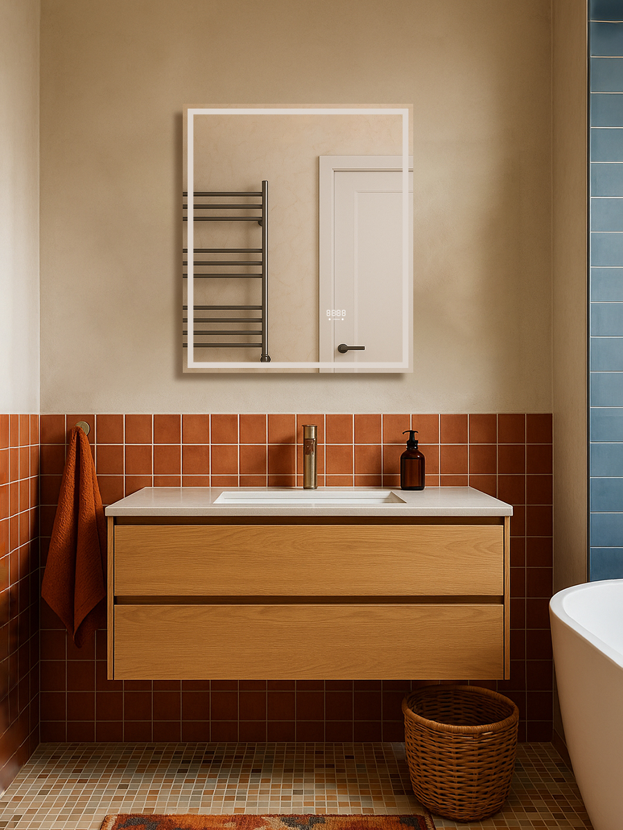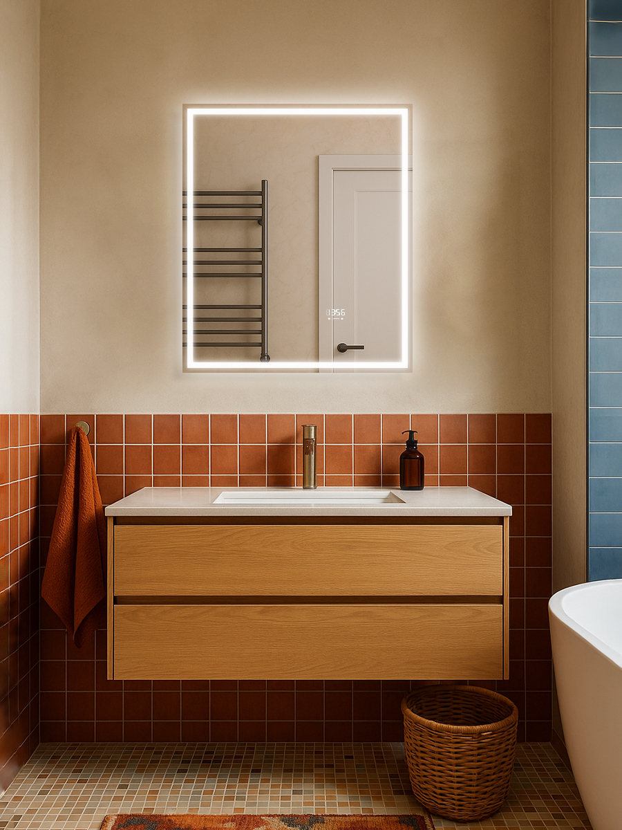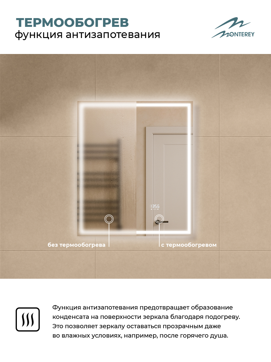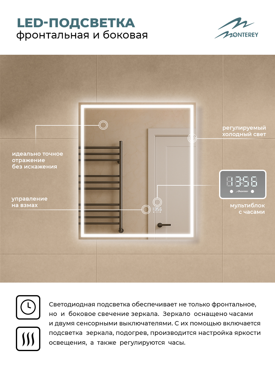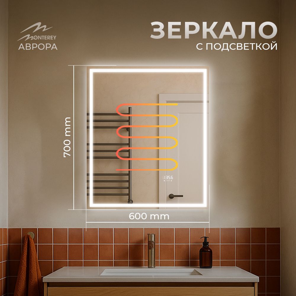 Зеркало с подсветкой, термообогревом, часами с термометром и сенсором на взмах, 60см, Аврора, Monterey
