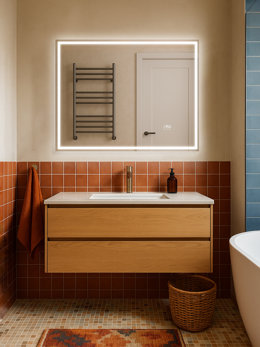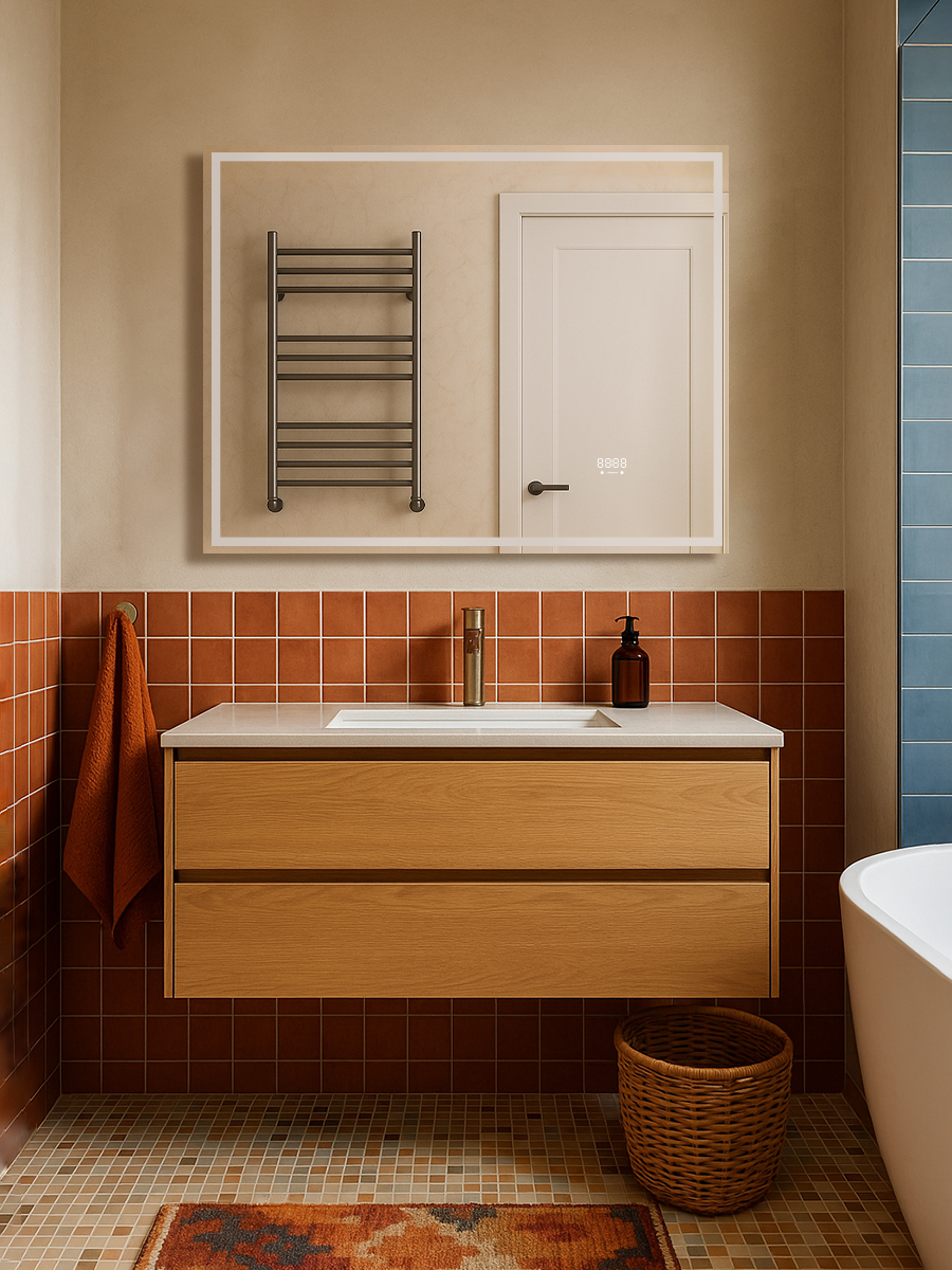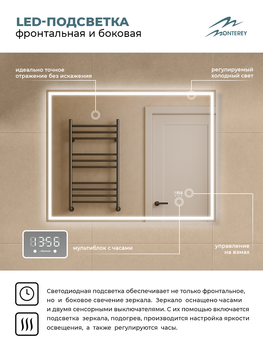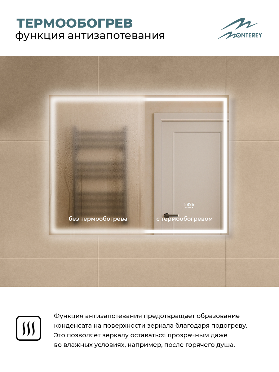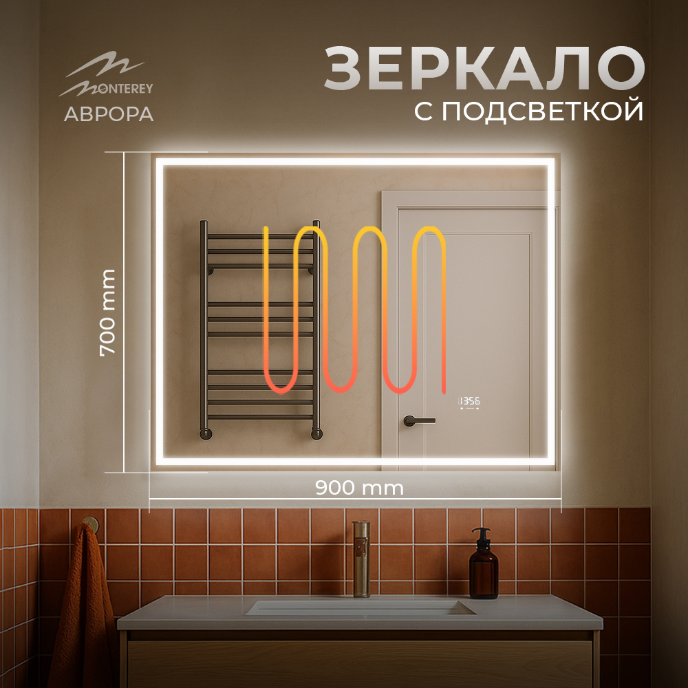 Зеркало с подсветкой, термообогревом, часами с термометром и сенсором на взмах, 90см, Аврора, Monterey