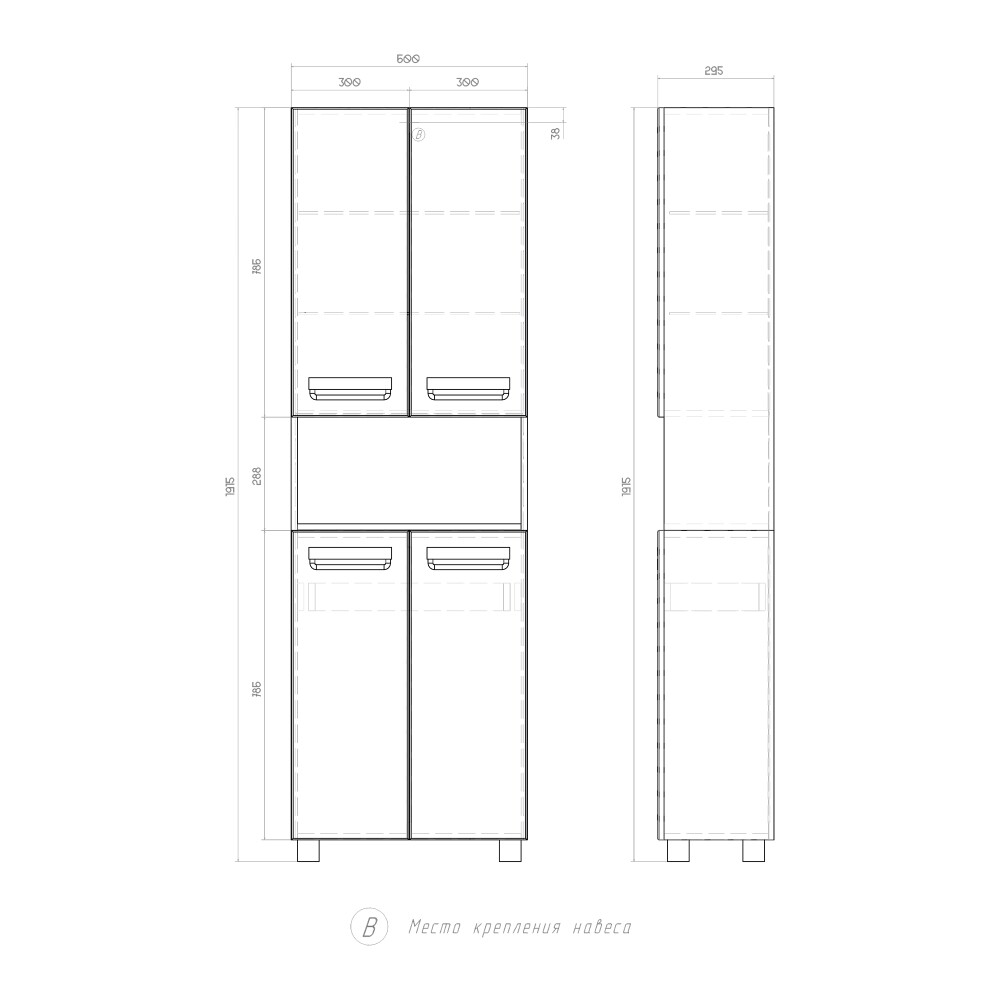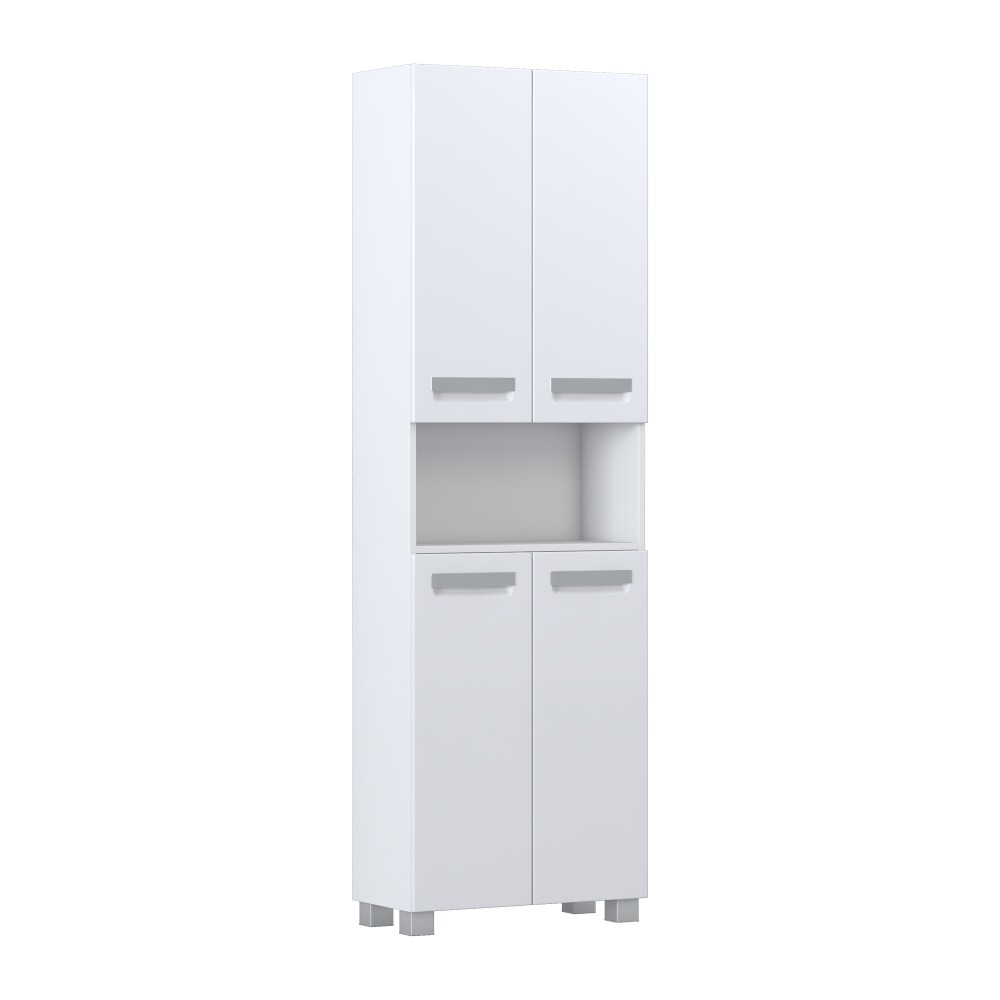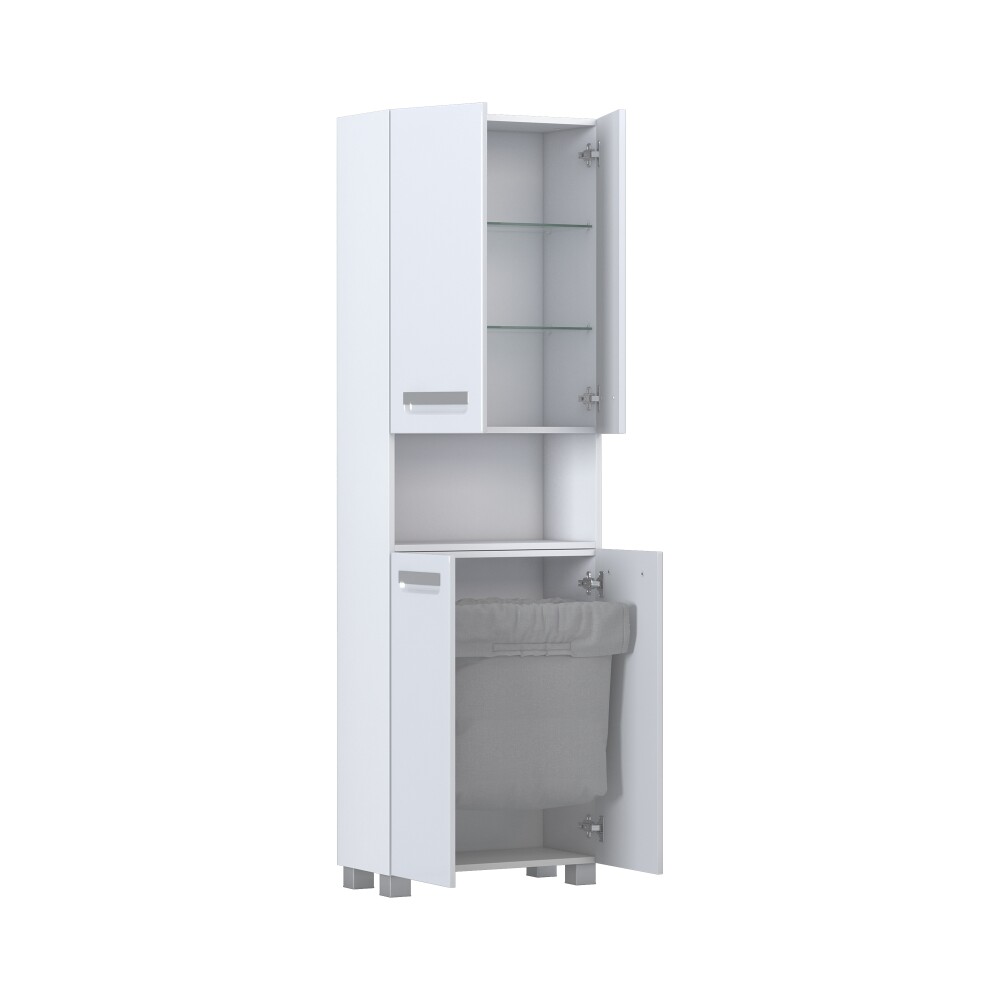 Шкаф-пенал оснащён четырьмя дверцами, внутри предусмотрены две стеклянные полки и встроенная корзина для белья, что делает модель особенно функциональной. Петли с механизмом плавного закрывания обеспечивают тихую и комфортную эксплуатацию, а врезные металлические ручки цвета матовый хром подчёркивают аккуратный дизайн. Устойчивость конструкции обеспечивают четыре регулируемые квадратные опоры, позволяющие выставить шкаф ровно даже на неровном полу.