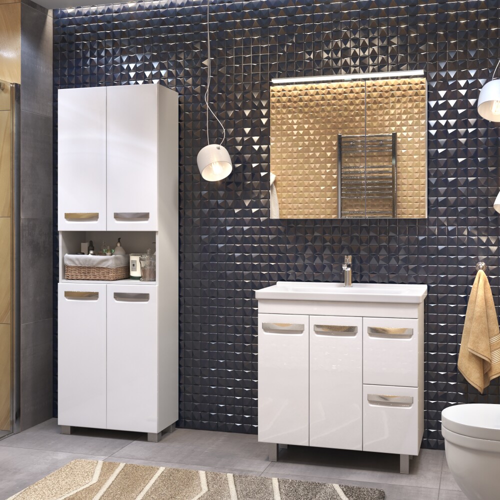 Корпус шкафа выполнен из влагостойкой ЛДСП с ламинированным покрытием, устойчивым к повышенной влажности и перепадам температуры. Фасады изготовлены из ЛМДФ с глянцевой плёнкой ПВХ, что придаёт мебели современный внешний вид и облегчает уход. Глянцевая поверхность визуально расширяет пространство и хорошо сочетается с современной сантехникой.