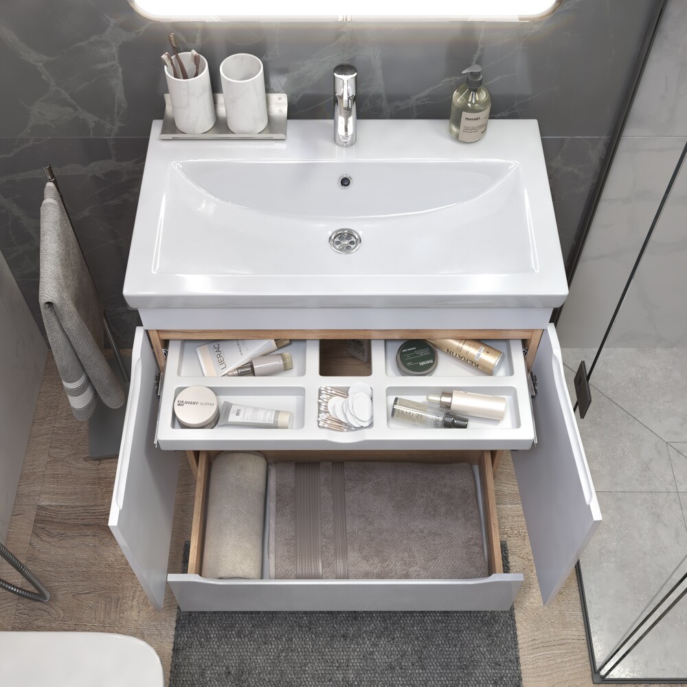 Оснащение: 2 дверцы, петли с механизмом доводчика, 1 ящик, выдвижной органайзер для мелочей, шариковые направляющие полного выдвижения, 2 опоры квадратные регулируемые; 2 кухонные опоры