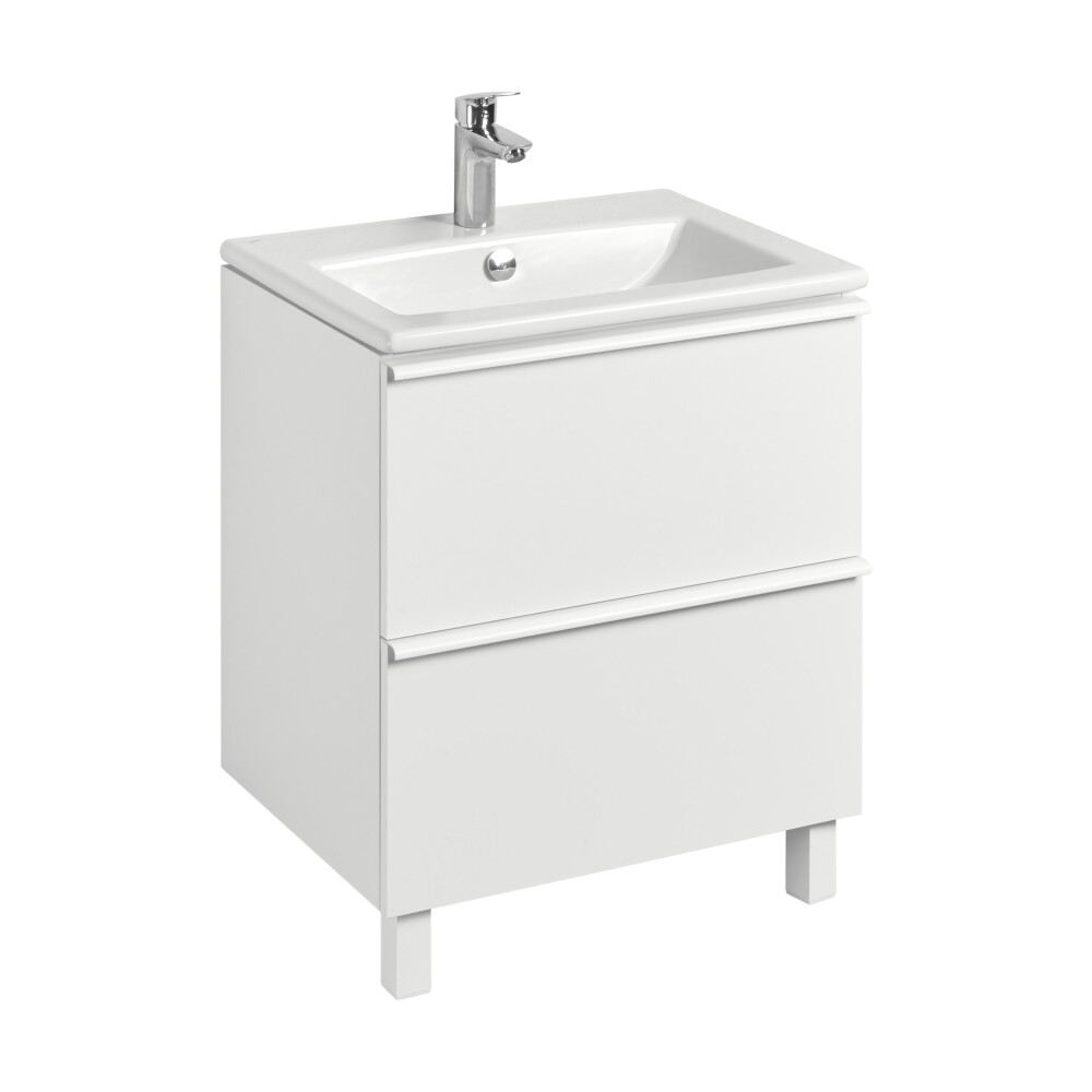 Коллекция Хюгге — это современная мебель для ванной комнаты, вдохновленная духом скандинавского уюта и простоты. Мебель изготовлена из влагостойких материалов с матовым покрытием, устойчивым к воздействию влаги и механическим повреждениям. Корпус выполнен из влагостойкой ламинированной ДСП белого цвета, а фасад выполнен из ВЛДСП в покраске белый матовый. В комплект входят белые регулируемые опоры. Открывание осуществляется за ручку во всю длину фасада с мягким закруглением. Тумбу можно комплектовать как мебельной раковиной, так и накладной на столешницу