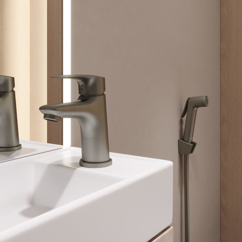 Смеситель с гигиеническим душем Rora отличается универсальным характером: основной акцент в его дизайне приходится на плавные линии корпуса. Модель в графитовом цвете одинаково выигрышно смотрится на контрастных белоснежных раковинах и дополняет собой керамику темных оттенков.