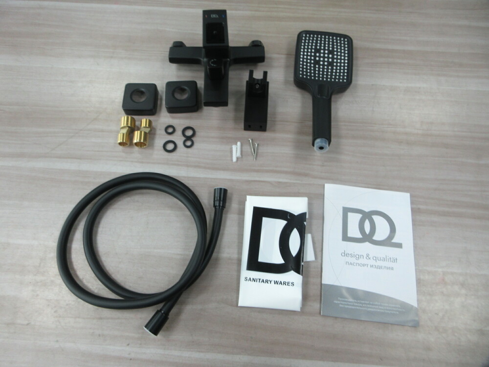 Смеситель. эксцентрики-2шт. декоративная шайба (отражатель)-2шт. шланг душевой 1.5м PVC. лейка душевая 3 режима. держатель душевой лейки. паспорт изделия. брендовый пакет