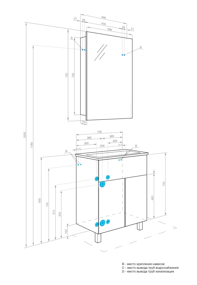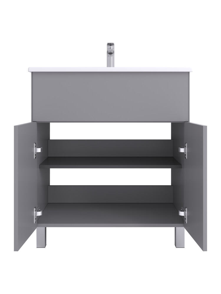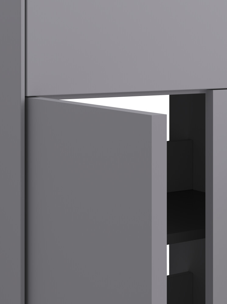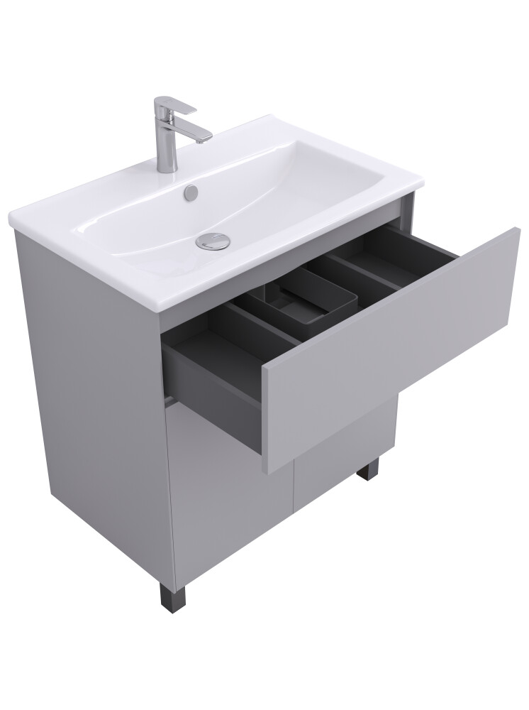 Тумба - 1шт. Регулируемый навес - 2. регулируемые ножки- 2. регулируемая полка - 1. ящик (направляющие с интегрированной системой Push to open) -1. фасад-створка - 2. планки разделения пространства ящика - 2