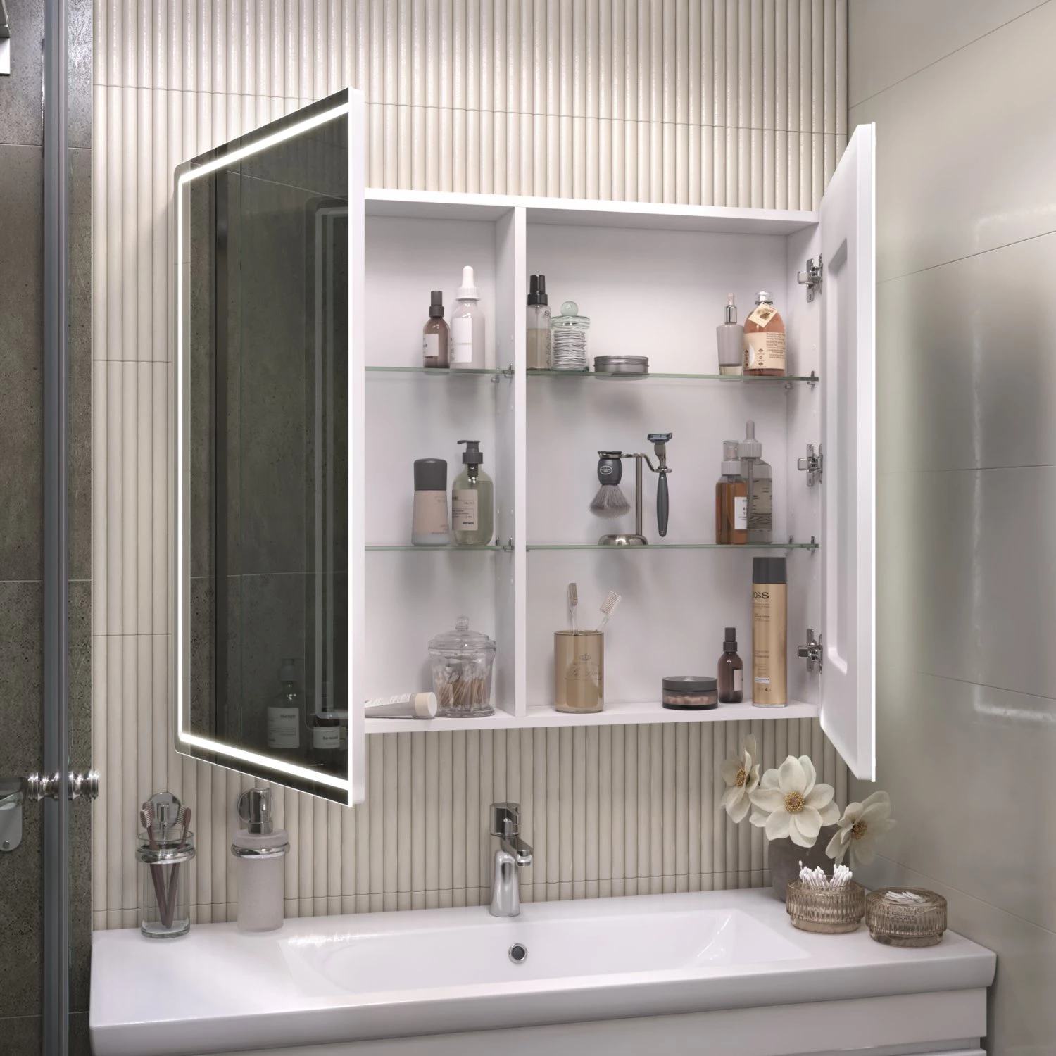 Комплектация: 2 дверцы. петли с механизмом доводчика. 4 стеклянных полки. светодиодная подсветка по периметру. бесконтактное включение (на взмах). функция антизапотевания