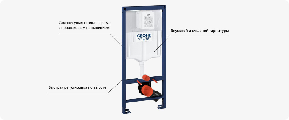 GROHE Rapid SL — инновационная система инсталляции для подвесного унитаза, которая включает всё необходимое для быстрой и надёжной установки. Стальная рама обеспечивает прочность и эстетичный вид конструкции.