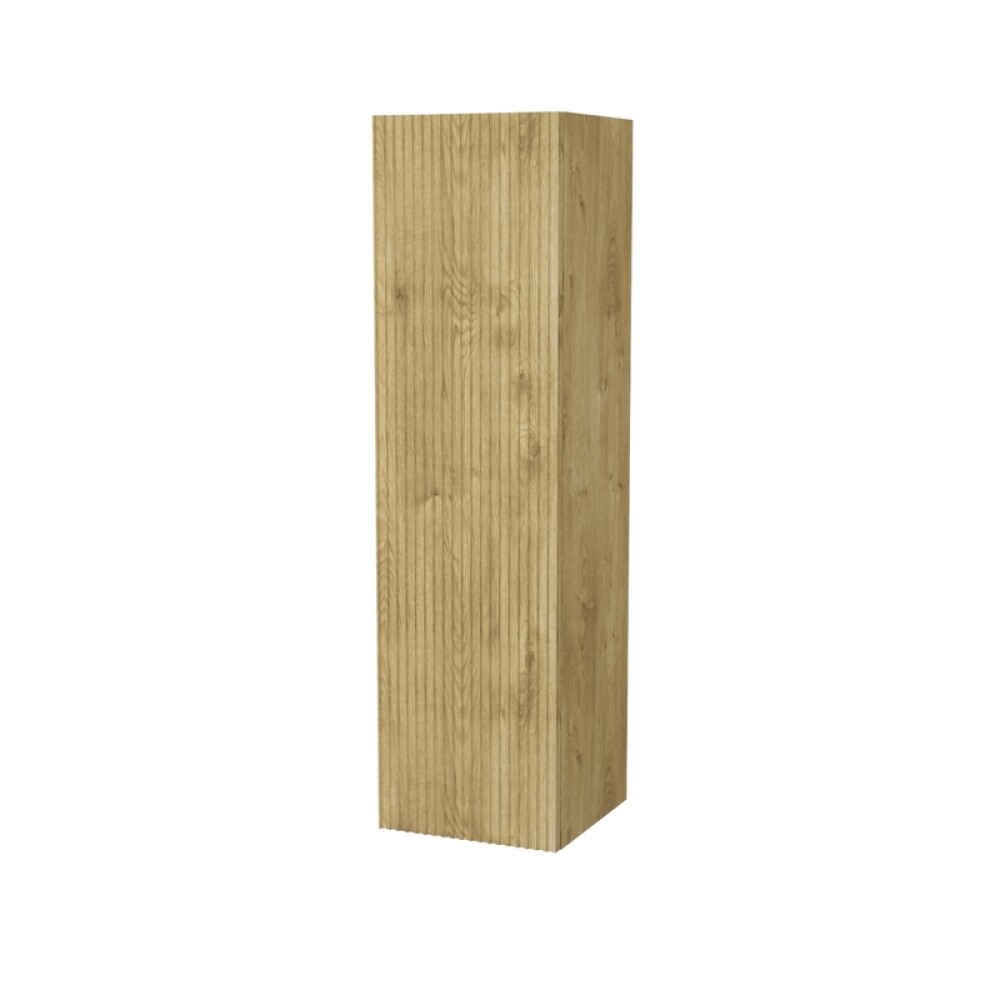 Подвесной пенал для ванной комнаты Bild – красивый дизайн со структурной вертикальной фрезеровкой в сочетании с теплым оттенком дуба, удобством и практичностью. Универсальная ориентация: пенал можно подвесить так, чтобы дверки открывались в удобную вам сторону (пенал можно перевернуть на 180 градусов, при этом перевешивать дверцы не нужно).